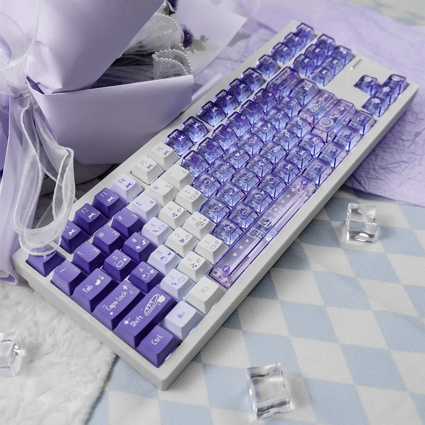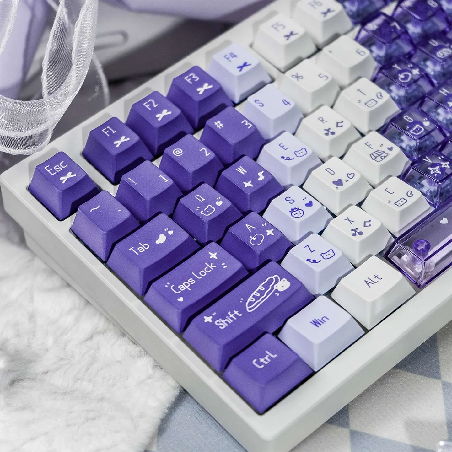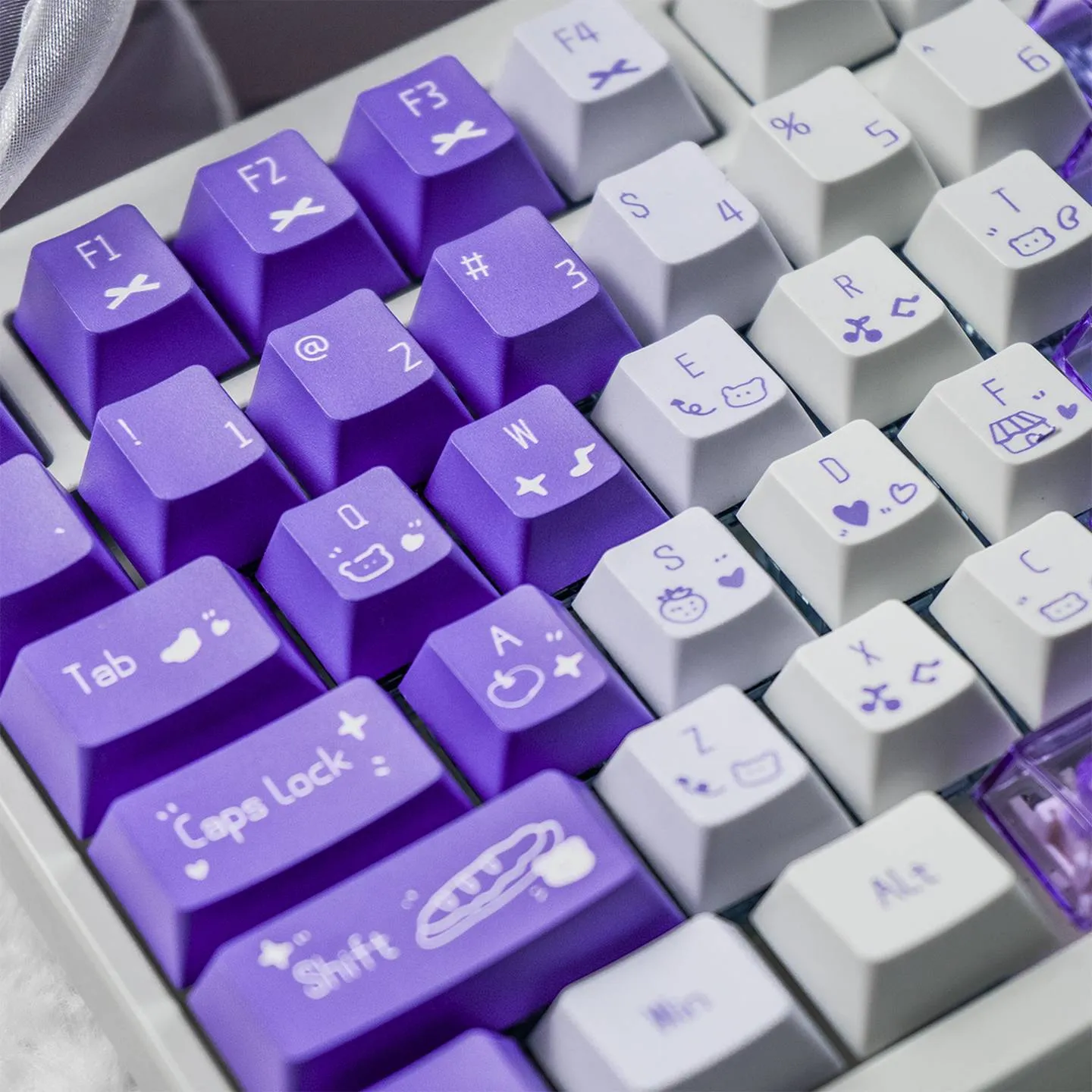 Transform your keyboard with the Adorable Gradient Purple OEM Keycap Set! This charming collection features a delightful blend of light purple, purple, and white keycaps for a whimsical look. The striking white and purple lettering ensures easy readability while enhancing visual appeal. Each keycap boasts playful designs like houses, musical notes, strawberries, and cherries. Crafted from premium PBT and PC materials, this set guarantees durability and a fun typing experience, perfect for gamers and creative minds alike!