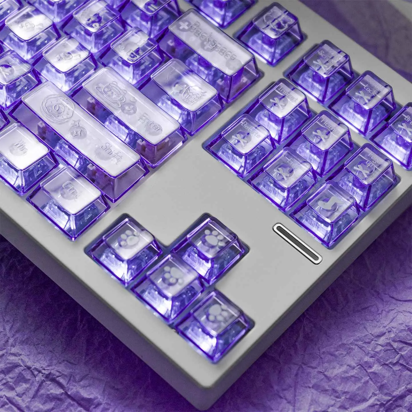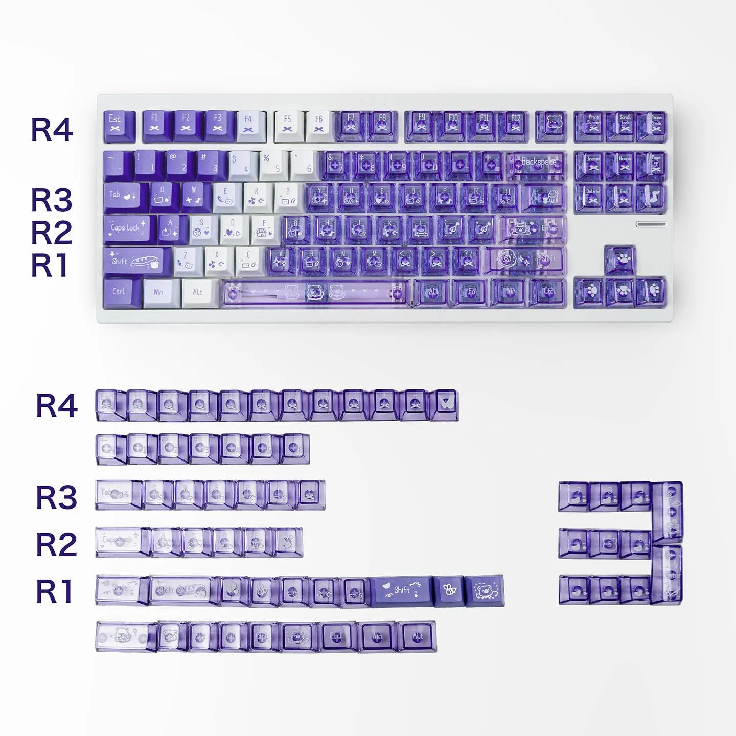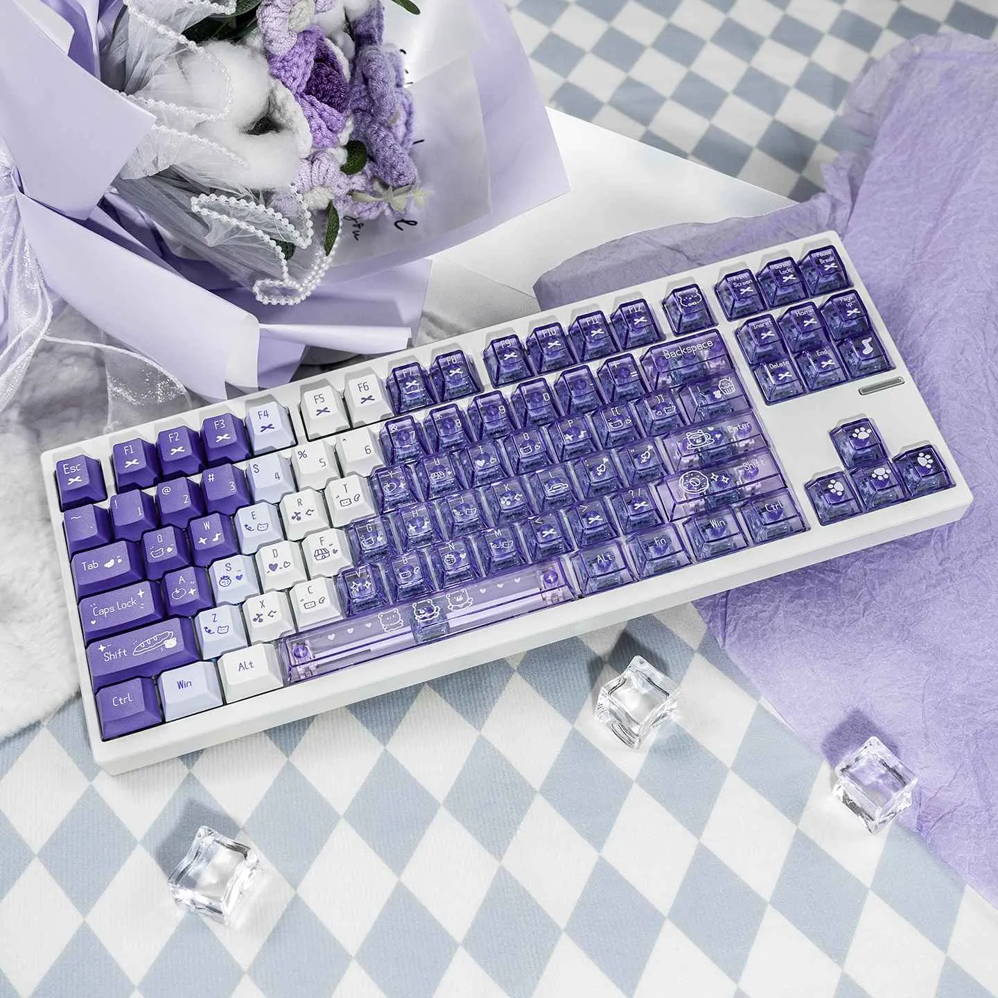 Transform your keyboard with the Adorable Gradient Purple OEM Keycap Set! This charming collection features a delightful blend of light purple, purple, and white keycaps for a whimsical look. The striking white and purple lettering ensures easy readability while enhancing visual appeal. Each keycap boasts playful designs like houses, musical notes, strawberries, and cherries. Crafted from premium PBT and PC materials, this set guarantees durability and a fun typing experience, perfect for gamers and creative minds alike!