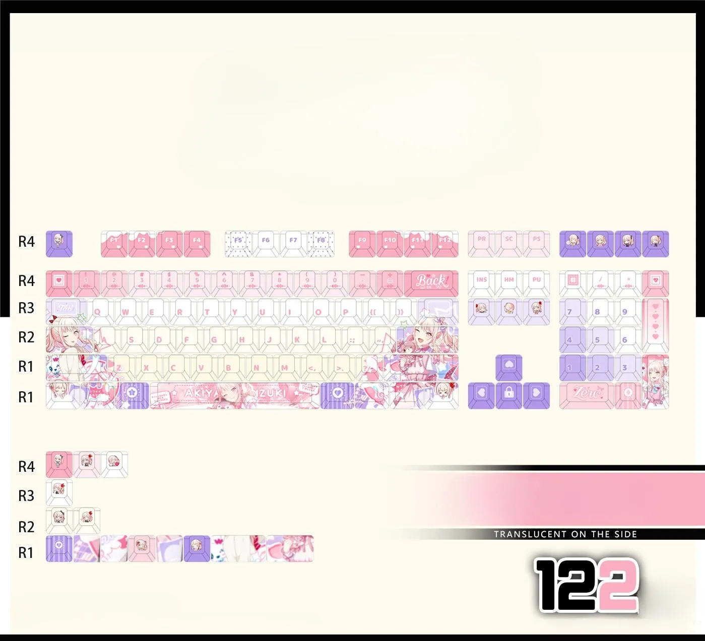 Elevate your typing experience with the Project SEKAI COLORFUL STAGE!: Akiyama Mizuki Cherry Keycap Set & Mechanical Keyboard! Front-Lit, Side-Lit and Opaque are three gorgeous keycap styles with five possibilities each. Choose from keyboards with 87 or 108 keys including tri-mode models or a flexible keycap set with 122 keys. Pink, white and purple letters in a distinctive font style. Which may be found in the lovely mix of white, pink, light yellow and purple keycaps. A lot of keycaps have adorable character icons such as the Space and ESC keys. While the directional keys include heart and lock motifs. These products are made of sturdy PBT in a traditional Cherry profile!