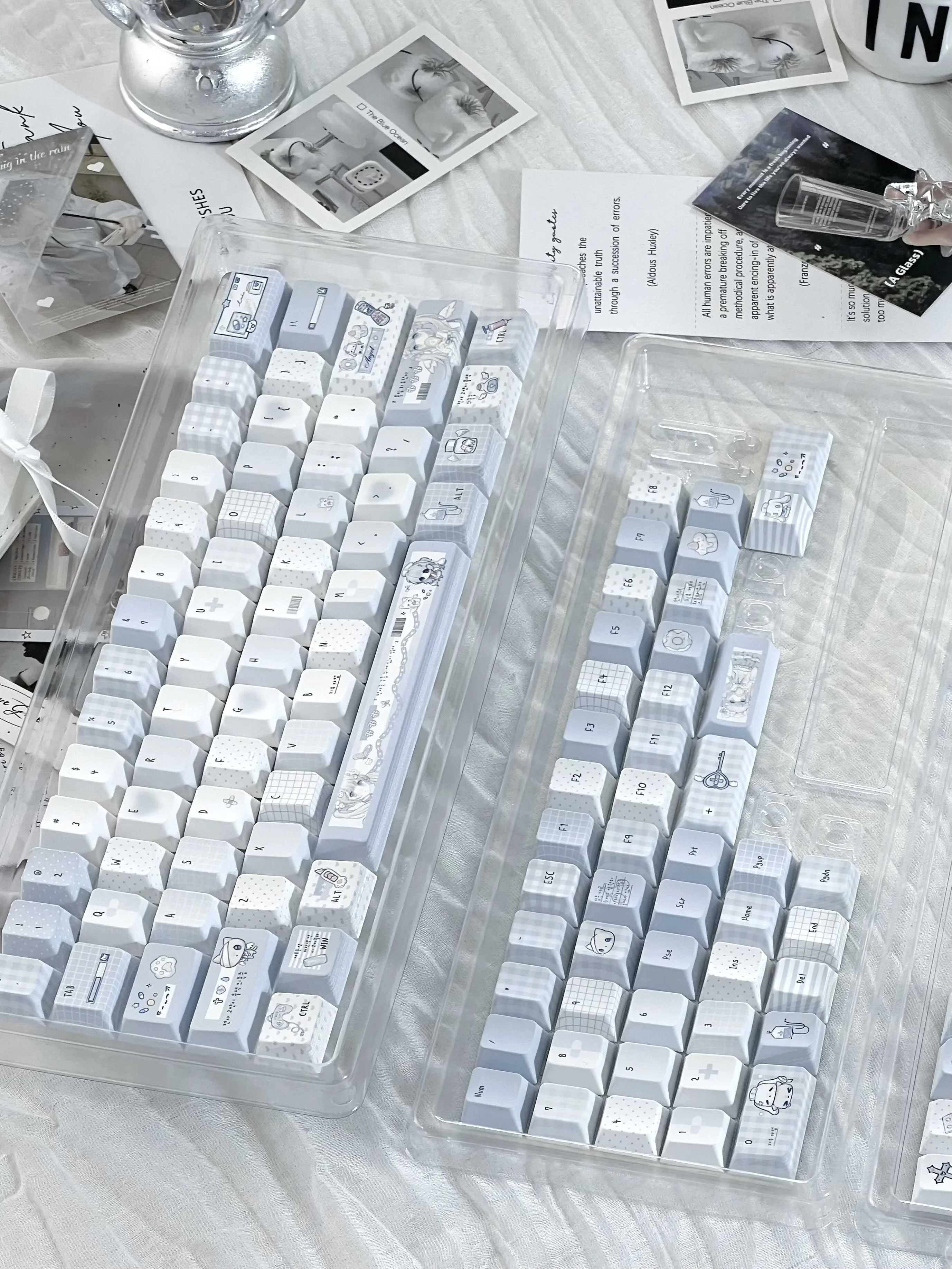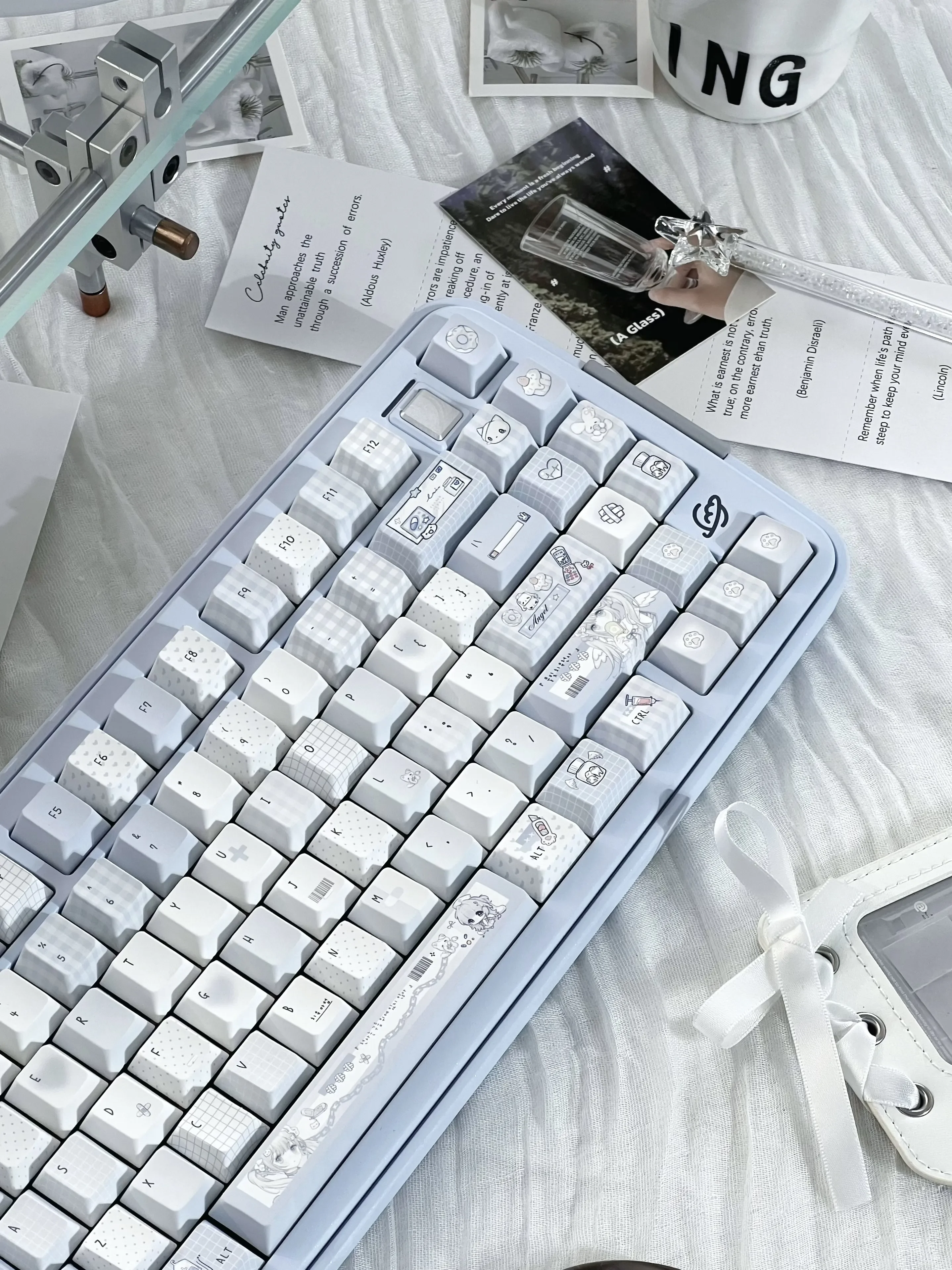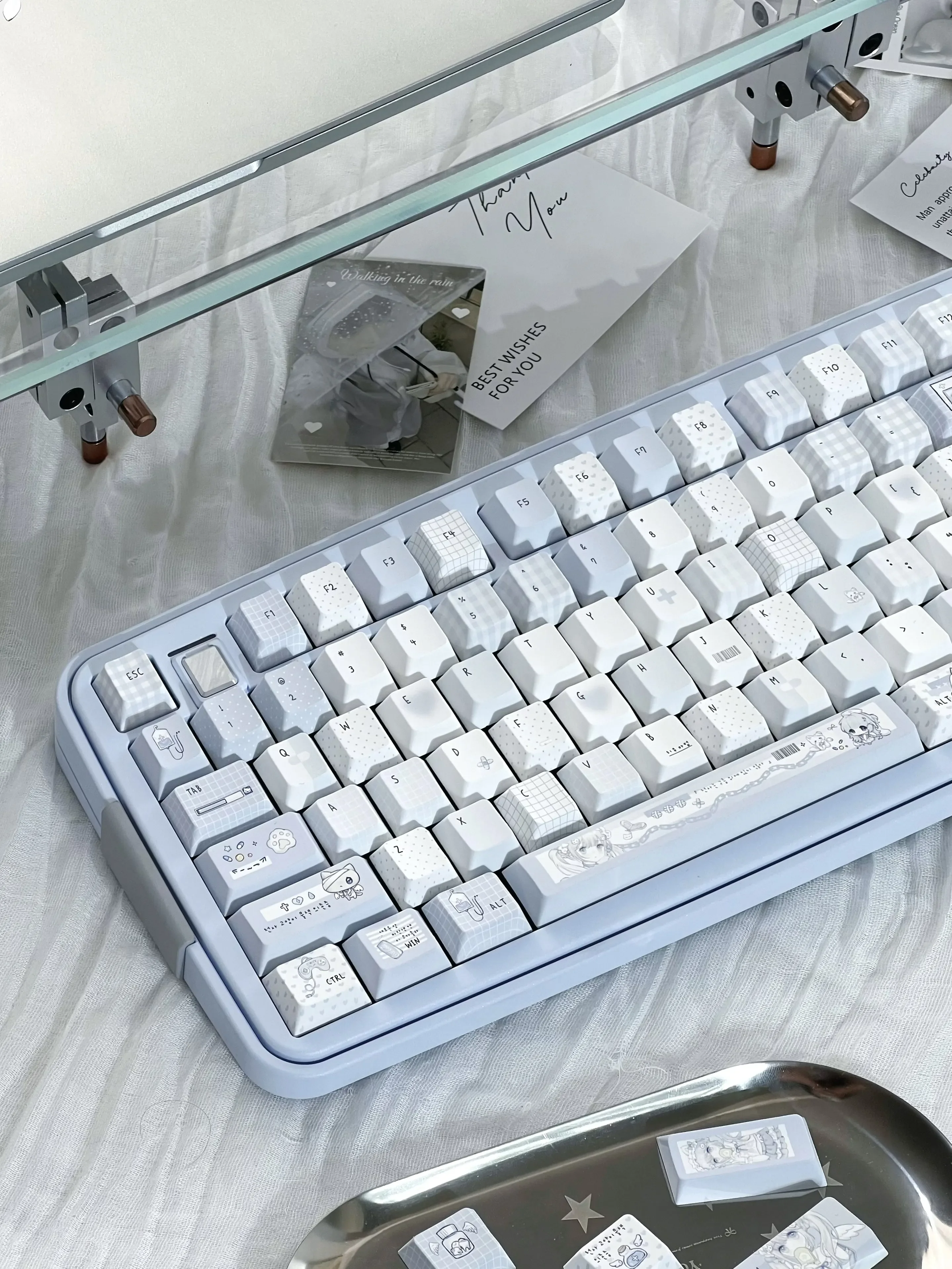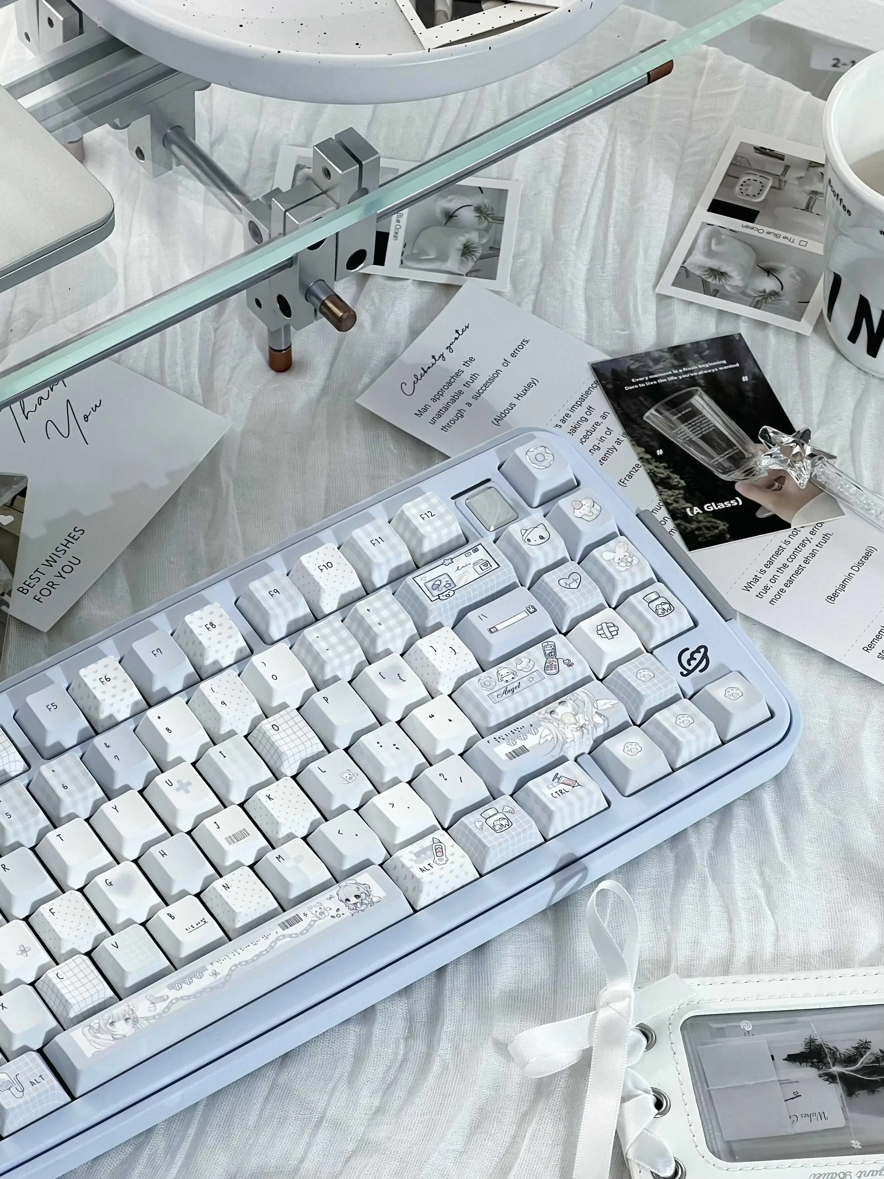Discover a new realm of keyboard aesthetics with the Aqua Angel Cherry Keycap Set, designed to infuse your workspace with ethereal serenity and playful charm. These exquisite Aqua Angel PBT Keycaps boast unparalleled durability, crafted from high-quality PBT material to withstand the rigors of daily use while maintaining their pristine appearance. The angelic design, rendered through an exquisite five-sided dye-sublimation process, ensures that every detail, every subtle blue hue, is permanently etched onto the surface, resisting fade and wear. As a complete Cherry profile keycap set with 131 keys, it offers broad compatibility for various mechanical keyboard layouts, inviting you to personalize your setup with ease. Experience the delight of these cute blue keycaps, turning your keyboard into a captivating art piece and a source of calm inspiration. Perfect for creative personalization and collection, these dye-sub PBT keycaps promise a premium typing experience with an unmatched visual theme.