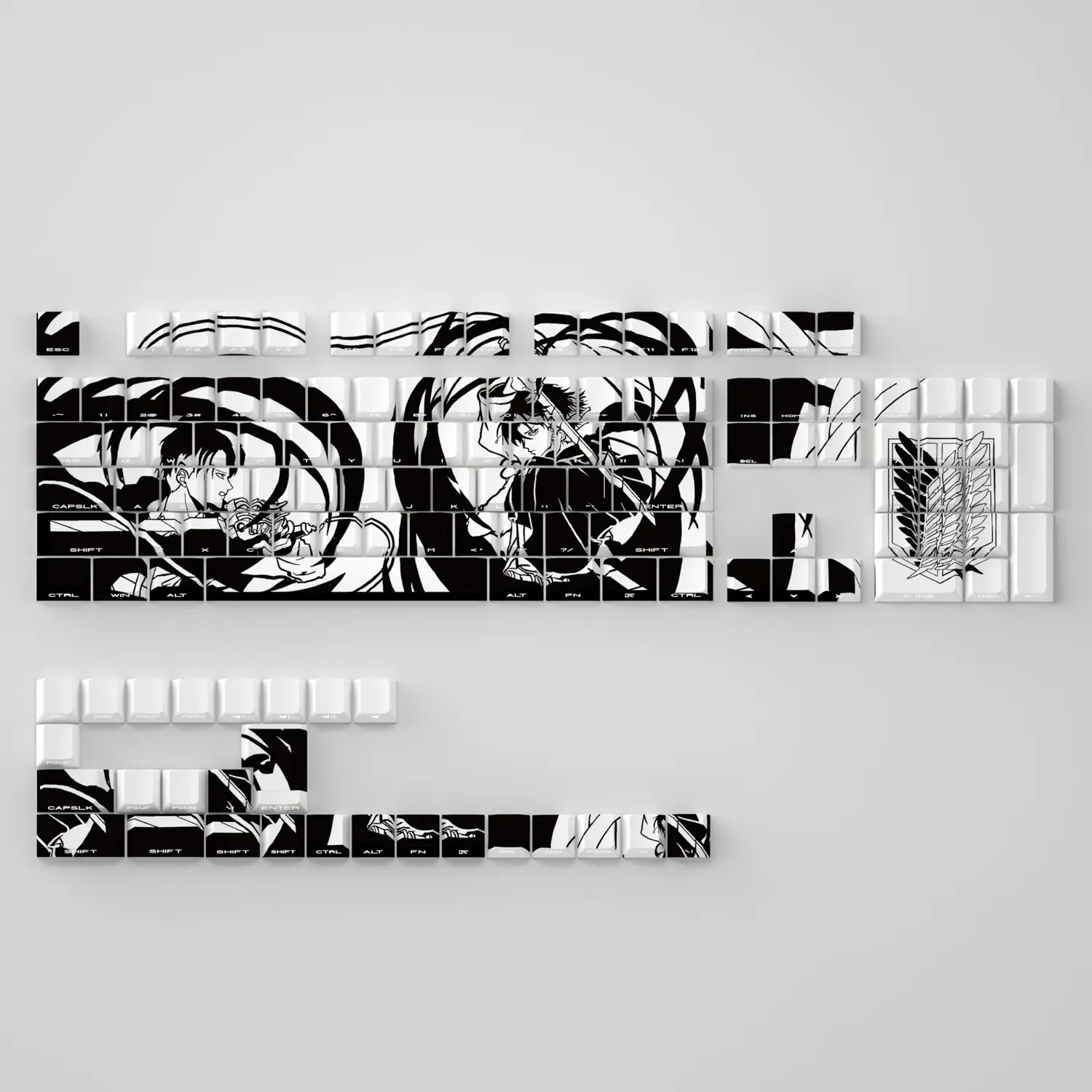 Transform your mechanical keyboard into an immersive Attack on Titan tribute with our exclusive Levi Ackerman Cherry Keycap Set. Channel the relentless spirit of humanity’s strongest soldier as you game or work. These stunning Attack on Titan Keycaps feature an iconic Levi Ackerman design, meticulously crafted to capture every detail. Made from high-quality PBT material, this Anime Keycap Set offers superior durability and a satisfying typing feel, ensuring legends wont fade over time. The innovative side-engraved legends are specifically designed to optimize backlighting, creating a visually striking effect that enhances your setups aesthetic. With a universal Cherry Profile, these Gaming Keycaps provide ergonomic comfort and broad compatibility. Perfect for both avid gamers seeking an edge and collectors looking to elevate their display, this 130-piece set promises an unparalleled level of excitement and immersion.