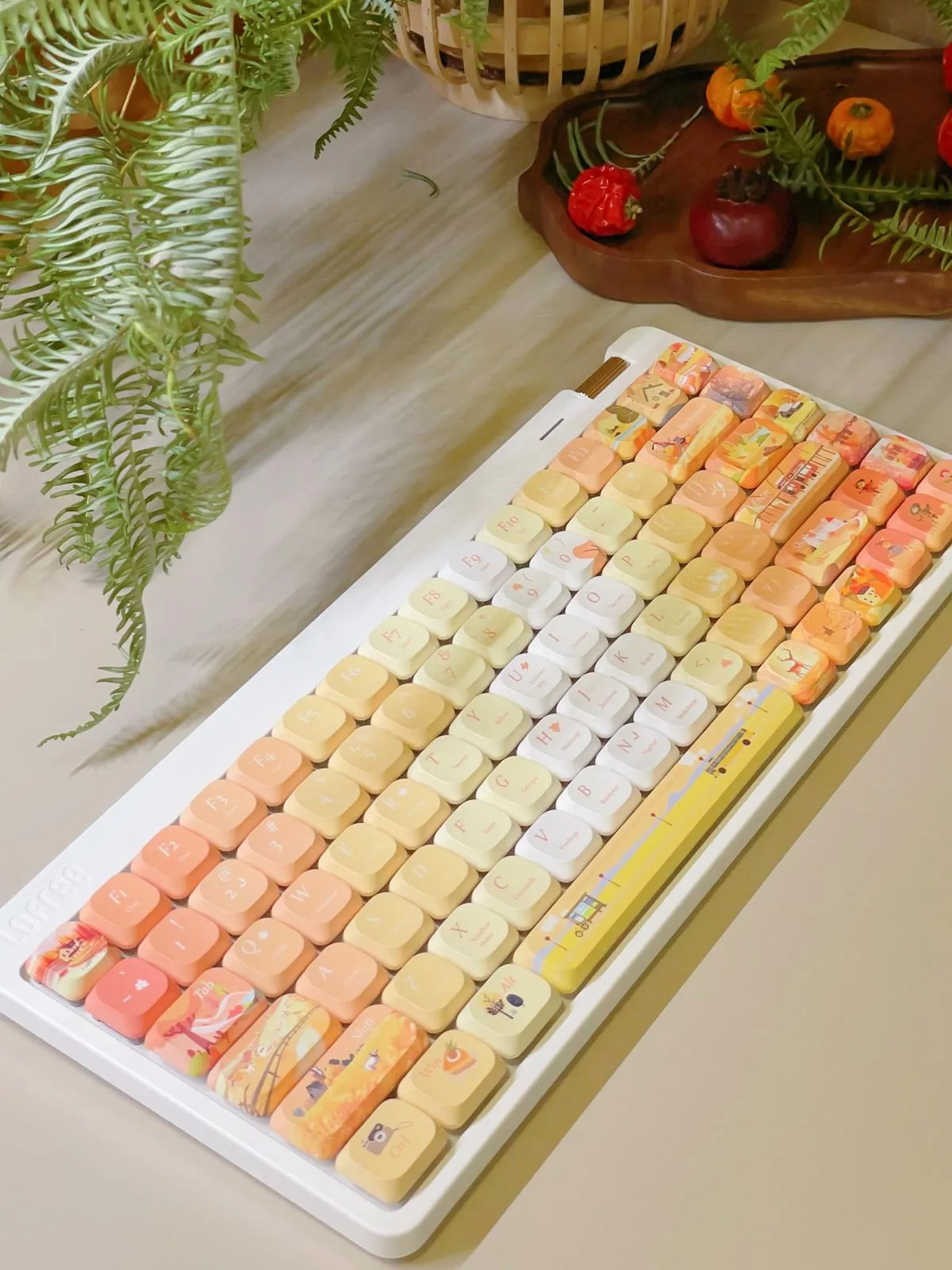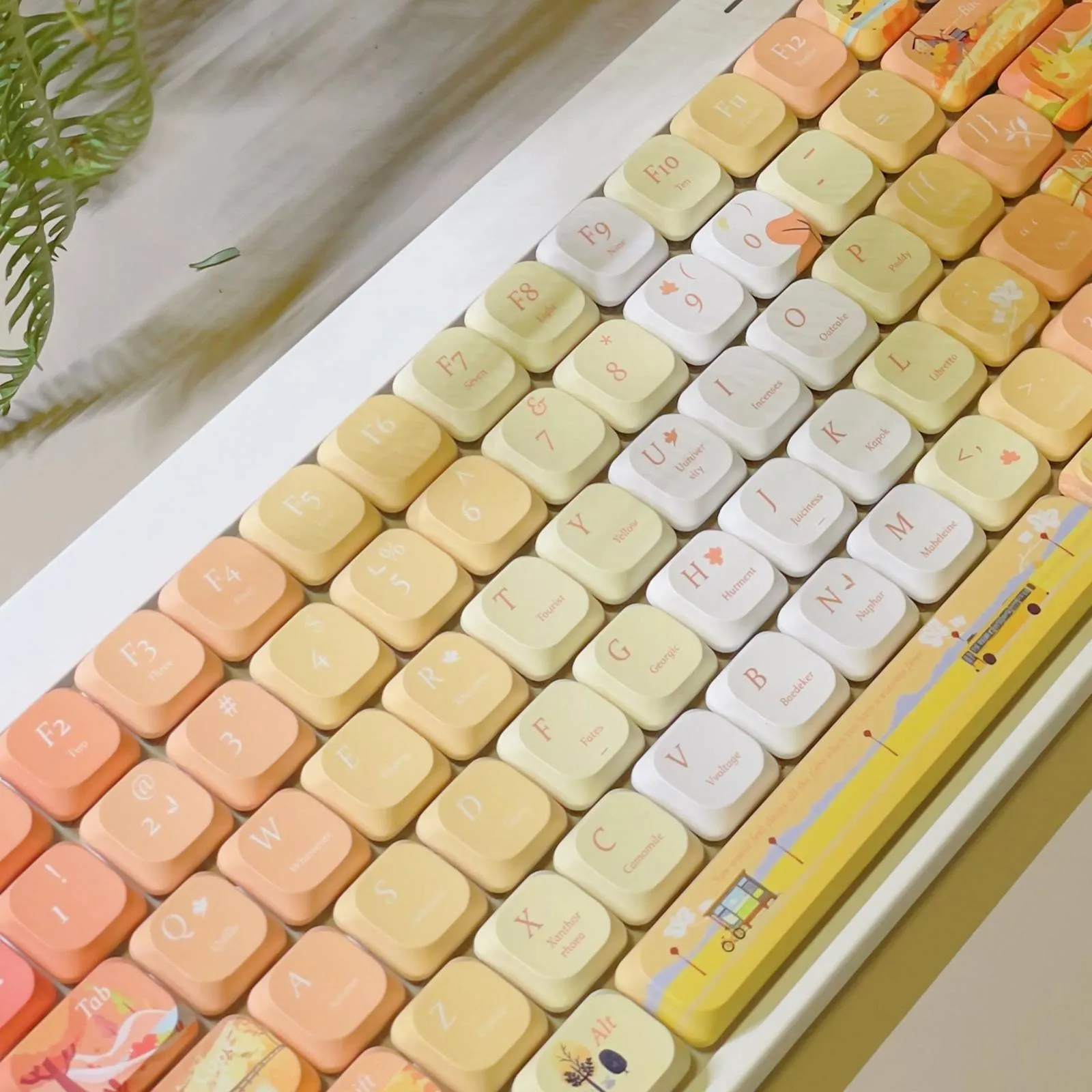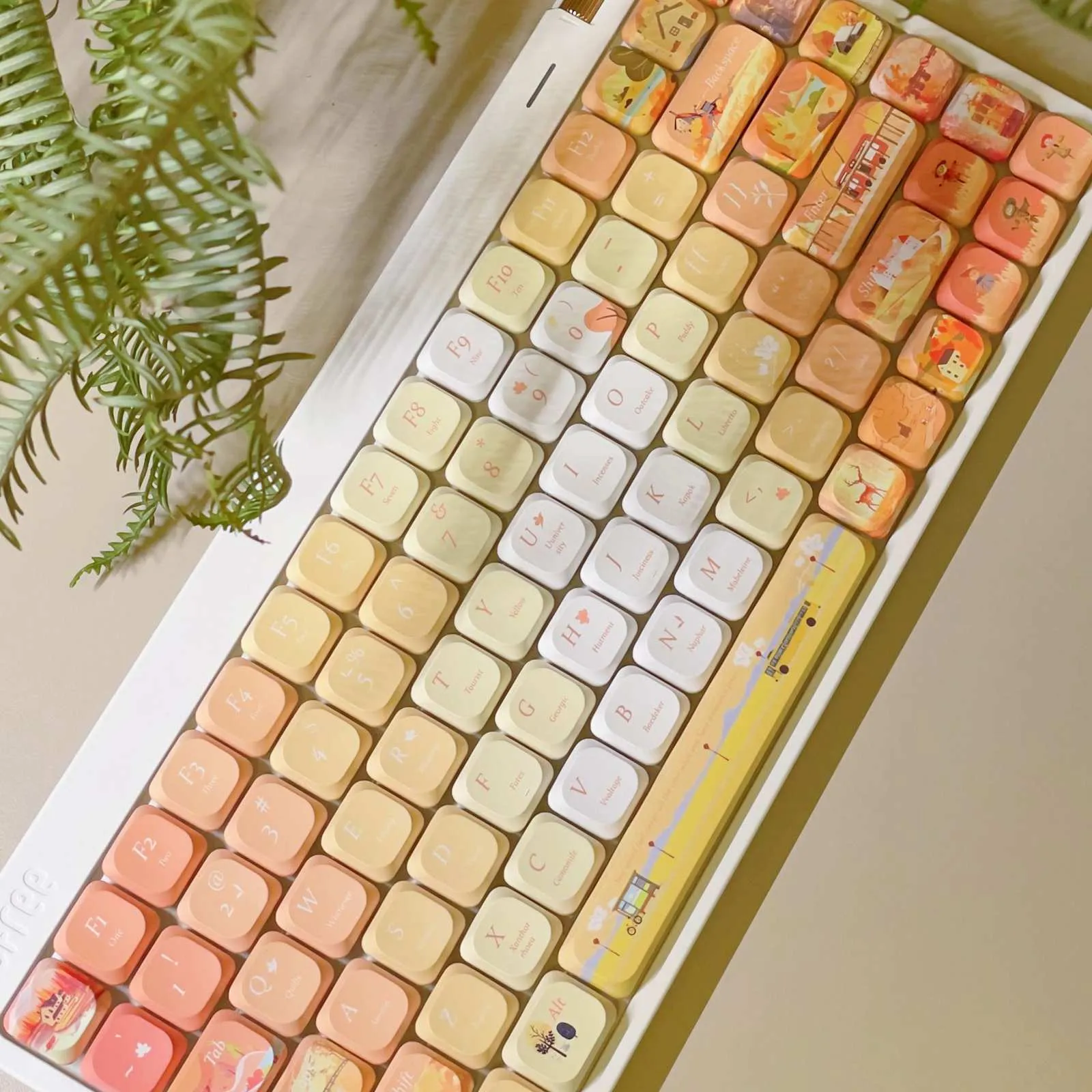 Transform your keyboard with the stunning Autumn Maple Walkers ADA Keycap Set! This colorful collection is ideal for enjoying the fall season. Because it has a lovely mix of orange, yellow and white keycaps. With its endearing tree image on the Tab Key puts nature at your fingertips. A whimsical bus emblem adorns the Space Key, conjuring up images of autumnal trips. The conventional directional arrows are replaced with distinctive scarecrow icons. Which give your typing experience a comical twist. The entire appearance is improved by the striking orange and white lettering in a unique font style that is used on each key. This keycap set which is made of sturdy PBT material. That guarantees that every keystroke is enjoyable!
