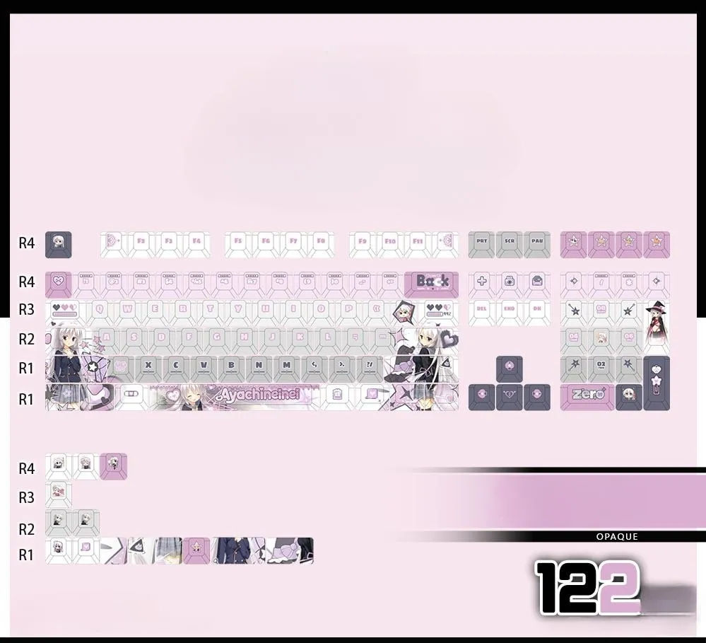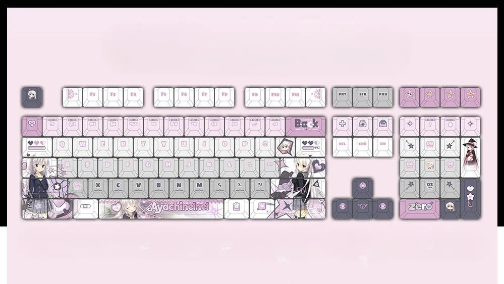 Upgrade your typing with the Sabbat of the Witch: Ayachi Neinei OEM Keycap Set & Mechanical Keyboard! This vibrant collection offers 15 options, including opaque, side-lit, and front-lit keycaps, with configurations of 122, 87, or 108 keys. The light pink, purple, white, and dark purple keycaps feature unique lettering against a grey base. Adorable heart-shaped designs and character icons add charm, while the Space Key proudly displays “Ayachineinei.” Made from durable PBT, this set is perfect for fans!