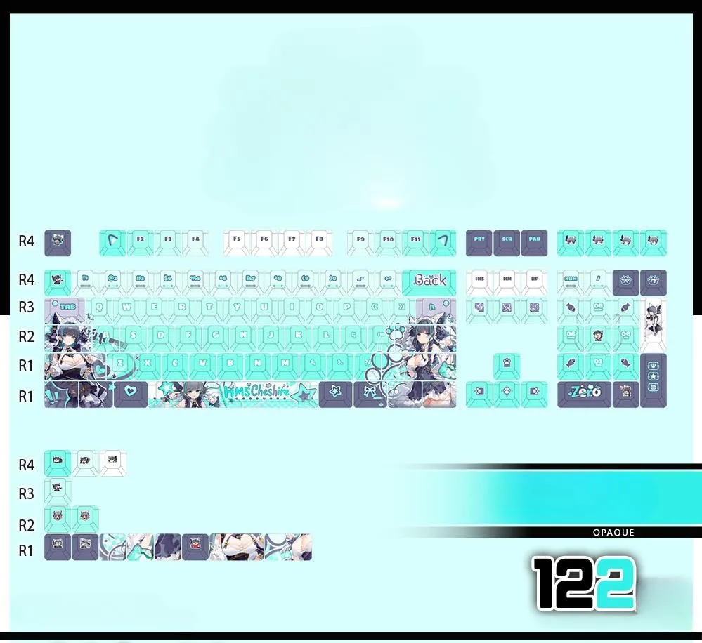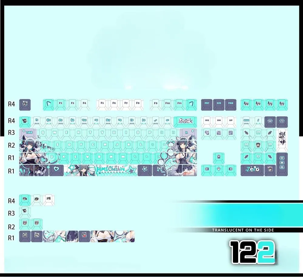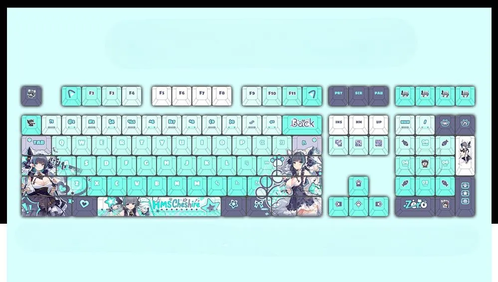 Elevate your typing experience with the captivating Azur Lane: Cheshire Cherry Keycap Set & Mechanical Keyboard! The three keycap styles in this collection—Front-Lit, Side-Lit and Opaque that each have five options. Which including keyboards with 87 or 108 keys and a Keycap Set with 122 keys. Tri-Mode options increase each user’s adaptability. White and grey keycaps look great with the striking Tiffany blue series base. Which highlights text in a distinctive font style. Many keycaps feature character icon designs such as the ESC Key and a cute icon on the Space Key. This set is ideal for both fans and collectors because it is made of sturdy PBT. That features a classic Cherry profile.