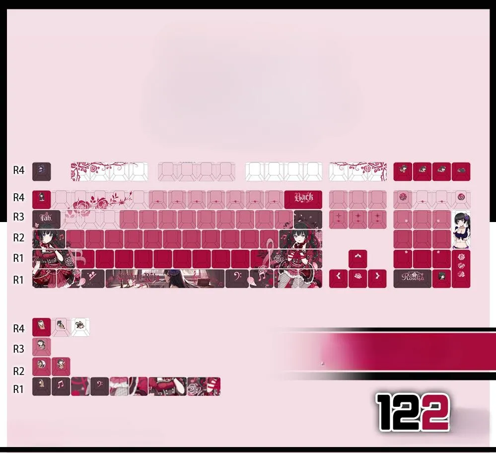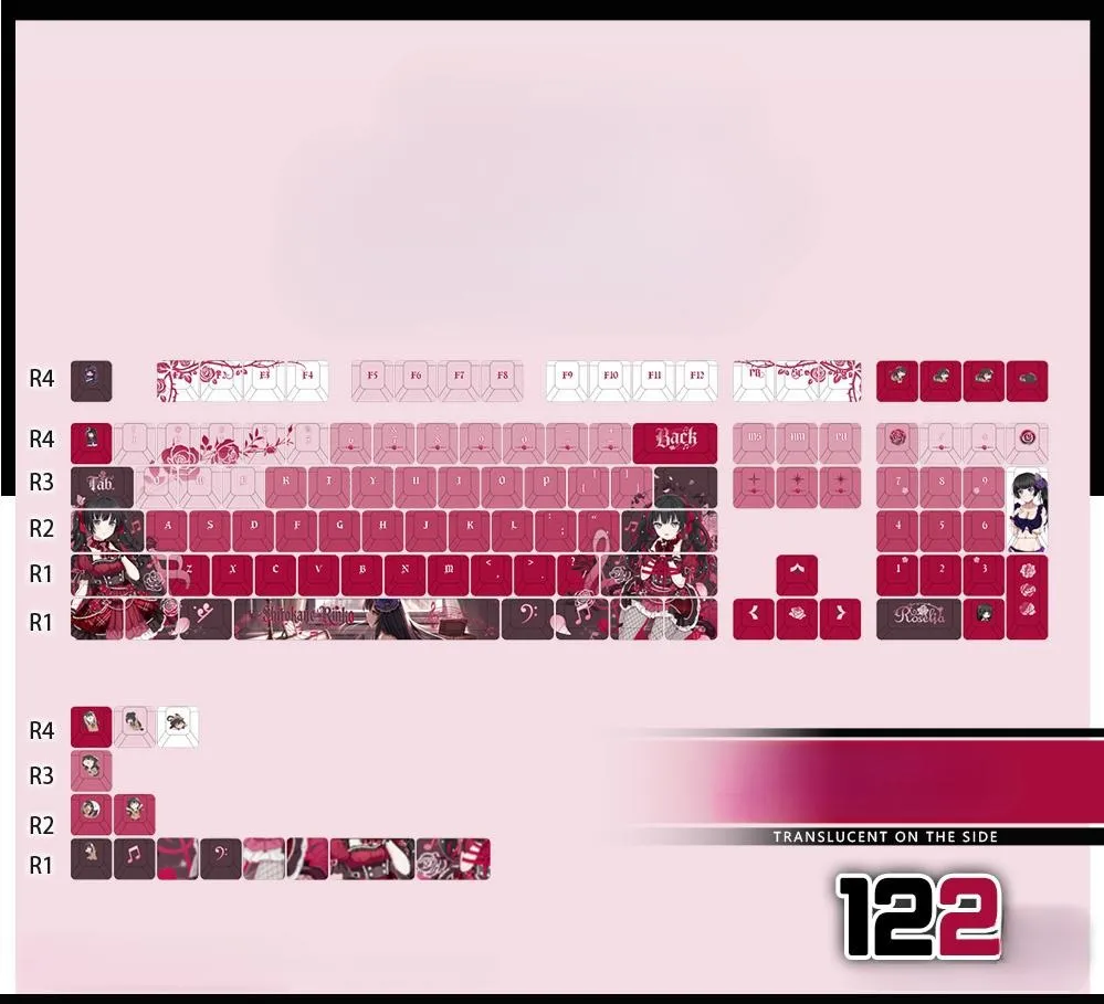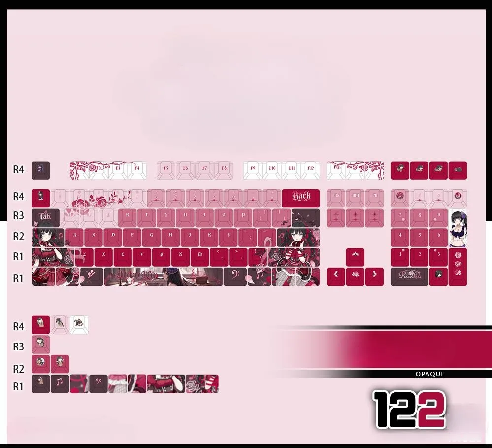 Immerse yourself in the vibrant world of BanG Dream! with the Shirokane Rinko Cherry Keycap Set & Mechanical Keyboard! Each of the three keycap styles in this alluring collection—Front-Lit, Side-Lit and Opaque—offers five distinct choices. 122-key sets, 87-key keyboards, Tri-Mode options and 108-key models are among the configurations available. A gorgeous visual appeal is produced by the tasteful blend of maroon, red, pink and white keycaps. Your typing experience is improved with each keycap’s eye-catching red, pink and white letters in a unique font. The layout is adorned with elegant character icons. While the Space Key proudly shows “Shirokane Rinko.” This set is ideal for fans because it is made of sturdy PBT and features a traditional cherry profile!