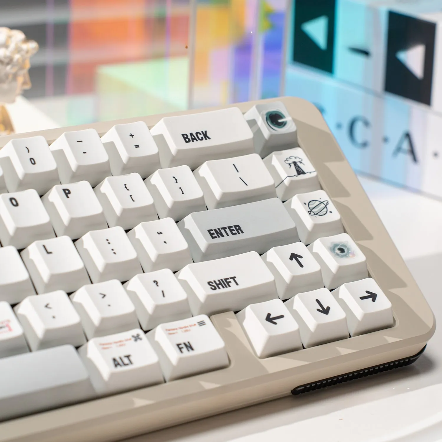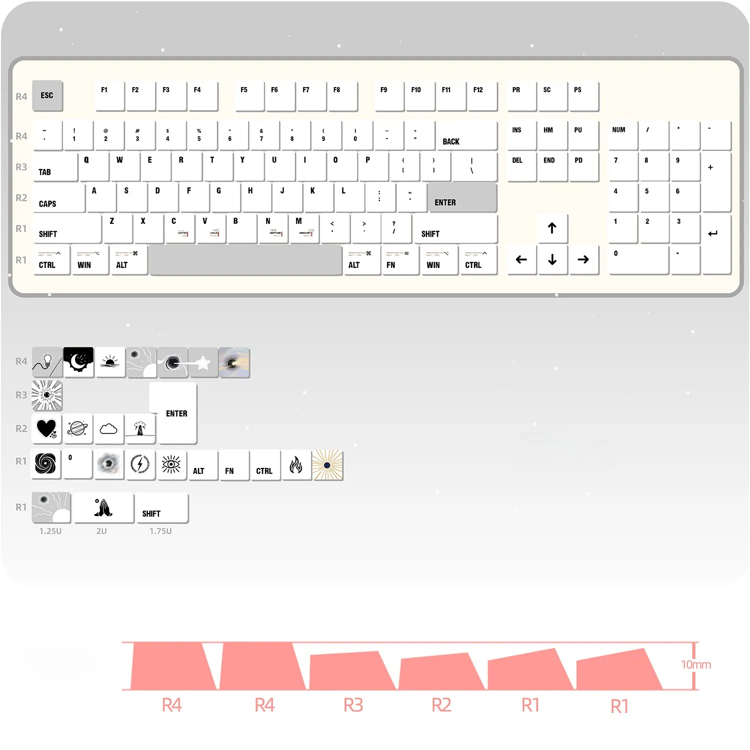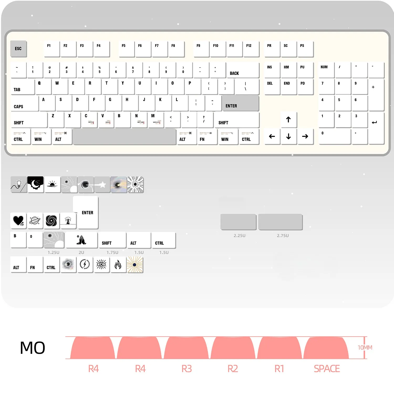 Illuminate your typing experience with the Brightness Series Keycap Set! Each of the four options in this adaptable collection. Which are divided into OEM and MO sets that comes in either bag or box packaging. This set produces a sophisticated visual style with its sleek white base and sophisticated grey keycaps. Some keycaps give your keyboard a cosmic flair by featuring quirky icons of the sun, moon and planets. The unique font style and black letters on each keycap add flair and readability. These keycaps are made from sturdy PBT material. That are intended to endure regular use without losing their gorgeous hues. Use the Brightness Series Keycap Set to add some color to your workstation!