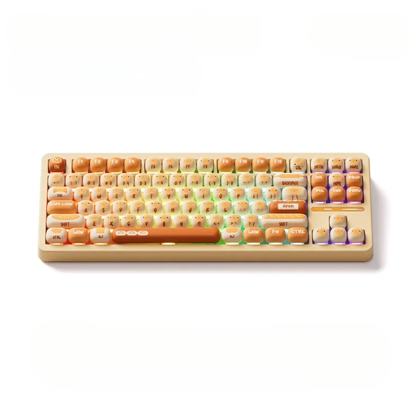Savor the amazing combination of elegance and practicality with the Bun Wonderland TAC87 MOG Tri-Mode Mechanical Keyboard! The exquisite Stellar Rose Switch or the cool Cilantro Switch are the two switch options available. The gorgeous white and brown keycap combination on this keyboard gives your setup a pleasant touch. While the Enter key proudly displays the phrase “OPEN”. While the Space and Shift keys feature whimsical bun icons. This keyboard’s sturdy PBT structure and vivid RGB lighting make it suitable for both gamers and typists. With the ideal fusion of style and functionality in one alluring package. That you may improve your typing experience!