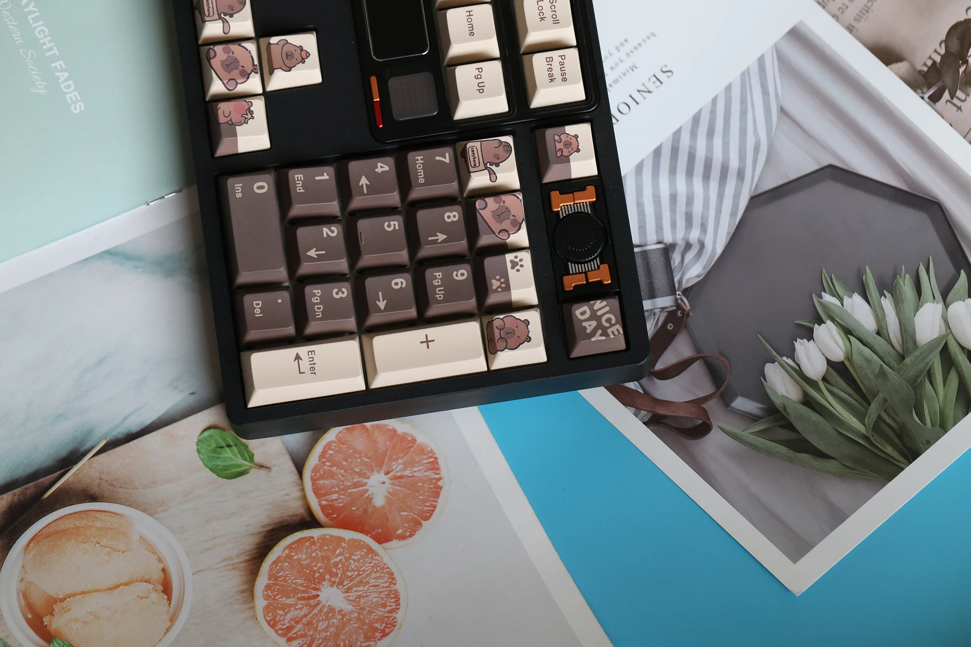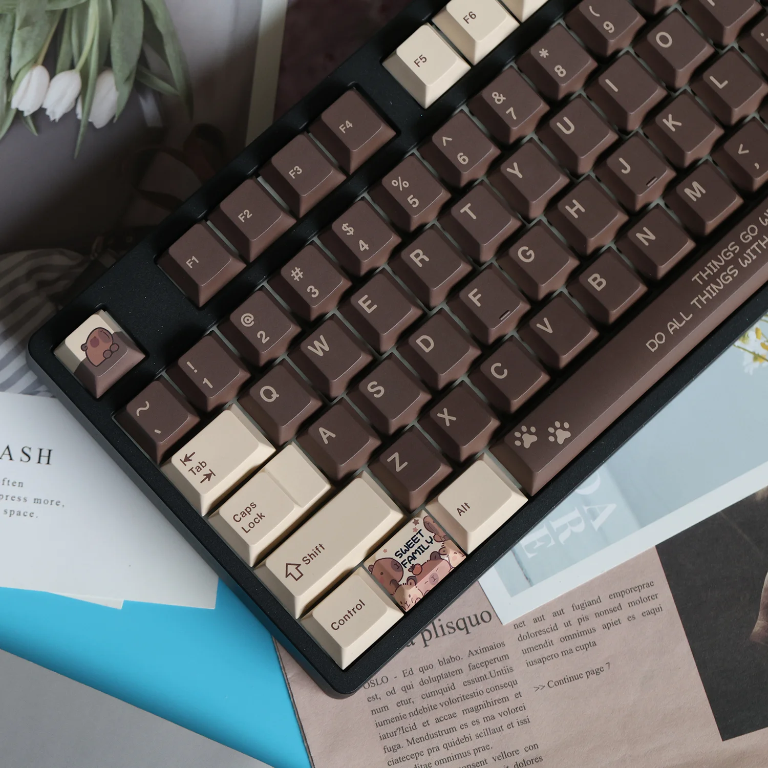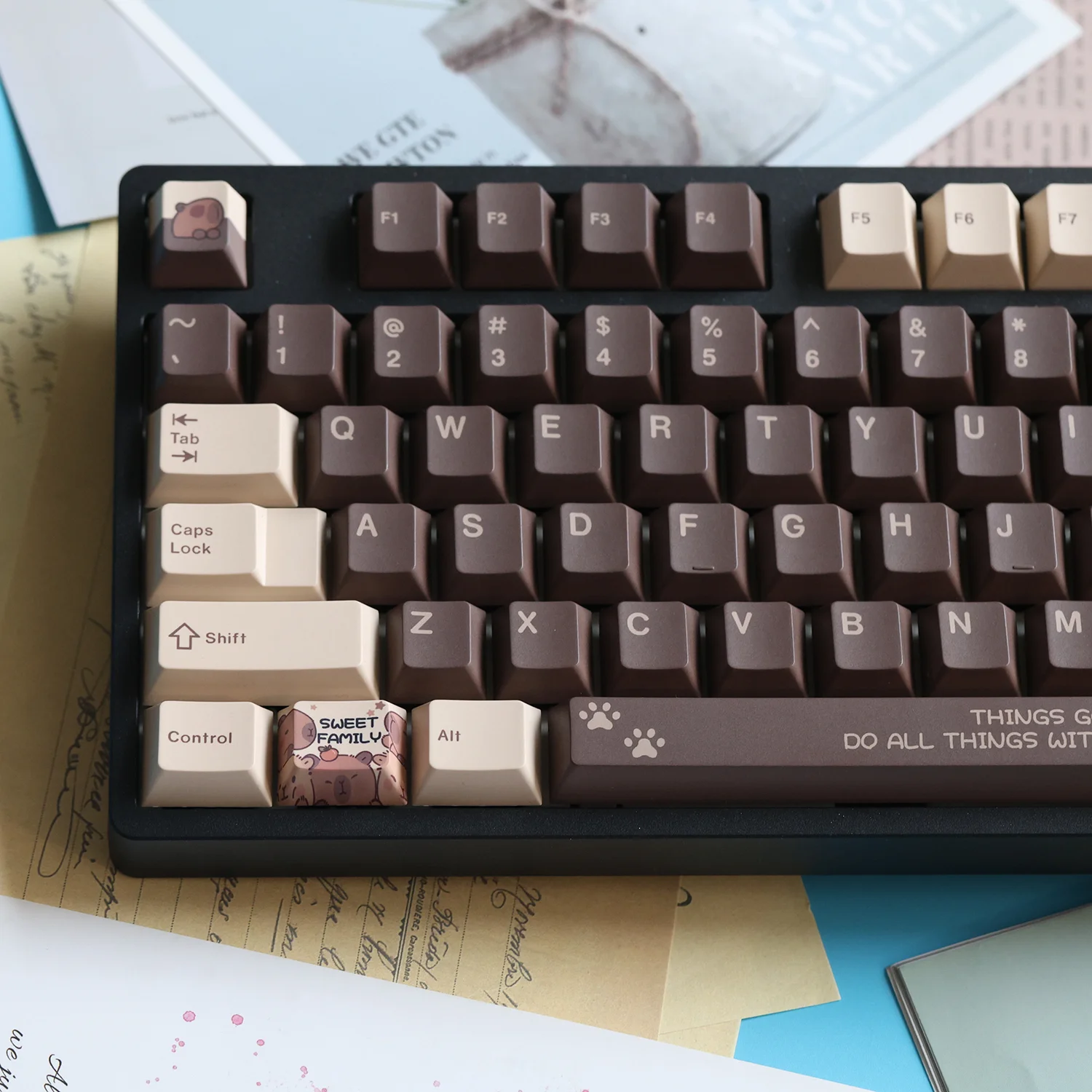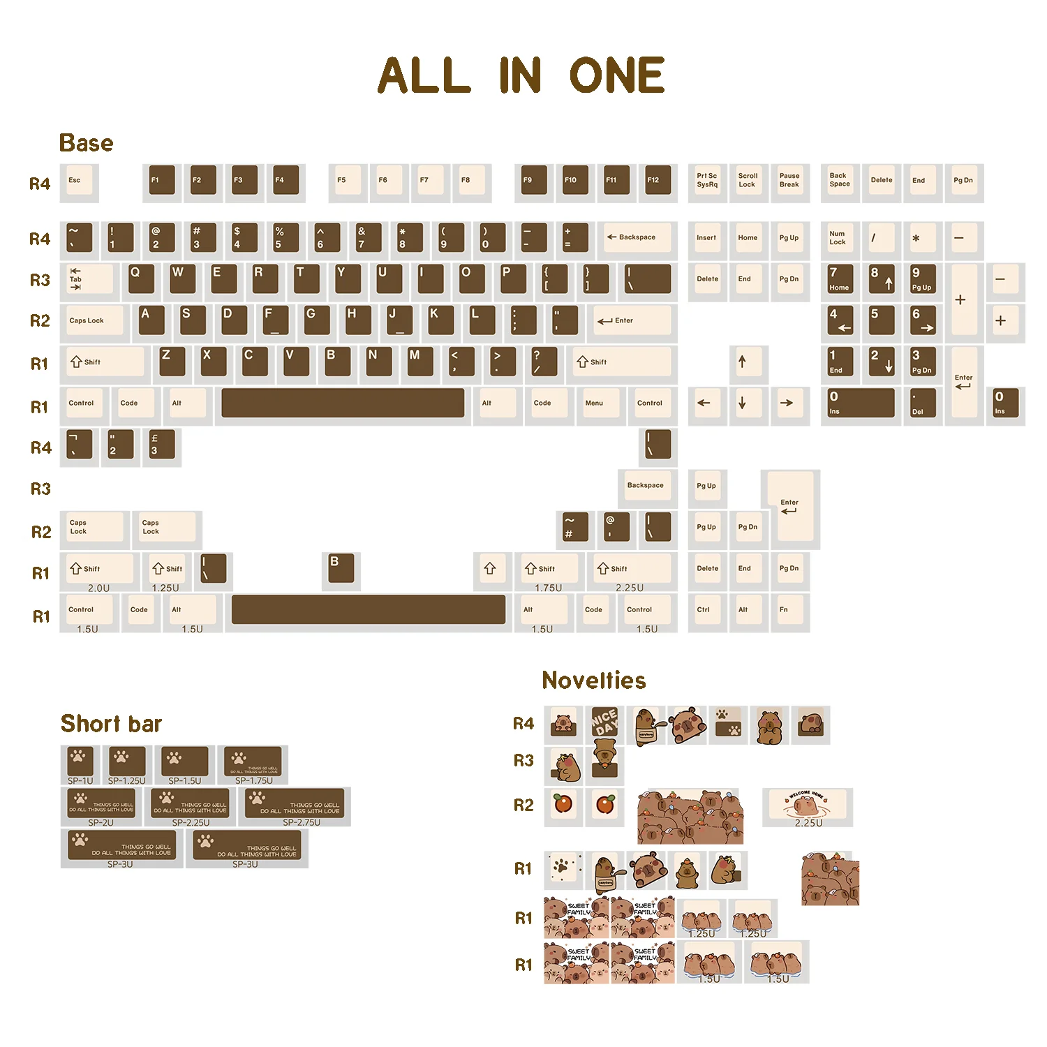 Explore your keyboard’s potential with the Capybara 2.0 OEM Keycap Set. This premium set features a dark brown base elegantly contrasted with beige keycaps, creating a sophisticated aesthetic. The brown and beige lettering ensures excellent readability, while the unique capybara icon design and adorable animal paw icon design add a touch of personality to your setup. Crafted from durable PBT material, these OEM profile keycaps offer exceptional longevity and a satisfying tactile feel. Elevate your typing experience and make a statement. Upgrade to the Capybara 2.0 OEM Keycap Set today!