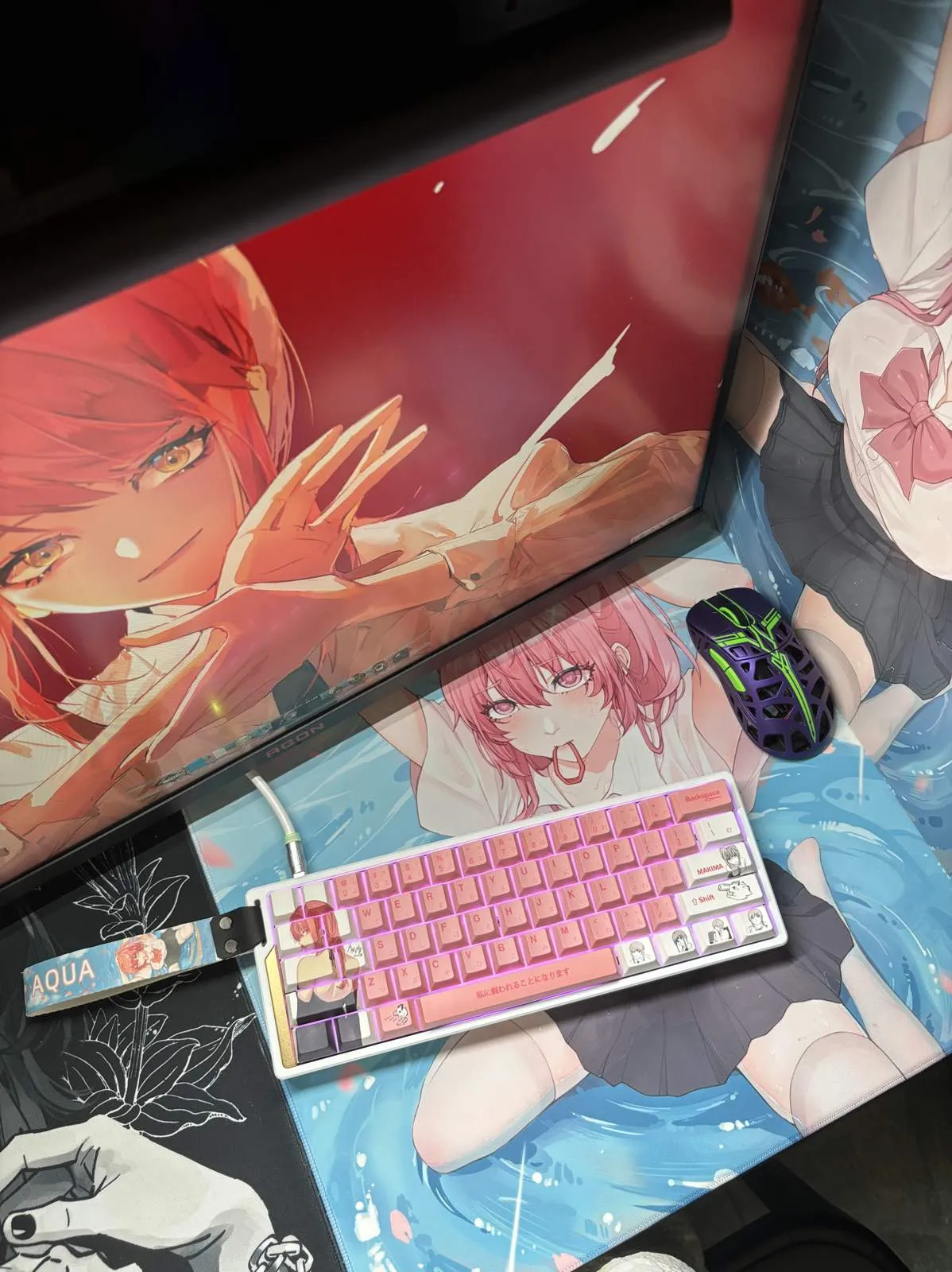 Try the Chainsaw Man: Pink Makima Cherry Keycap Set to make your gaming experience even better! This gorgeous set has a soft pink base with elegant white keycaps that make for a striking contrast. A striking design is ensured by the bright pink lettering that adorns the keycaps. A number of keycaps such as the Enter Key. That include distinctive character icon designs honoring the cherished series. The character name “MAKIMA” which is boldly displayed on the Shift Key. That gives your keyboard a unique touch. These keycaps which are made of sturdy PBT material and have a cherry profile. That are ideal for any Chainsaw Man enthusiast wishing to add flair to their setup!