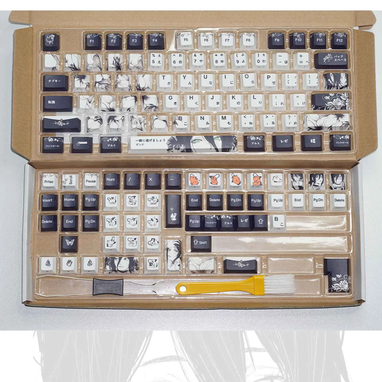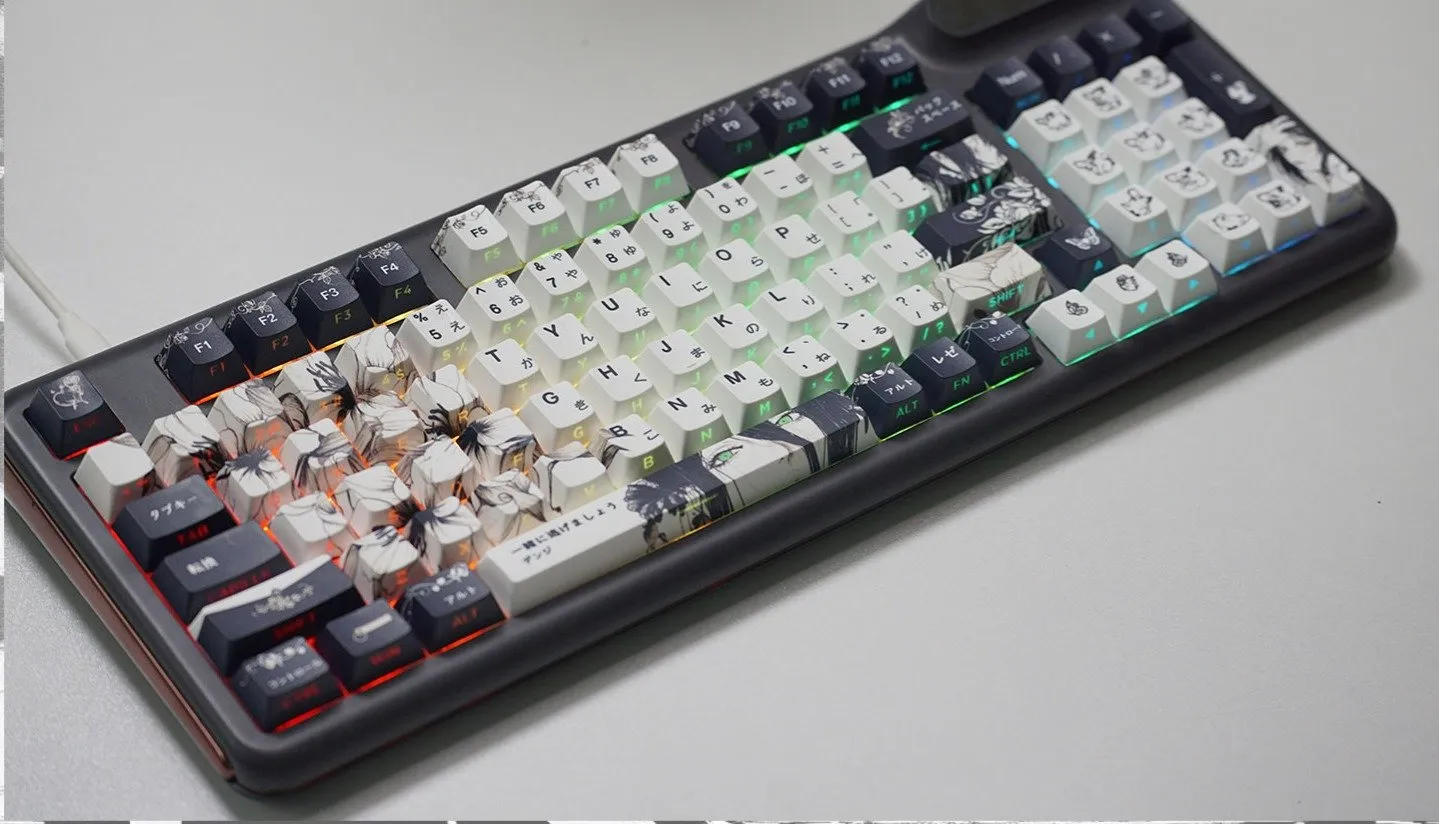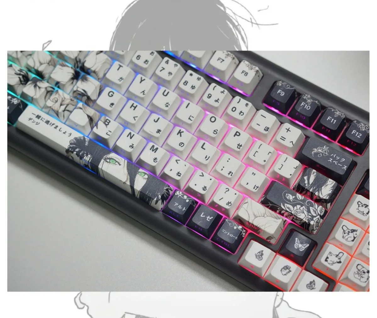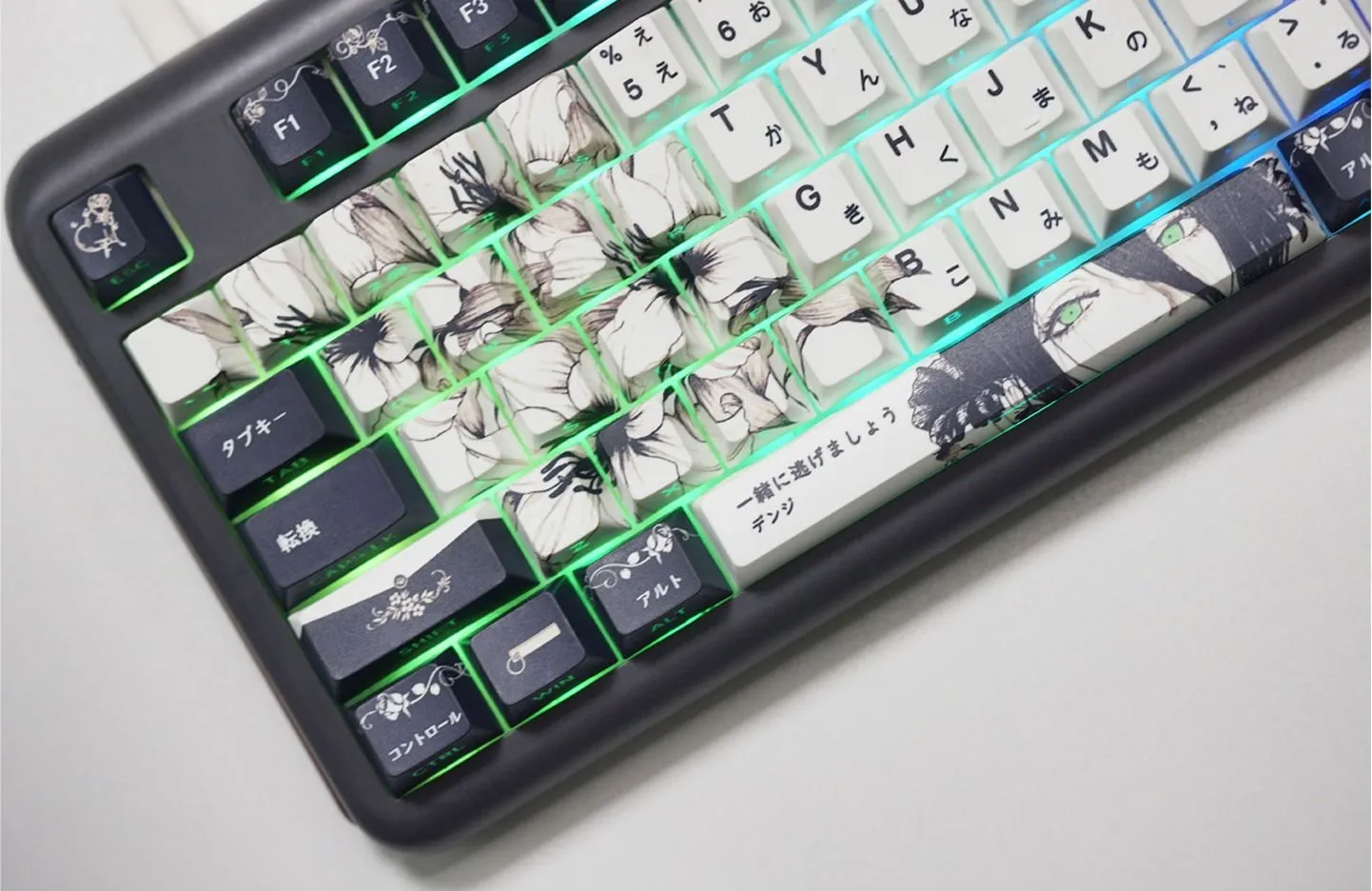 Transform your keyboard with the Chainsaw Man: Stylish Reze Cherry Keycap Set! Bold black keycaps design create a dramatic contrast with the sleek white base of this gorgeous set. The sophisticated black and white lettering on each keycap improves readability and appearance. A distinctive character icon adorns the Space Key that giving your setup a whimsical touch. Furthermore, several keycaps such as the Enter Key. Which have lovely floral icons that enhance the overall style. This keycap set which is made of sturdy PBT material with a cherry profile. That is ideal for both appearance and use. Which making it a necessity for both keyboard aficionados and fans!