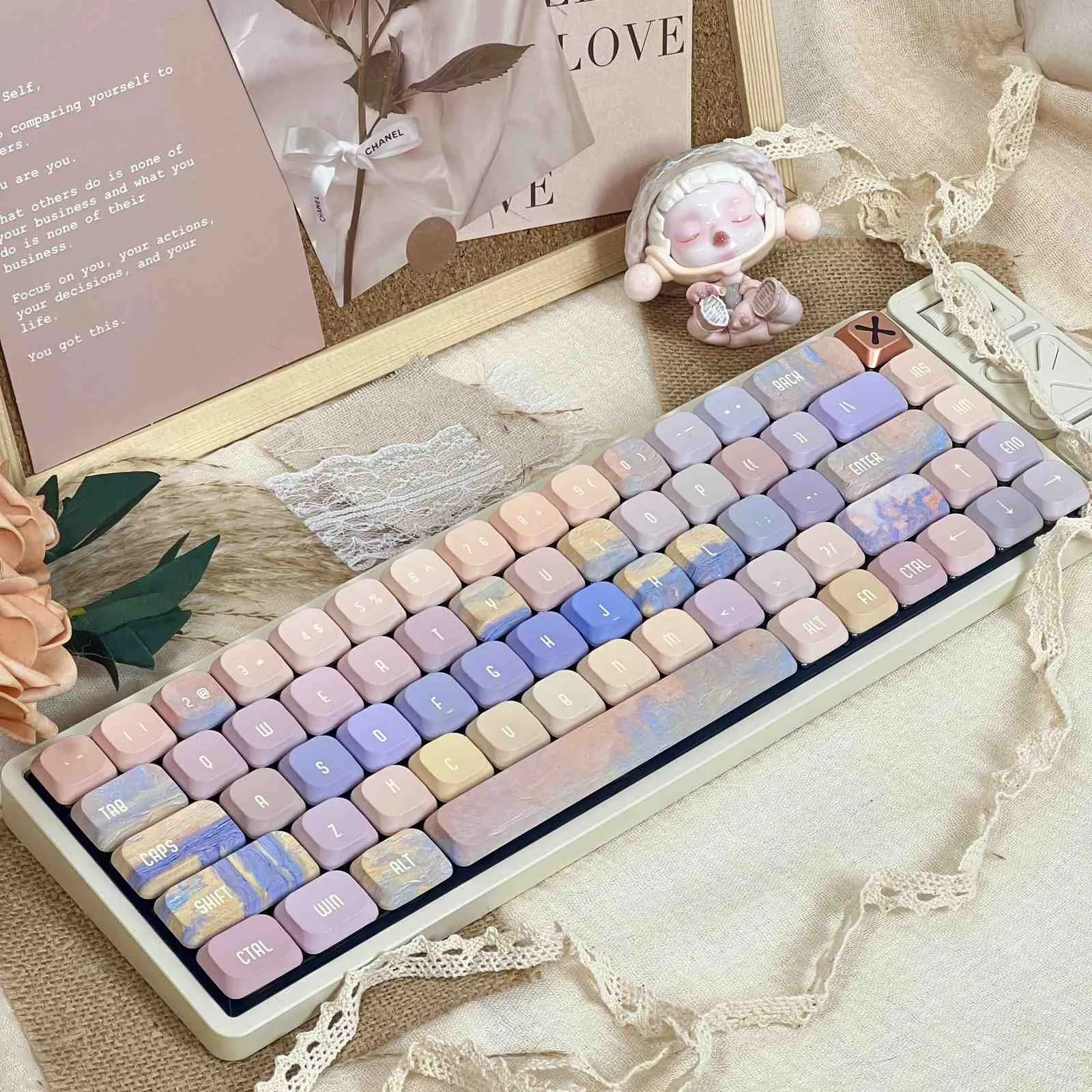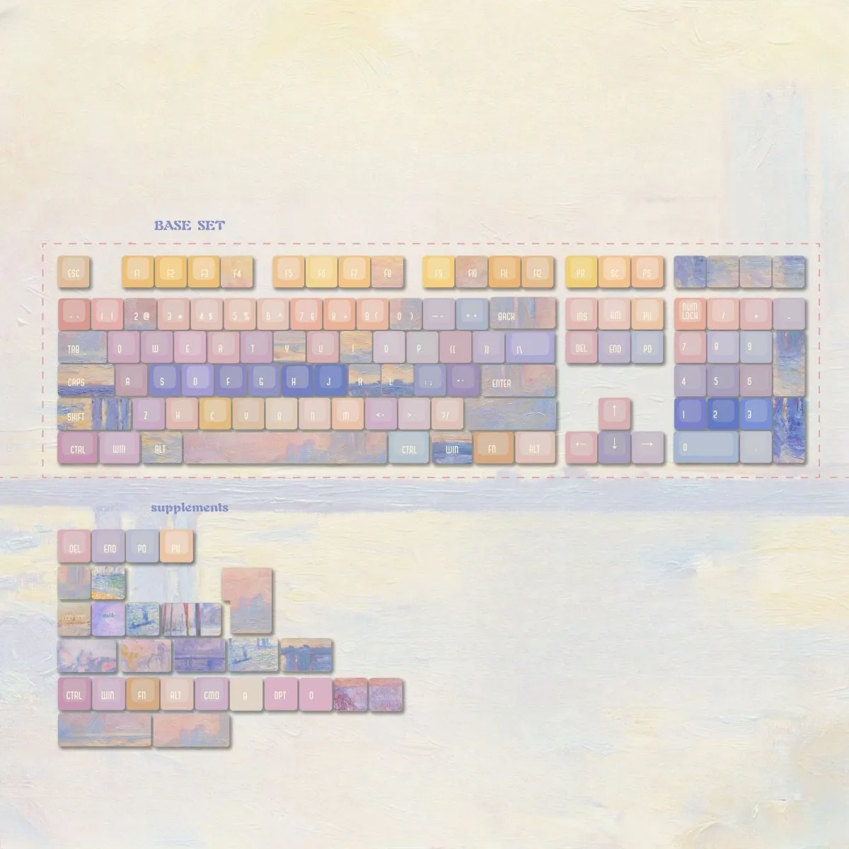 Take your keyboard to the next level with the gorgeous Charles Bridge ADA Keycap Set! Each piece in this colorful collection showcases a different painting art style. Which has a lovely blend of pink, blue and other colors. One of the keycaps sticks out since it has a beautiful bridge emblem that is tastefully decorated with white text. These keycaps are made of sturdy PBT material which guarantees longevity and a high end feel. This set’s artistic flair not only makes typing more enjoyable. But it also gives your workspace a creative boost. Now is the time to turn your piano into a masterpiece with the Charles Bridge ADA Keycap Set!