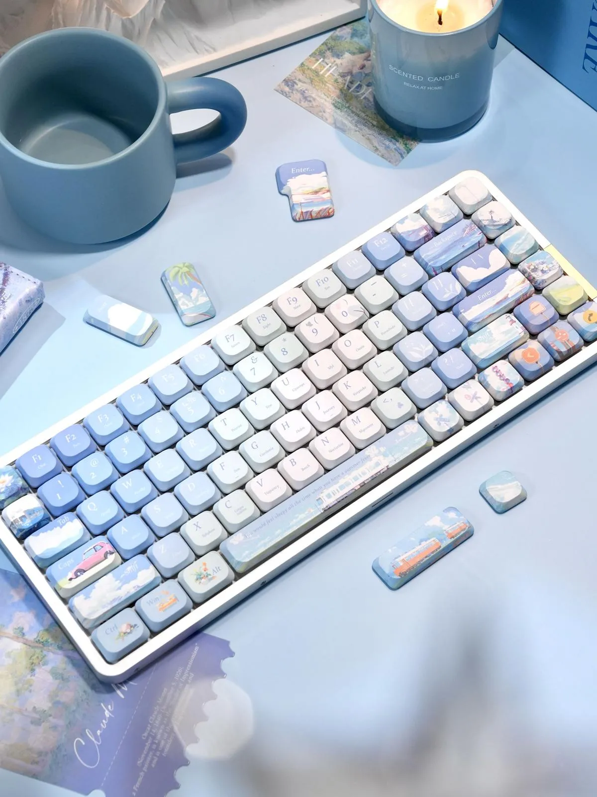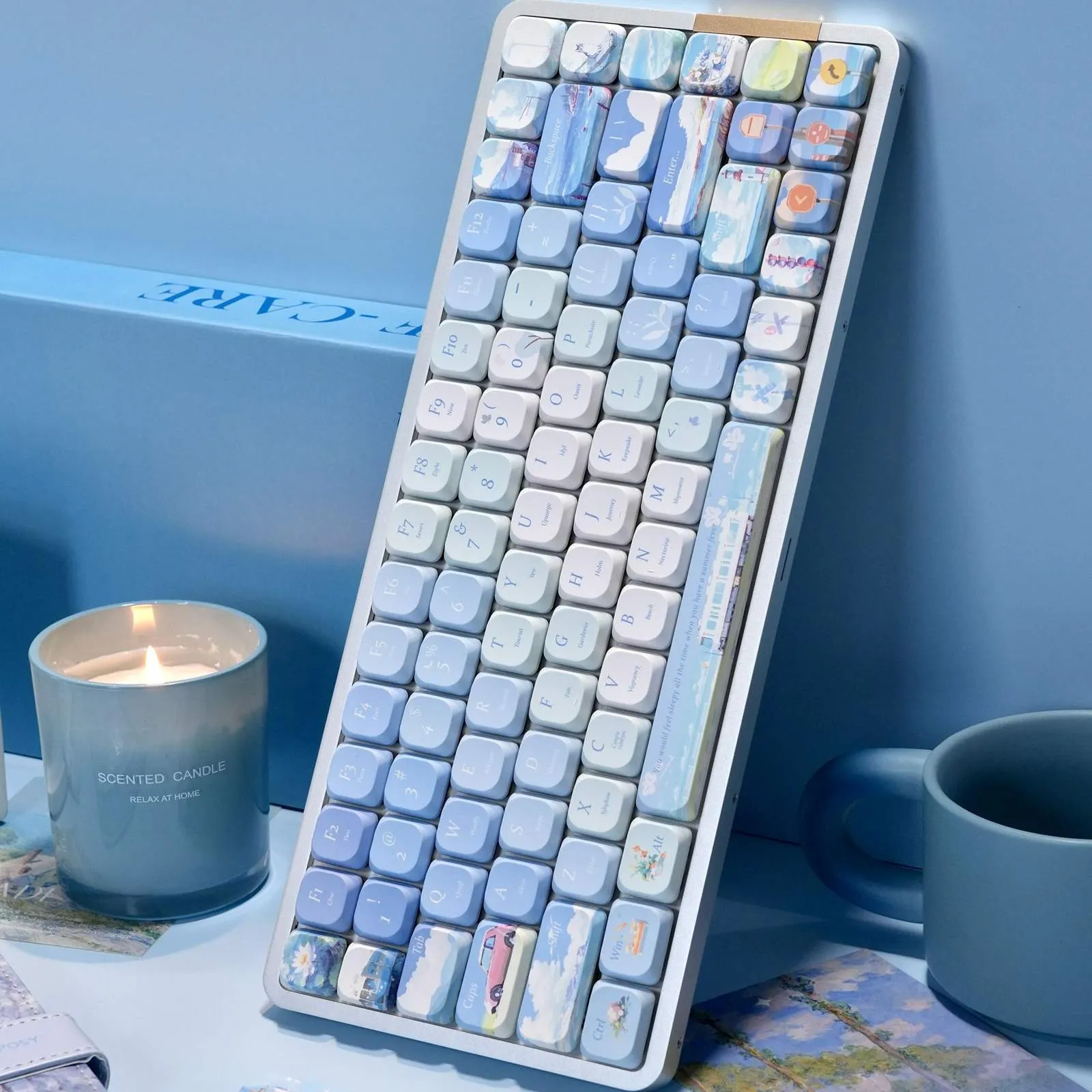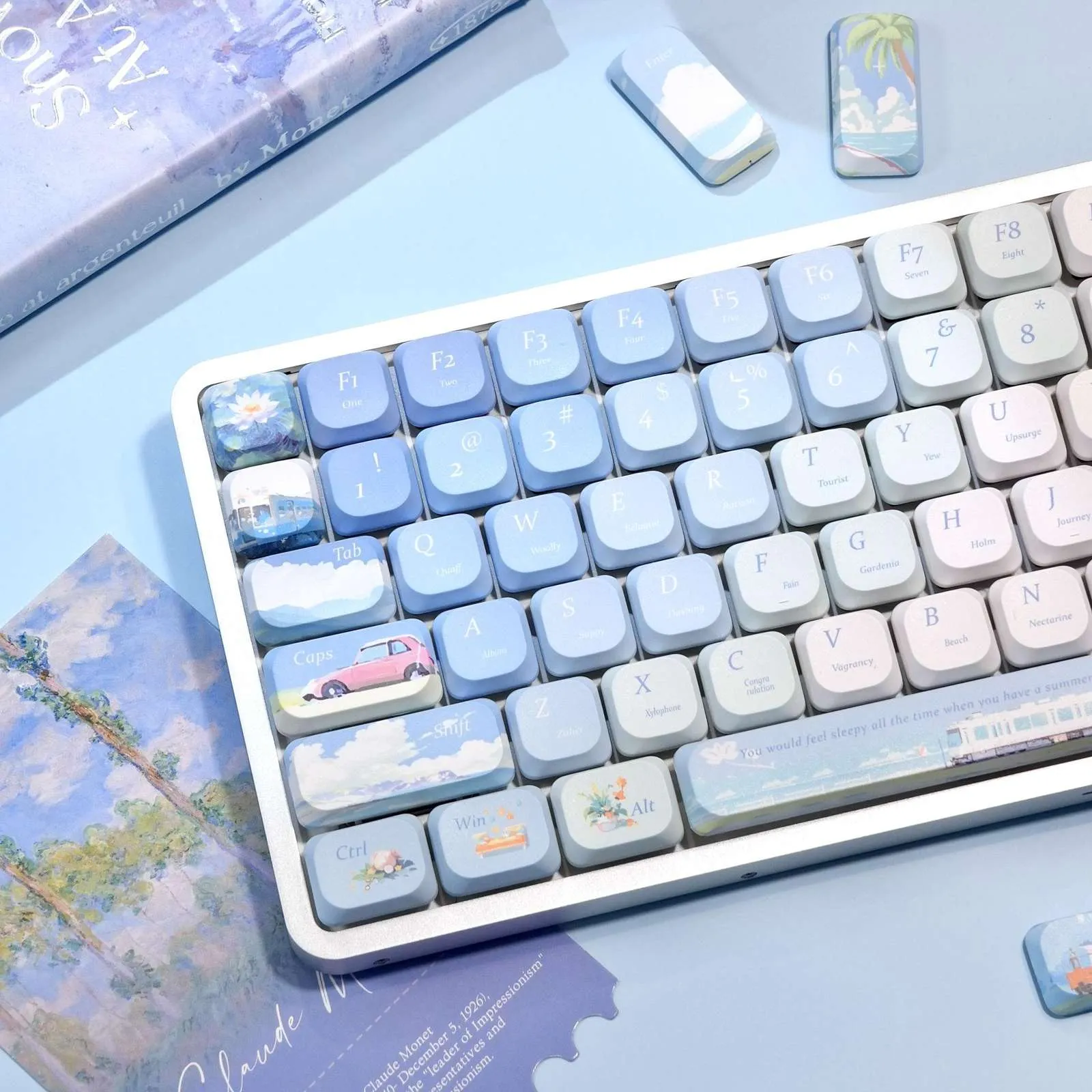 Capture the essence of sunny days with the Chasing Summer Breezes ADA Keycap Set! Charm and fun are combined in this charming design. Its vibrant keycap color scheme of light pink, blue and soft green conjures up a cool summertime feeling. Excellent reading and a unified appearance are guaranteed by the use of clear, blue and white letters. To add individuality and inventiveness, a delicate blossom graces the ESC Key and a bold red automobile image adorns the Caps Key. This ADA profile keycap set is made of sturdy PBT material which ensures comfort, longevity, and fluid typing. With this lovely set, you can transform your keyboard into a fun and sophisticated summer festival.