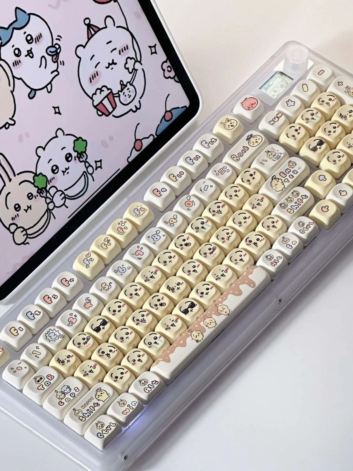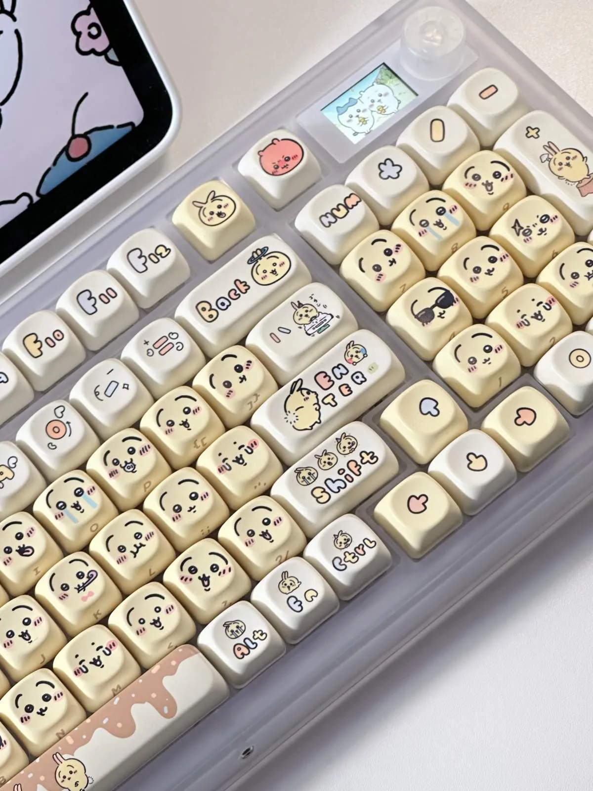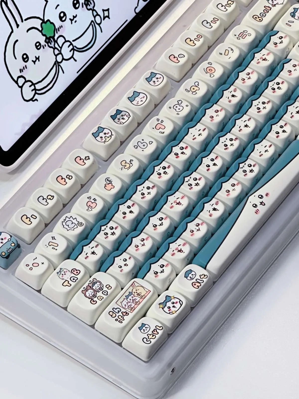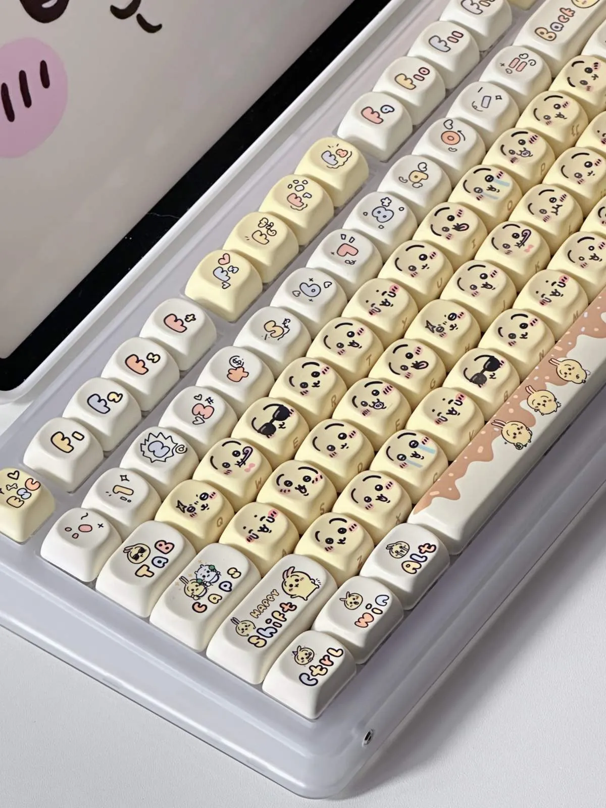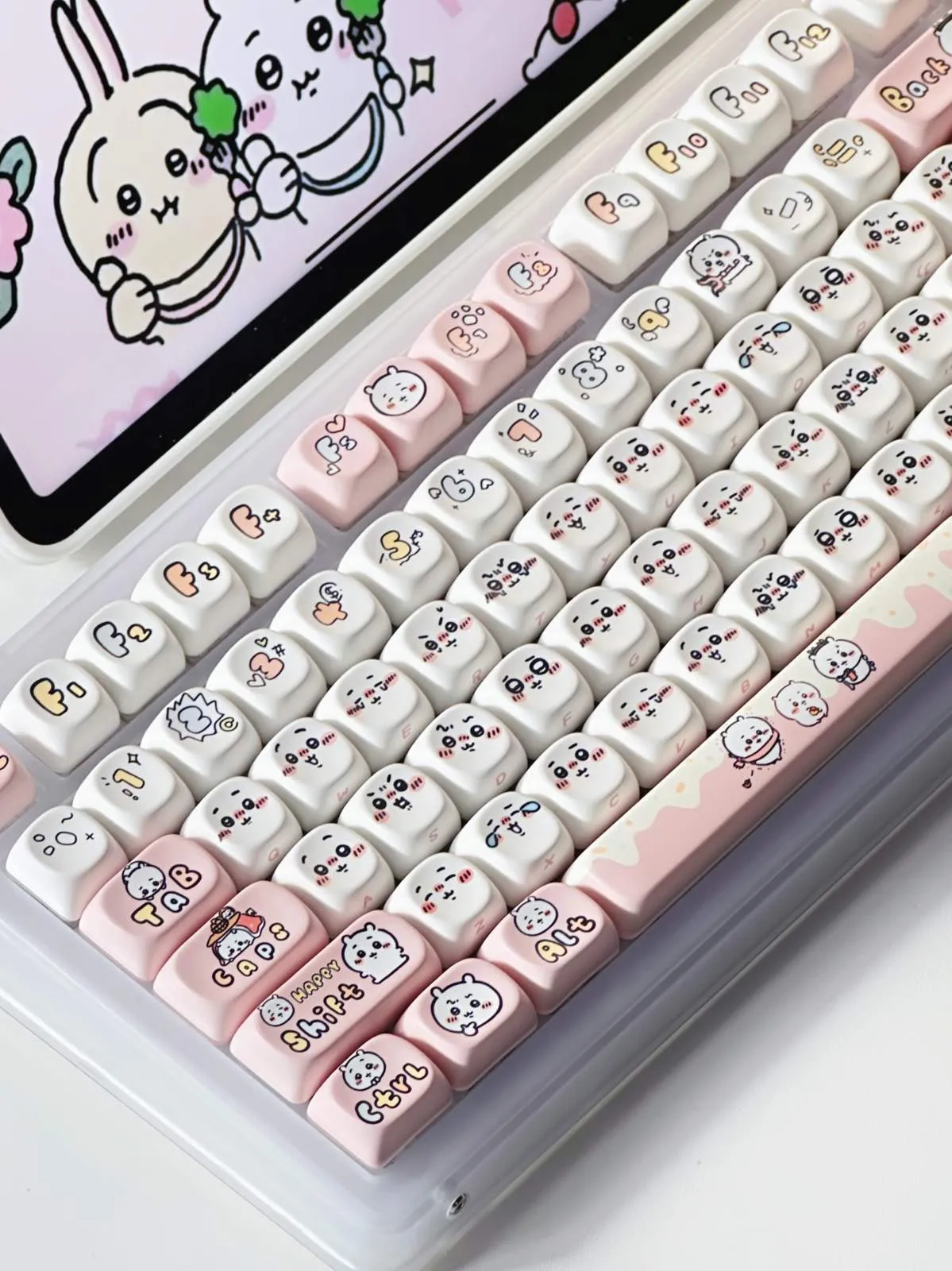 Transform your keyboard with the Chiikawa: Adorable Characters Series Keycap Set! There are three fun choices: Chiikawa, Hachiware or Usagi Keycap Set. The bright yellow keycaps in the Usagi set add a lively touch to your setup. Hachiware creates a humorous contrast by combining white and blue keycaps. The Chiikawa set features adorable pink keycaps on a sleek white base. Every keycap features vibrant and distinctive font designs that give your typing experience flair. The majority of keycaps include expressively designed character icons that make every keystroke joyful. These keycaps are made of sturdy PBT and are not only adorable but long lasting. Upgrade your keyboard right now with these cute keycaps!