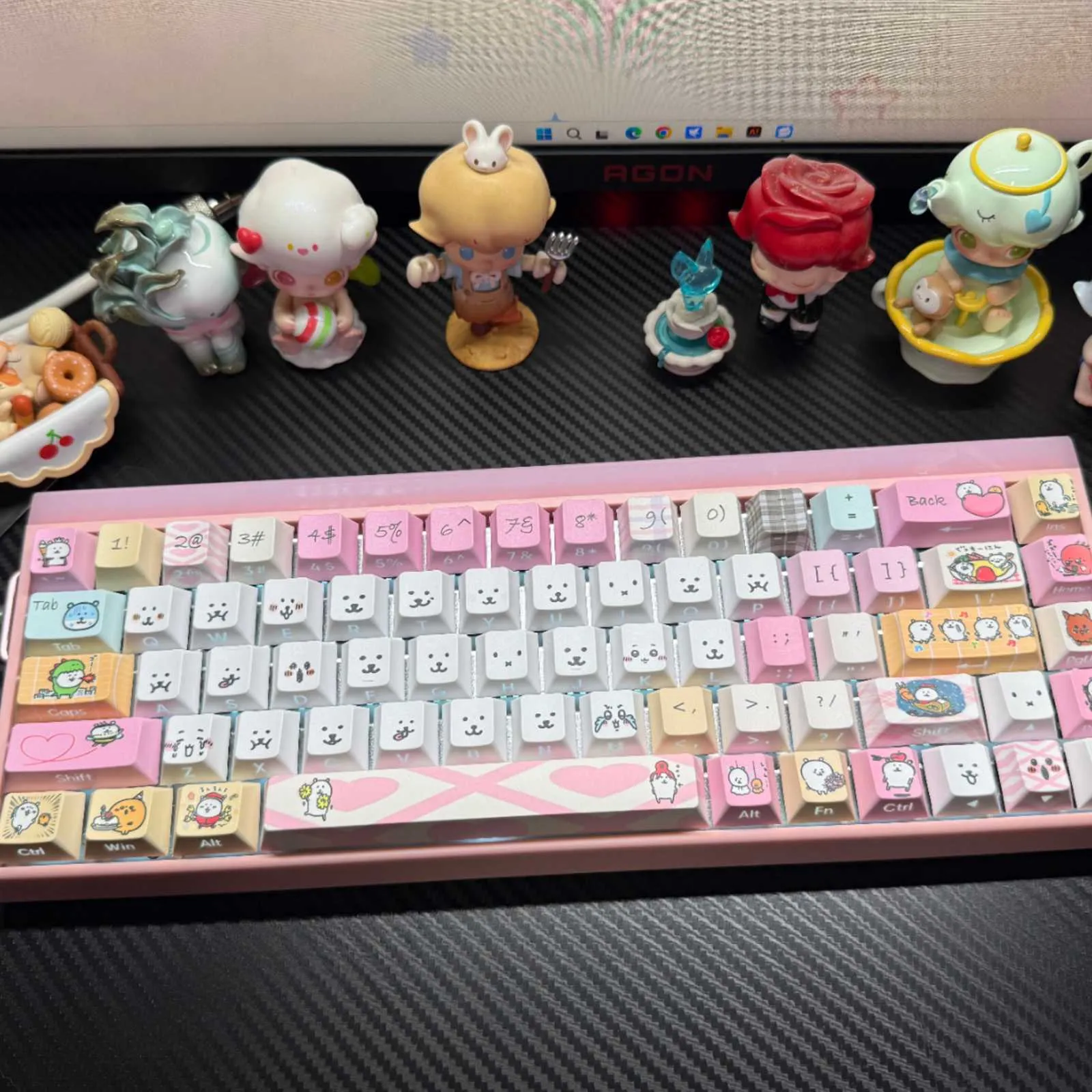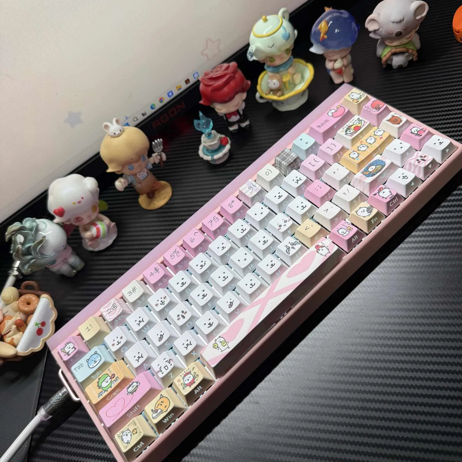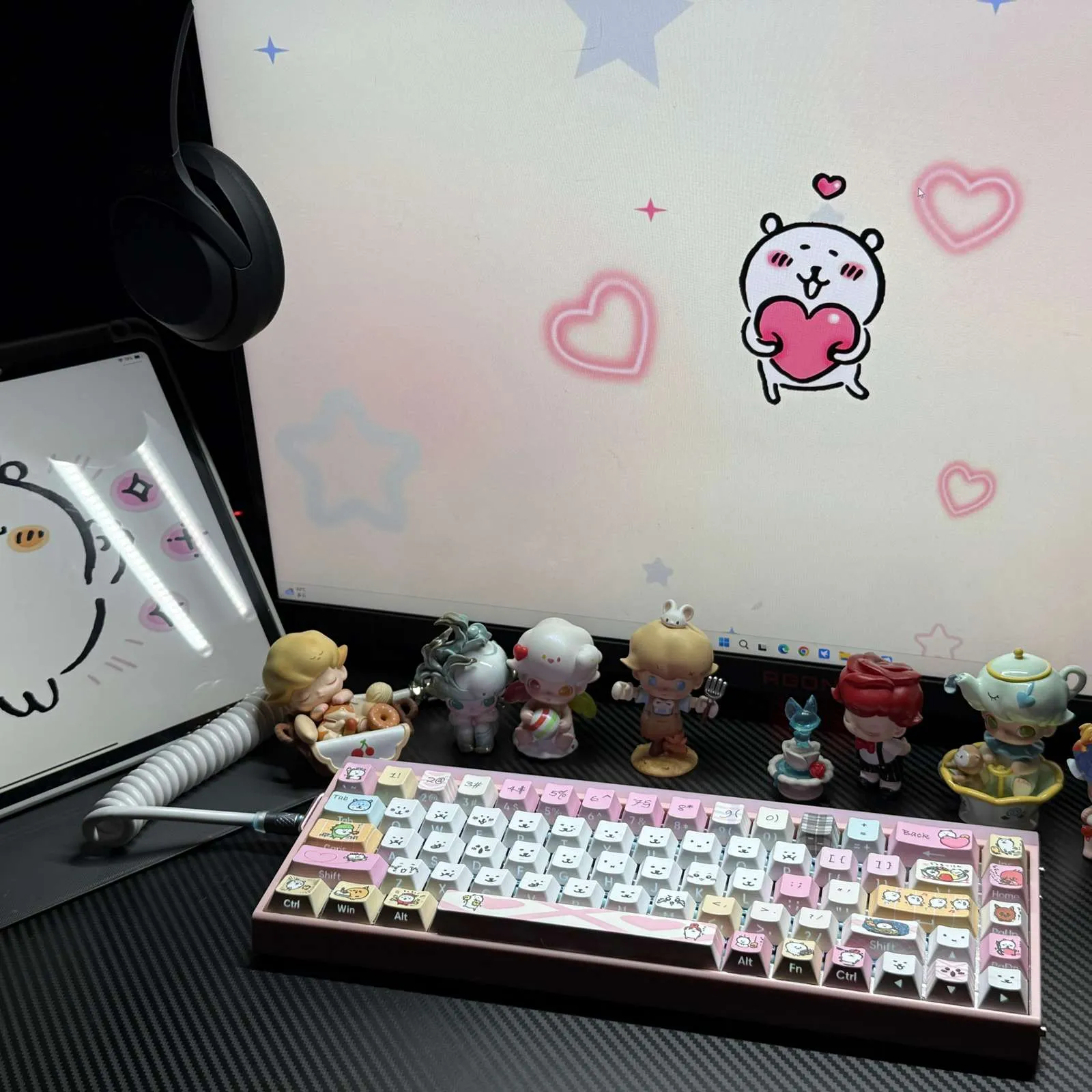 Brighten your keyboard with the Chiikawa: Joke Bear Cherry Keycap Set! This adorable set has a sleek white base with keycaps. That in shades of pink, blue and orange that create a whimsical look. The majority of keycaps have adorable character emotion icons that give your setup charm. The Backspace and Shift Keys have heart-shaped icons for an added whimsical touch. While the Enter Key stands out with a distinctive character icon in a playful pose. This keycap set is the ideal addition for any Chiikawa lover since it is made of sturdy PBT material. Which guarantees long-lasting quality and offers a cozy Cherry profile.