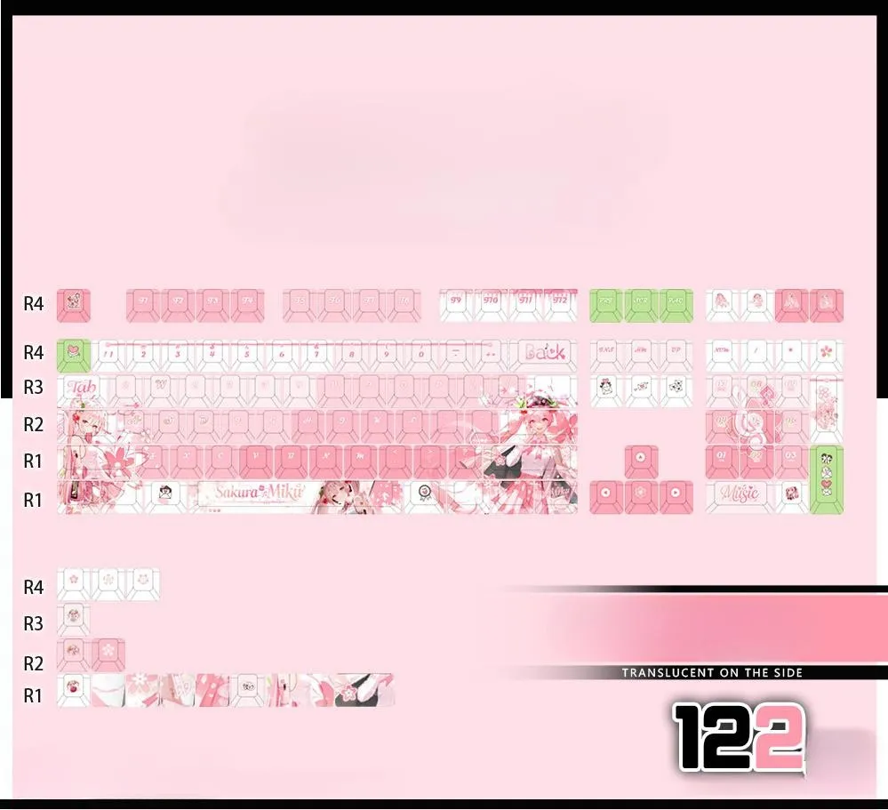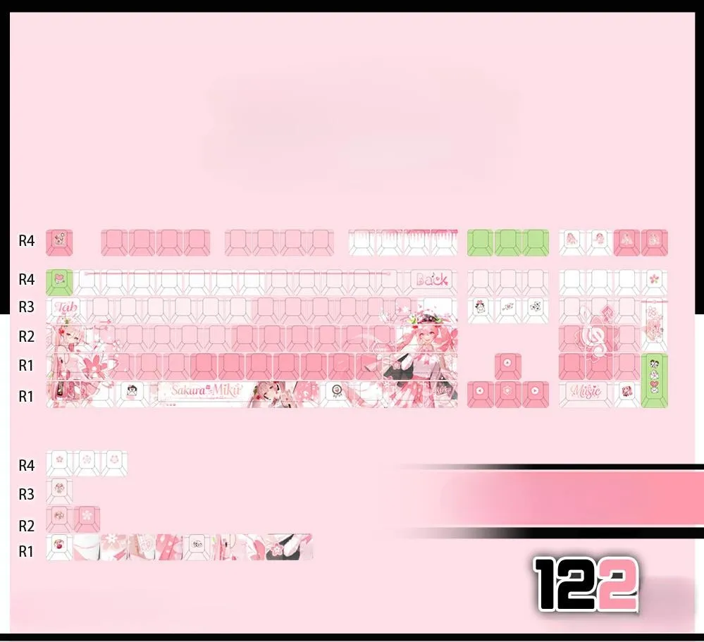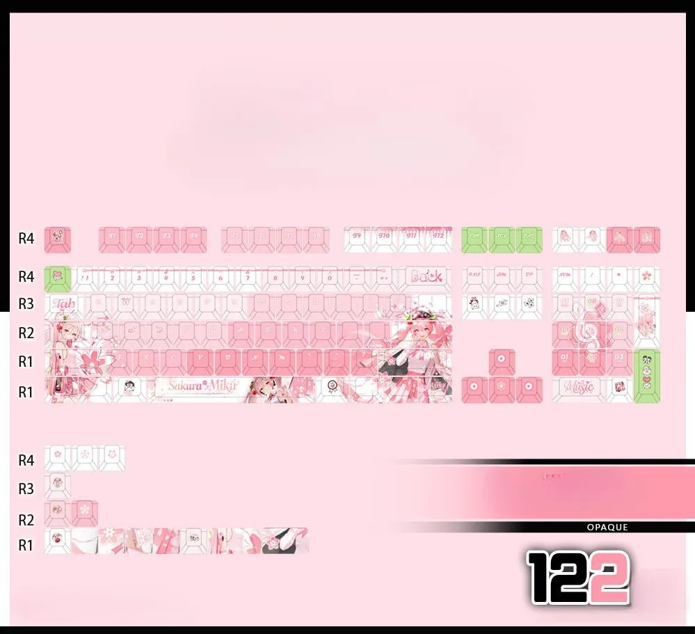 Embrace the charm of VOCALOID with the delightful Cute Sakura Hatsune Miku Cherry Keycap Set and Mechanical Keyboard! Three different keycap types—Front-Lit, Side-Lit and Opaque Versions—are included in this captivating collection. Including Keycap Sets with 122 keys, Keyboards with 87 keys and Tri-Mode Keyboards with 87 or 108 keys. Which are just a few of the five fascinating alternatives available in each version. Playful pink and white lettering in a distinctive typeface accentuates. That the keycaps blend of pink, white and green hues. The words “Sakura Miku” appear on the space key while character icons adorn both sides of the keycaps layout. Fans of Miku will love this set which is made of sturdy PBT in a cherry profile!