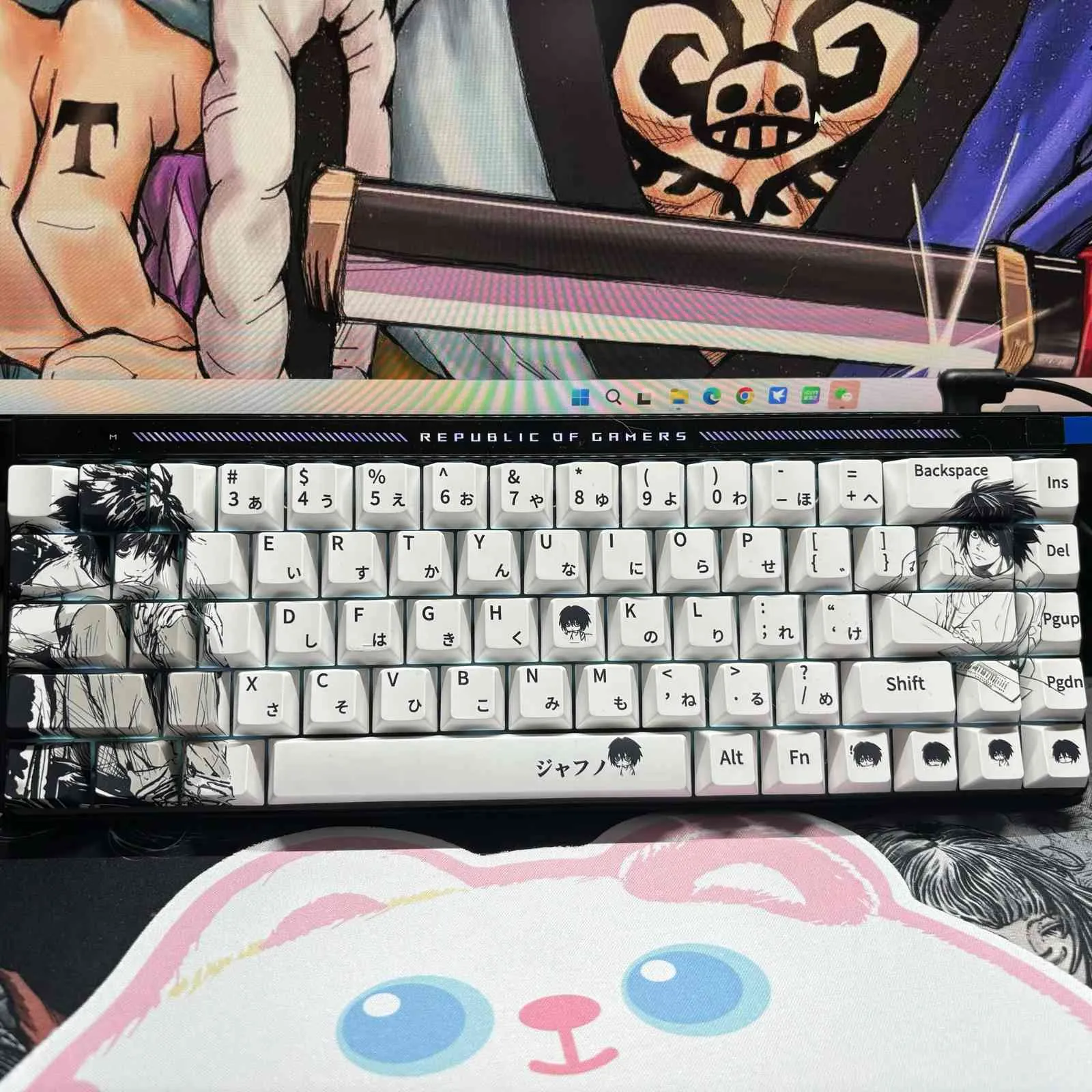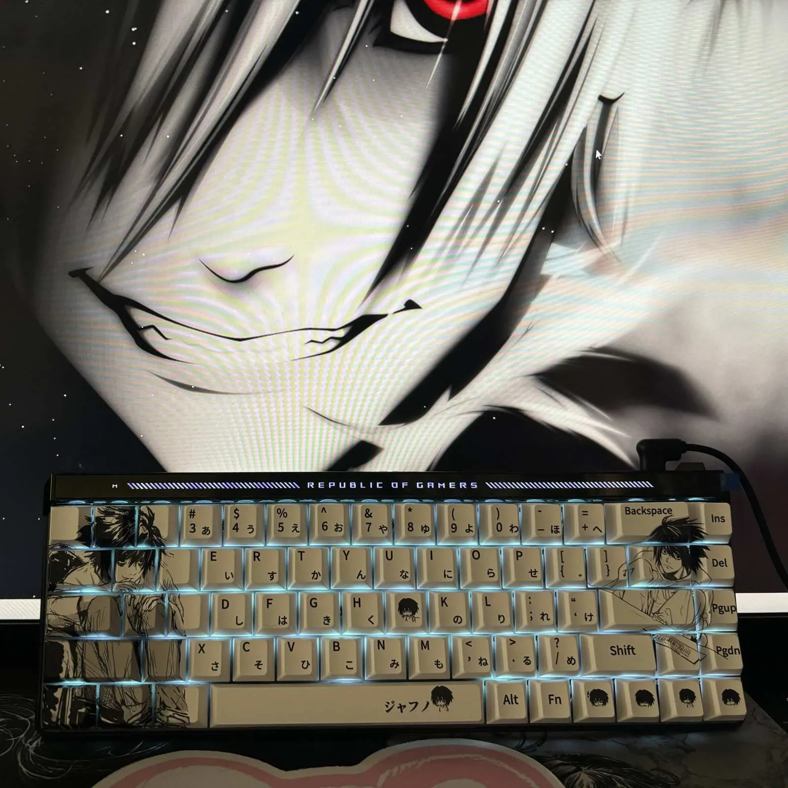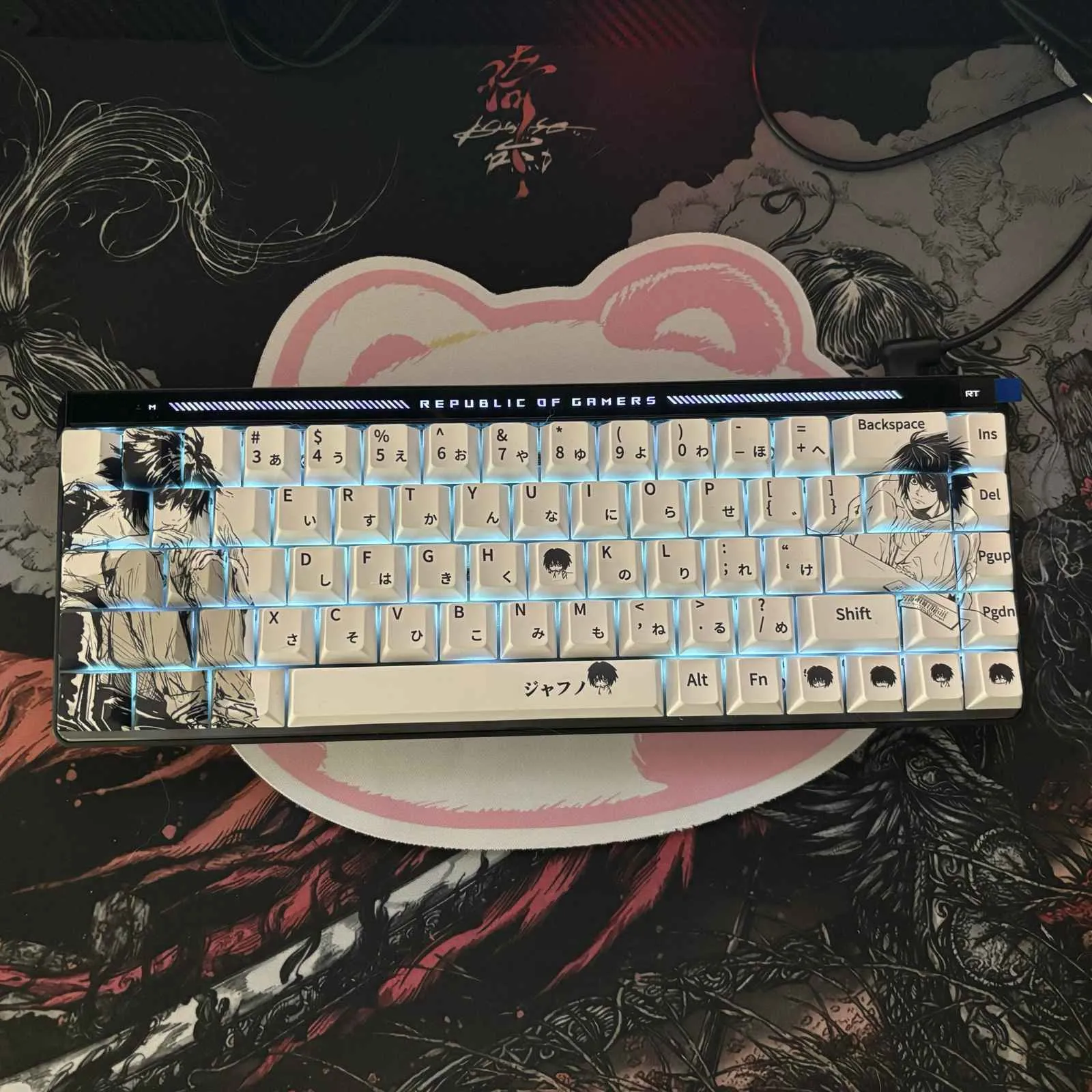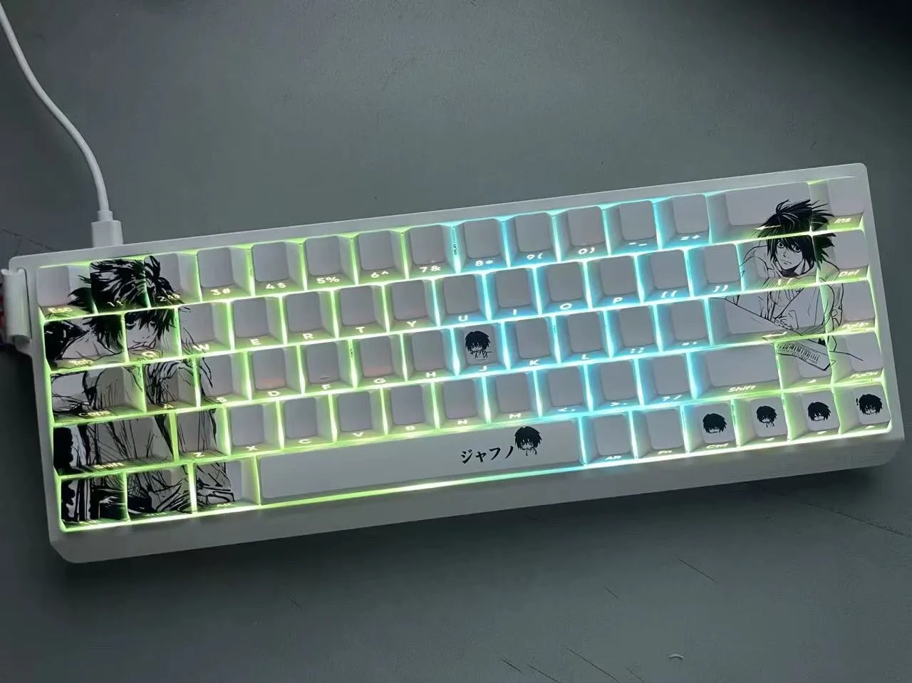Remodel your keyboard with the eye-catching Death Note: L Lawliet Cherry Keycap Set! This outstanding set has sleek white keycaps with bold black text that gives it a contemporary appearance. The left and right side keycaps include exquisitely positioned character icon design. Which offer a distinctive touch and accentuate L’s recognizable style. These keycaps long-lasting quality and robustness for daily usage. That are guaranteed by their construction from sturdy PBT material. This keycap set’s cozy Cherry profile lets you show off your Death Note fandom. While simultaneously improving your typing experience. If a fan wants to customize their setup which this is the ideal addition!