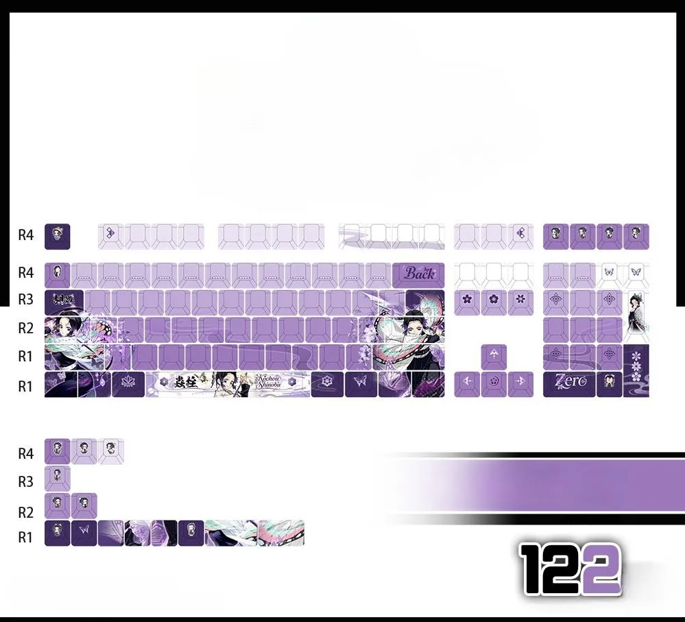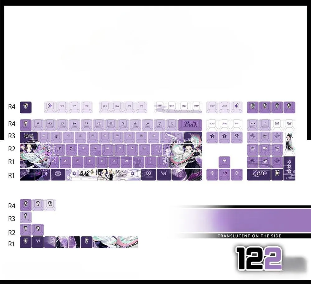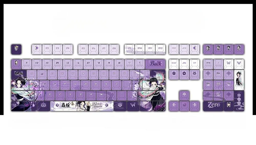 Experience the Demon Slayer: Shinobu Kocho OEM Keycap Set & Mechanical Keyboard and unleash your inner demon slayer! Three keycap types—Front-Lit, Side-Lit and Opaque Versions—each with five distinct alternatives are available in this alluring collection. A keyboard with 87 or 108 keys or keycap set with 122 keys are both options. Which they come in conventional and tri-mode configurations. The keycaps have gorgeous gradient designs and a gorgeous purple series and white mix. While some keycaps have adorable character icons, butterflies and floral designs. With white and purple lettering in a distinctive font style adds elegance. These OEM keycaps which are made of sturdy PBT. That improve the longevity and appearance of your system.