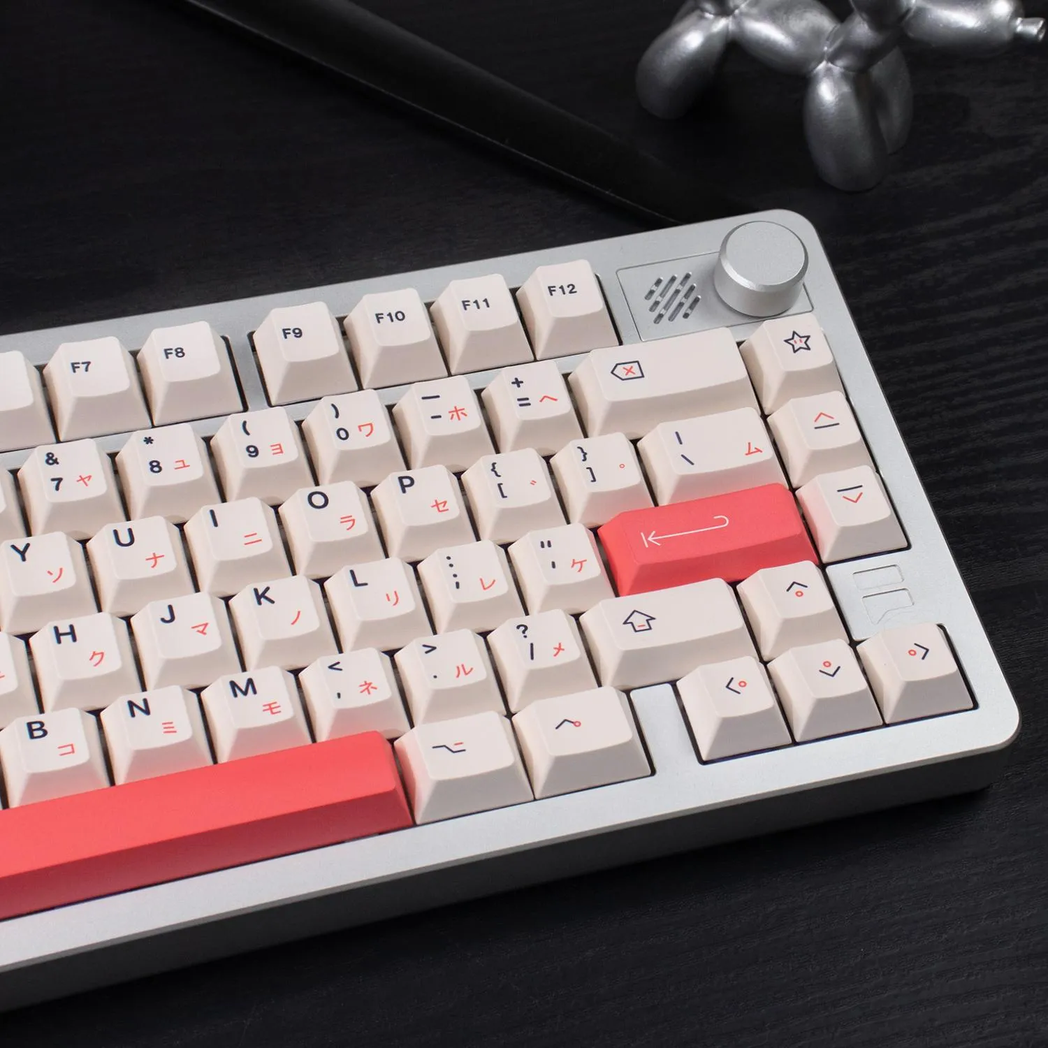 Customize your keyboard with the charming Dusty Pink Cherry Keycap Set! Which is the ideal fusion of style and originality. This alluring design exudes a delicate and romantic style. That with its immaculate white foundation accentuated by pink and blue keycaps. Clarity and aesthetic appeal are improved by the delicate pink and blue lettering. Which also produces a calming color harmony. Adding a whimsical touch with a delicate star icon key makes your setup feel really special. These keycaps which are made of high-quality PBT material. Which offer smooth typing and long-lasting durability. This set which features the Cherry profile. That is perfect for people who value elegance, comfort and a hint of pastel sophistication.