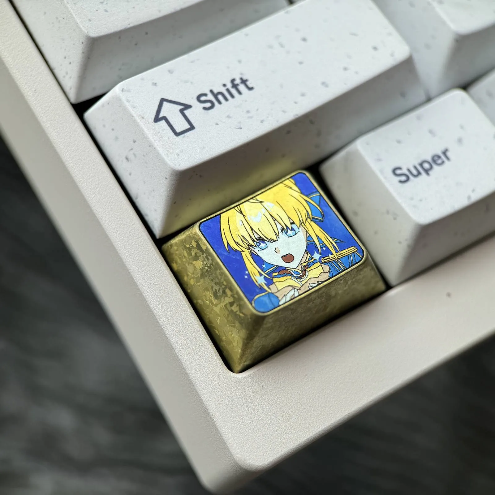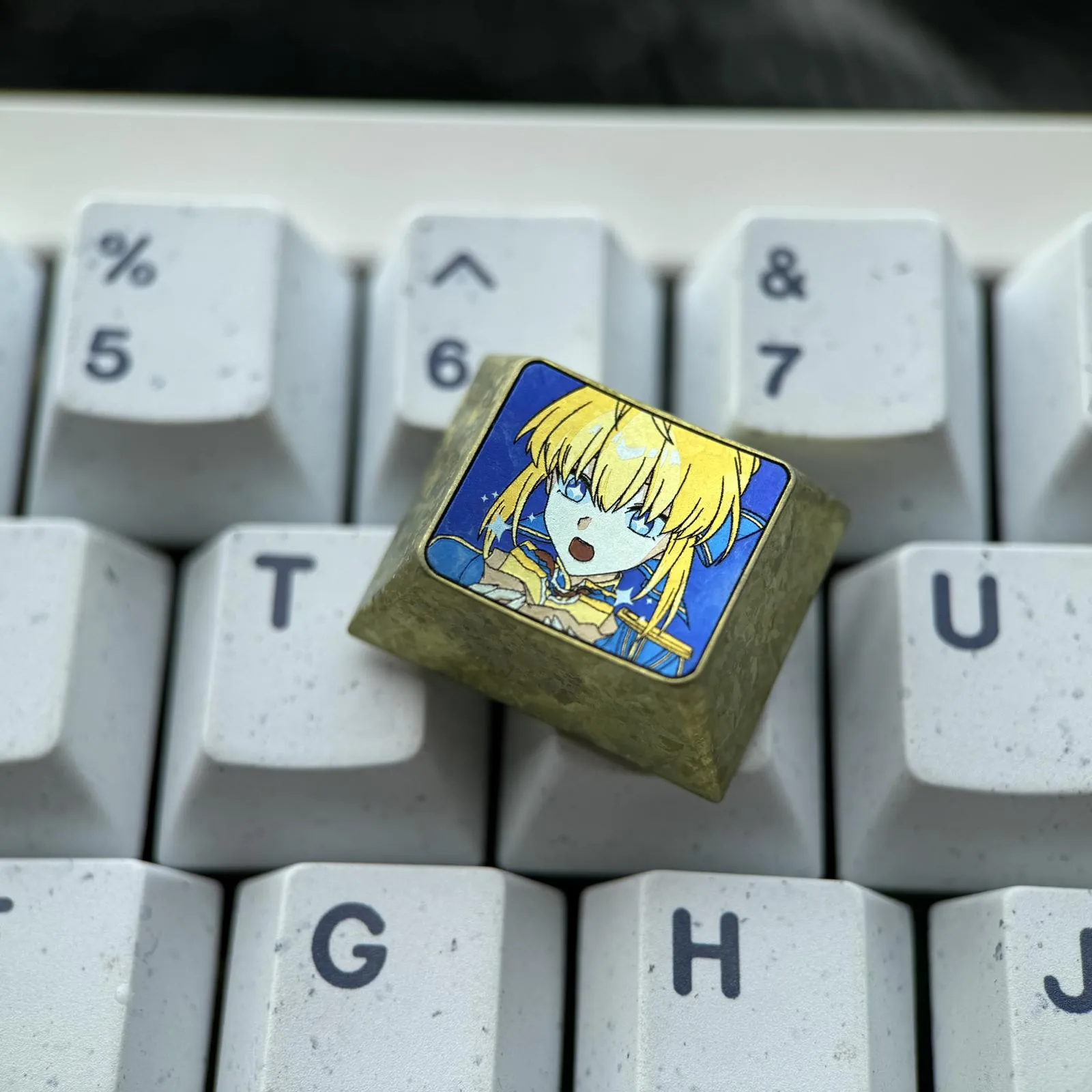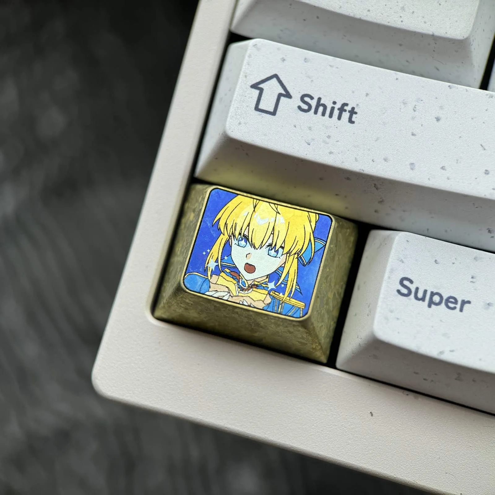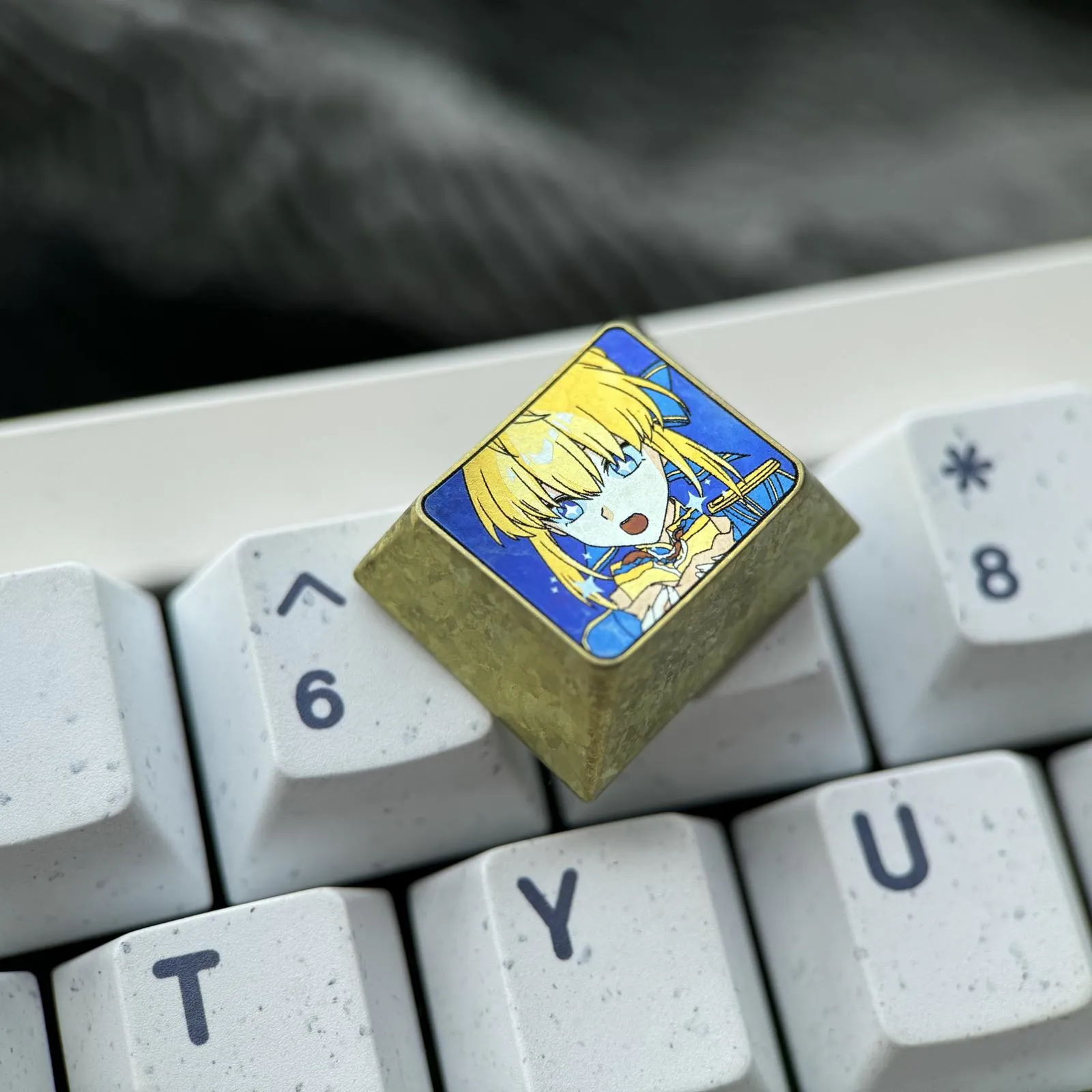 Elevate your keyboard with the Fate/Stay Night: Adorable Saber Keycap! With her mouth open and her eyes shining blue which with happy expression. That is captured in this adorable keycap’s wonderful character icon design. Her gorgeous golden-yellow hair design that giving your arrangement a lively touch. Against a striking blue backdrop which this keycap makes a striking impression. It is made in 3D from a high quality titanium alloy. Provides a luxurious feel in addition to durability. In addition to improving your keyboard, the Saber Keycap adds a whimsical and charming touch. That is apply to your everyday typing experience. Making it ideal for both fans and collectors!
