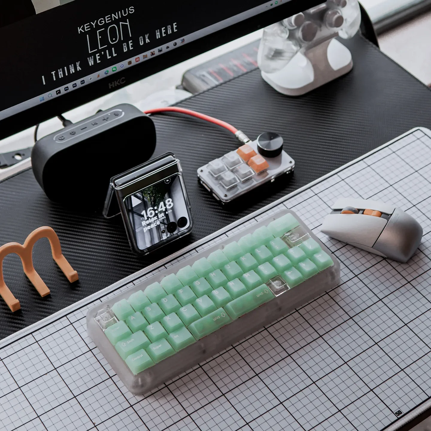 A full set of refreshing frosted emerald PC keycaps set, displaying their ethereal translucent glow and modern aesthetic from various angles.