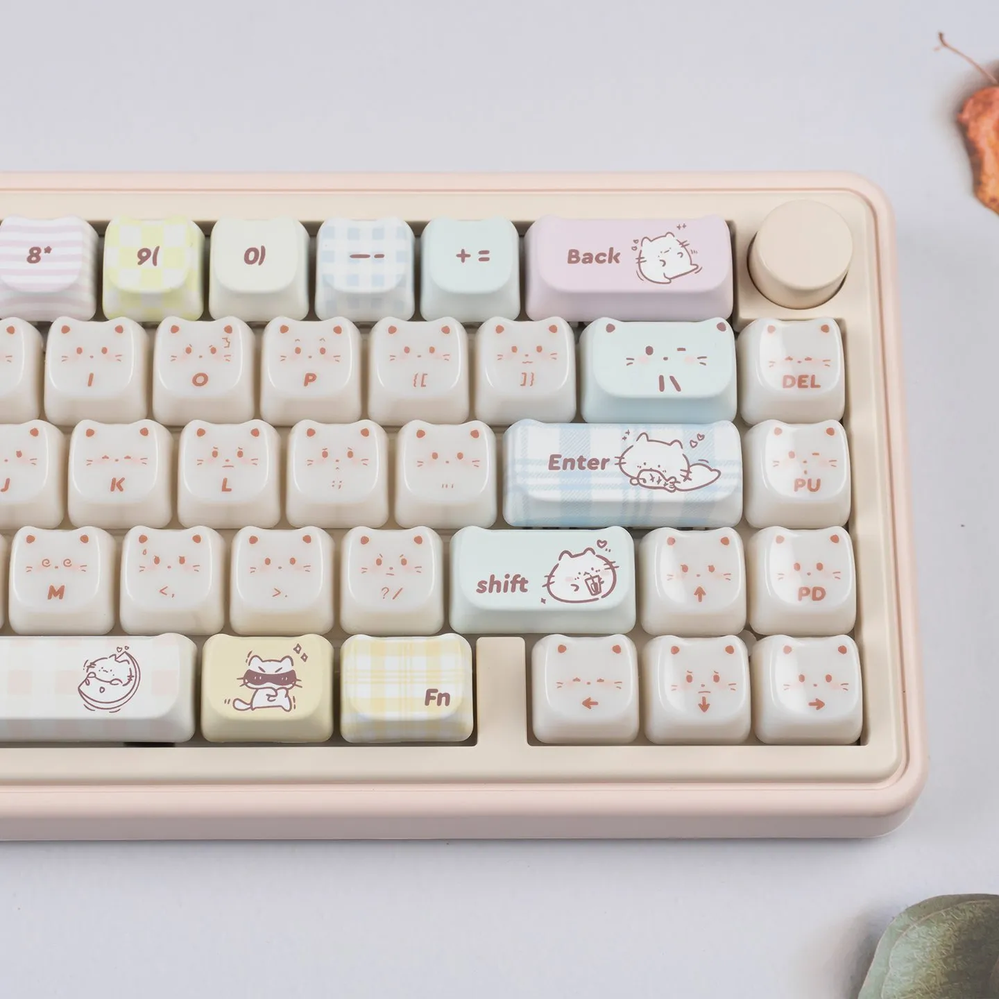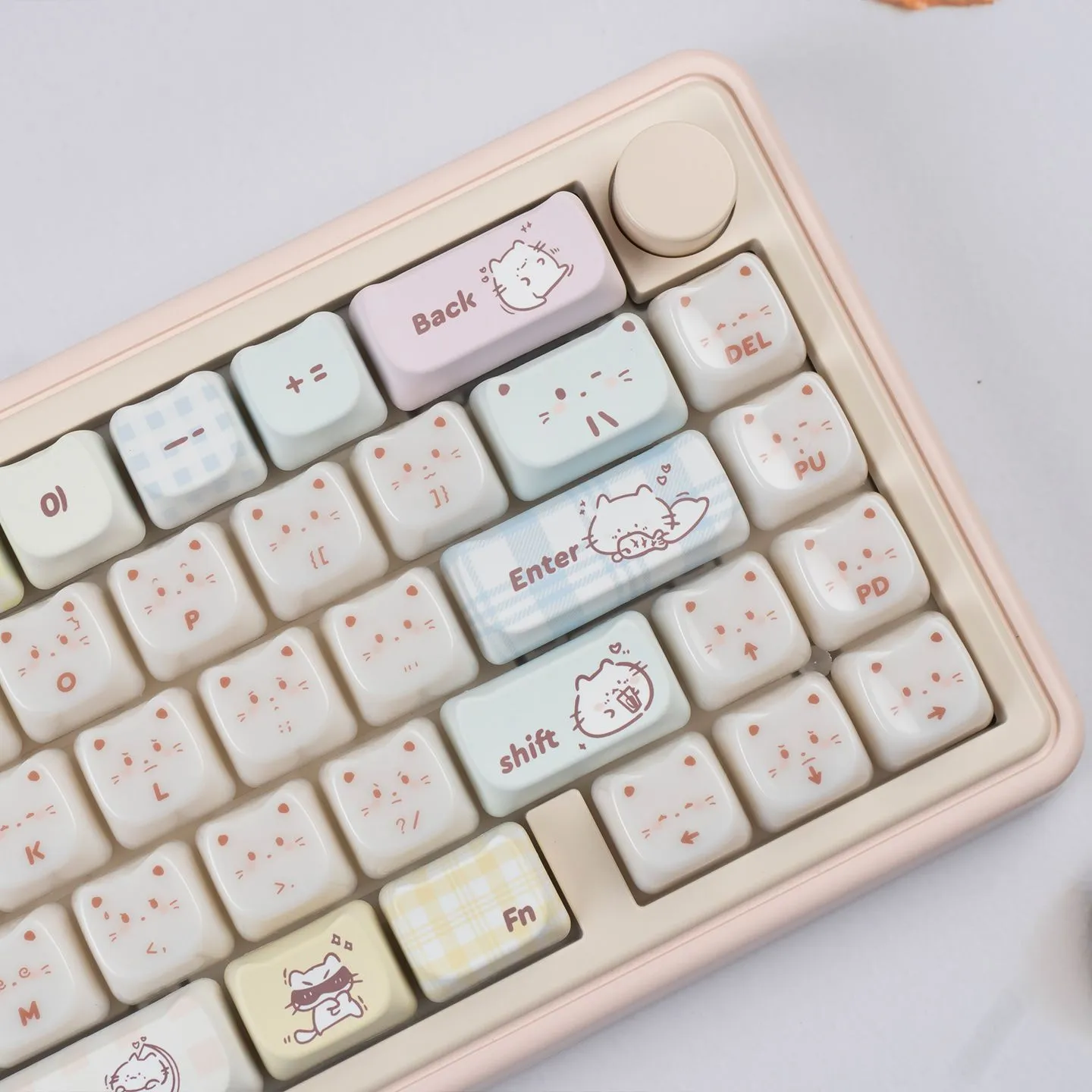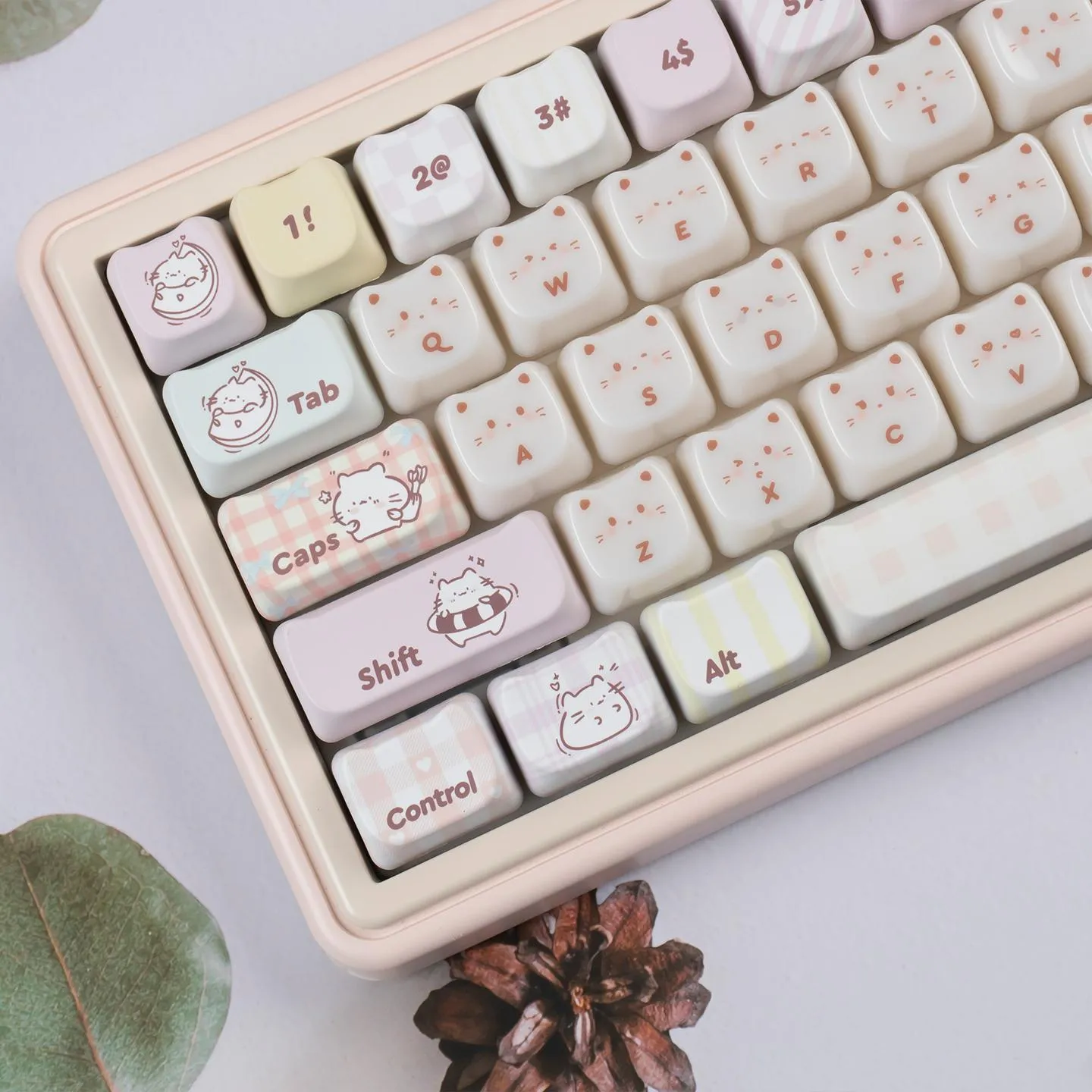 Delight your keyboard with the charming Gluttonous Cat MAO Keycap Set! This charming series has a lively look with bright keycaps. Which in white, yellow, purple and other colors set on a beige base. Each keycap adds personality to your setup with its distinctive brown lettering in a chic design. The majority of keycaps feature adorable cat expression icons. That perfectly capture our furry companions lively nature. Notably, cute cat icons can be found on keycaps such as ESC, Tab and Shift Key. This set is made of sturdy PBT/PC material and features a lattice art style throughout. This keycap set is ideal for cat enthusiasts and gives any keyboard a playful touch!