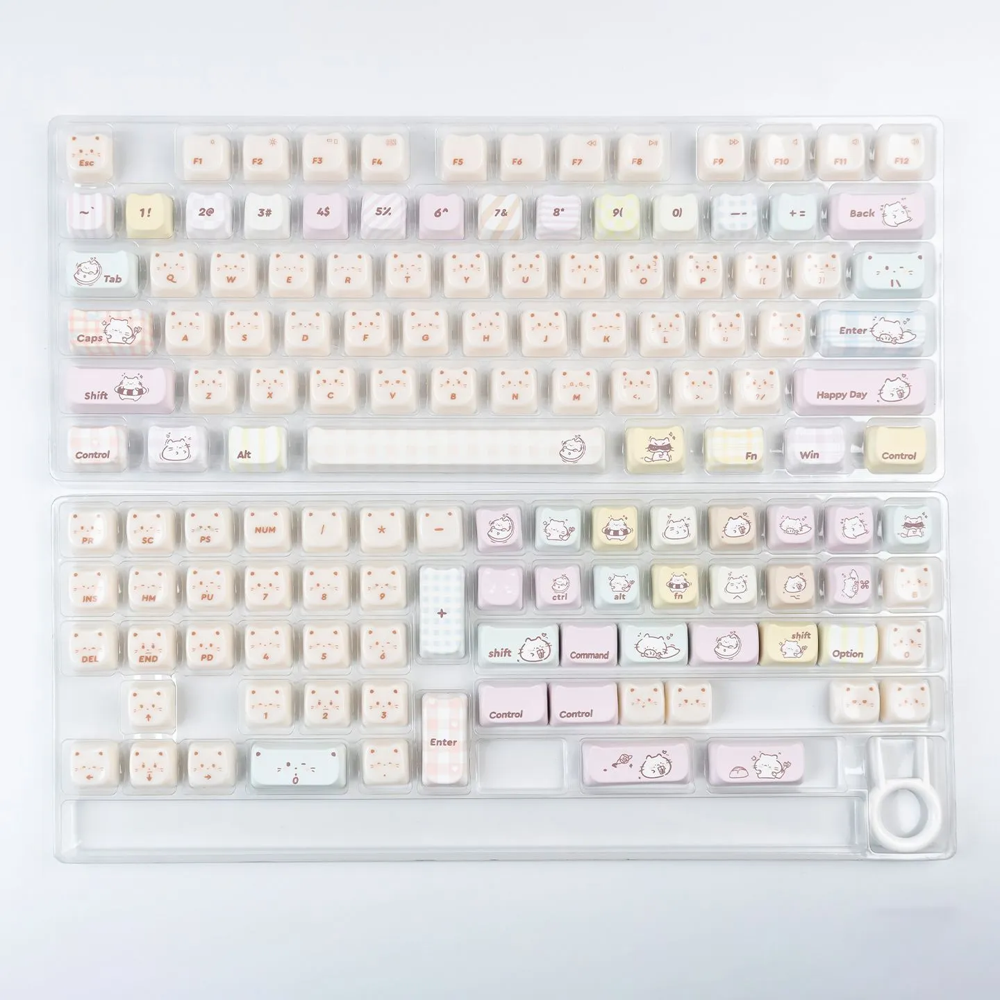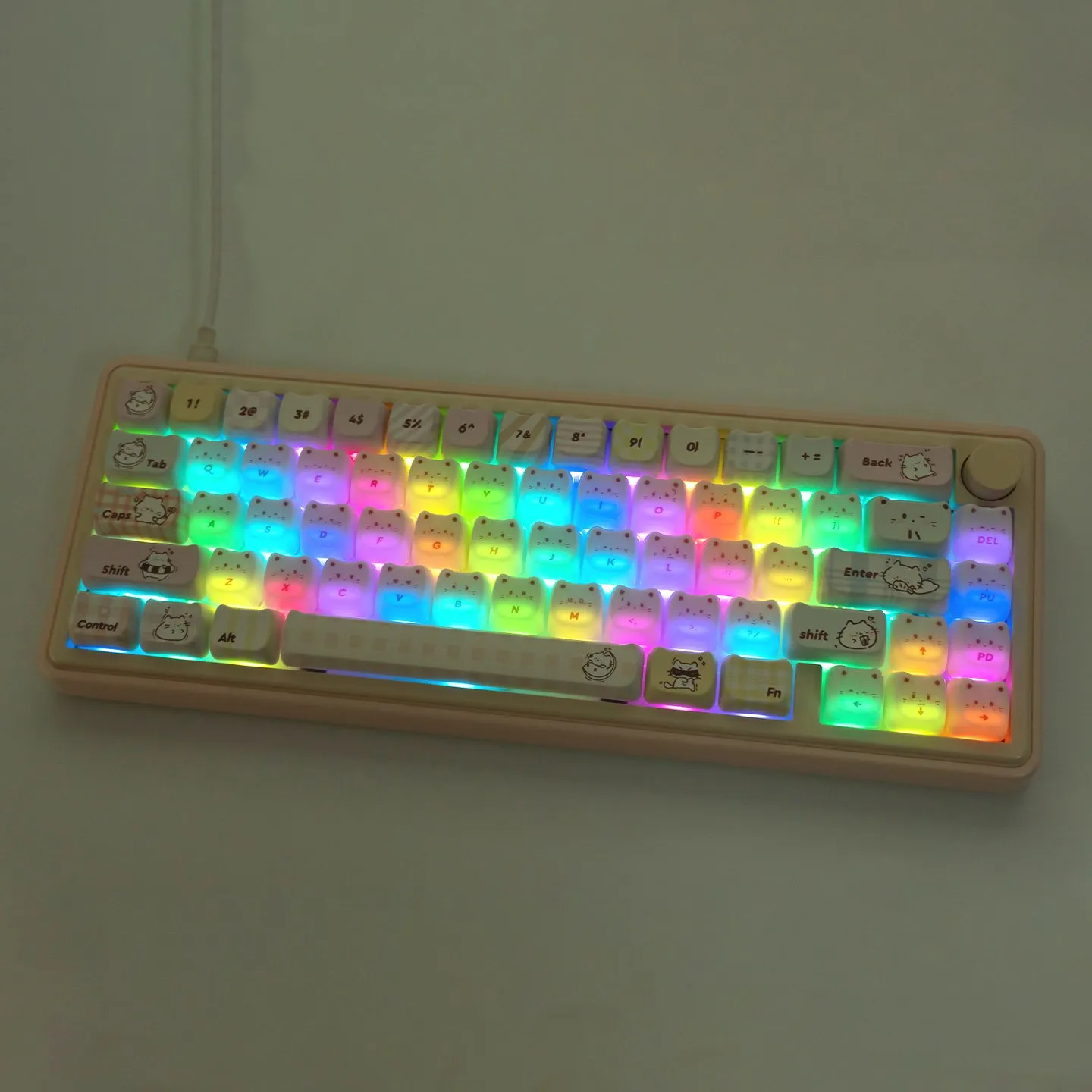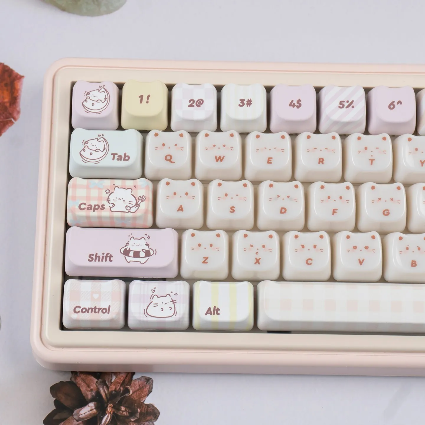 Delight your keyboard with the charming Gluttonous Cat MAO Keycap Set! This charming series has a lively look with bright keycaps. Which in white, yellow, purple and other colors set on a beige base. Each keycap adds personality to your setup with its distinctive brown lettering in a chic design. The majority of keycaps feature adorable cat expression icons. That perfectly capture our furry companions lively nature. Notably, cute cat icons can be found on keycaps such as ESC, Tab and Shift Key. This set is made of sturdy PBT/PC material and features a lattice art style throughout. This keycap set is ideal for cat enthusiasts and gives any keyboard a playful touch!