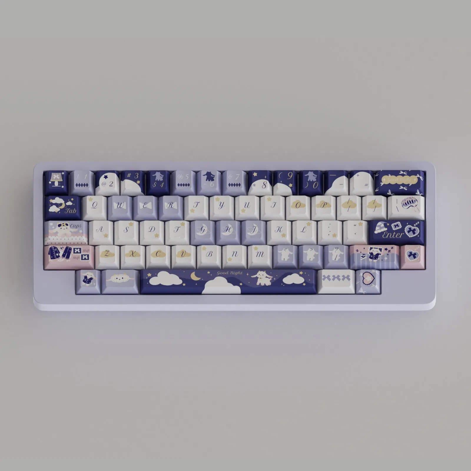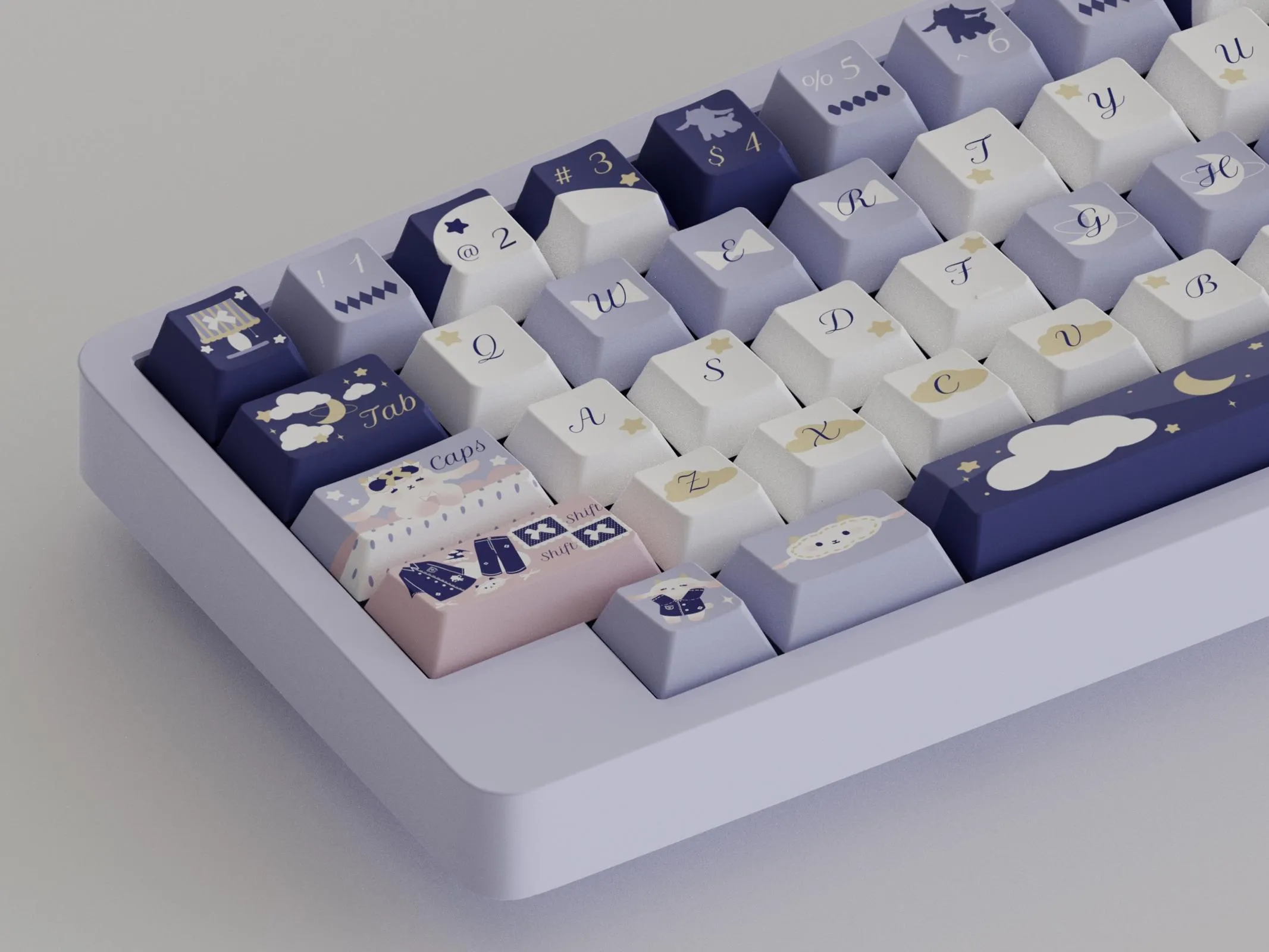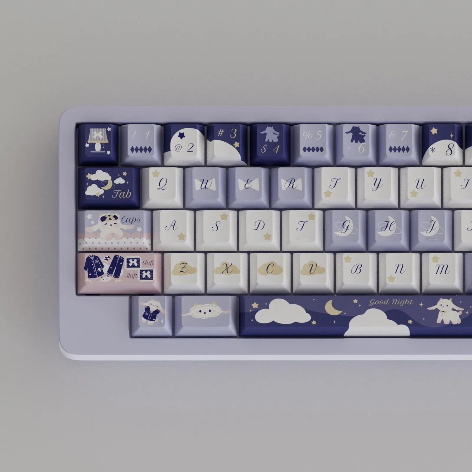 Alter your typing experience with the enchanting Goodnight Sheep Cherry Keycap Set! Cherry Keycap Set and Cherry Supplement Keycap Set are the two alternatives available in this lovely collection. This set gives any keyboard a whimsical touch. By with its lovely combination of white, blue, purple and pink keycaps. Each keycap stands out because to the distinctive blue lettering that improves the overall look. Keycaps like the Space Key and Tab Key have adorable cloud icons. Then the ESC Key has a cute lamp icon. The directional keys have moon and heart-shaped symbols that give your setup individuality. This Cherry Profile set which made of sturdy PBT. That is ideal for any enthusiast seeking a romantic atmosphere!