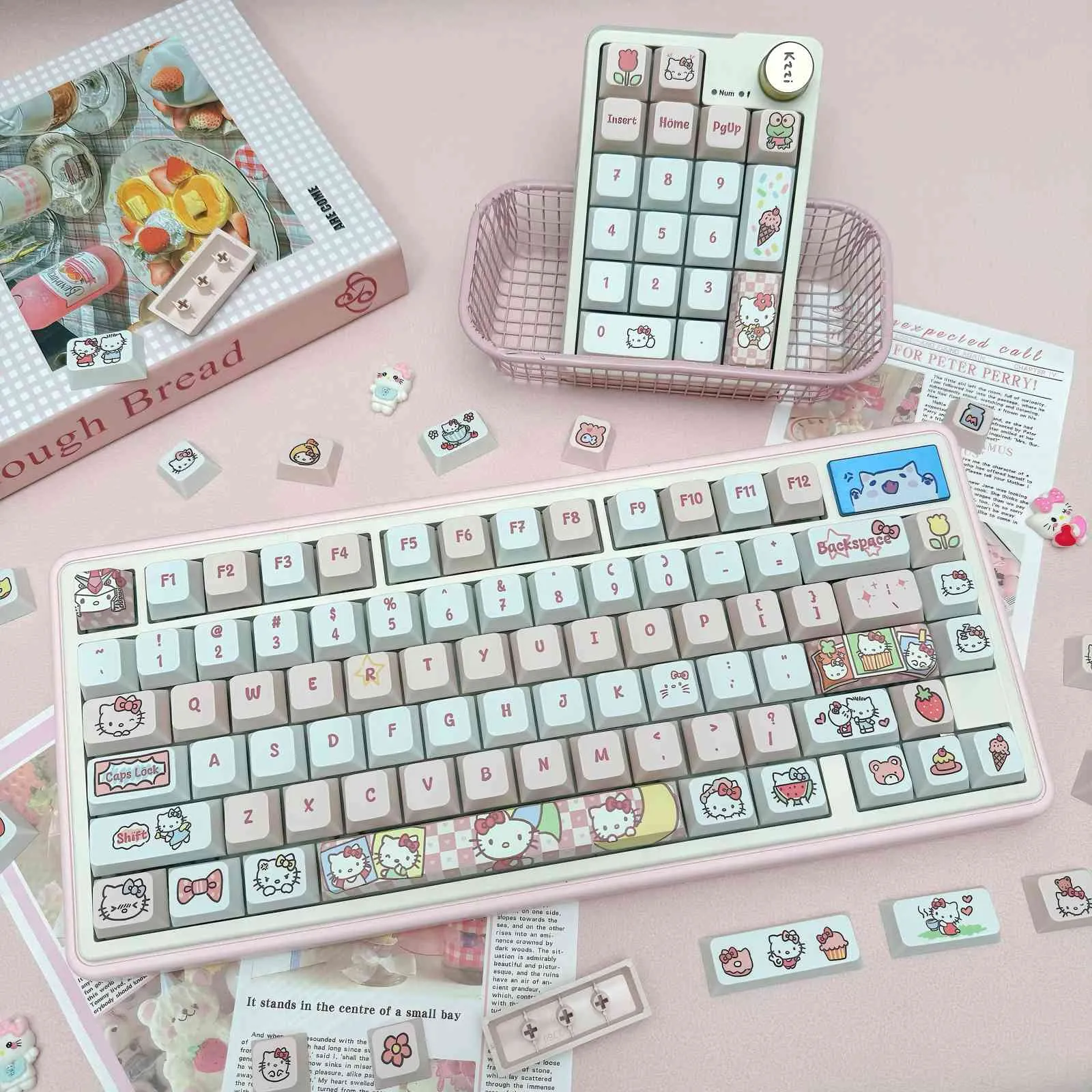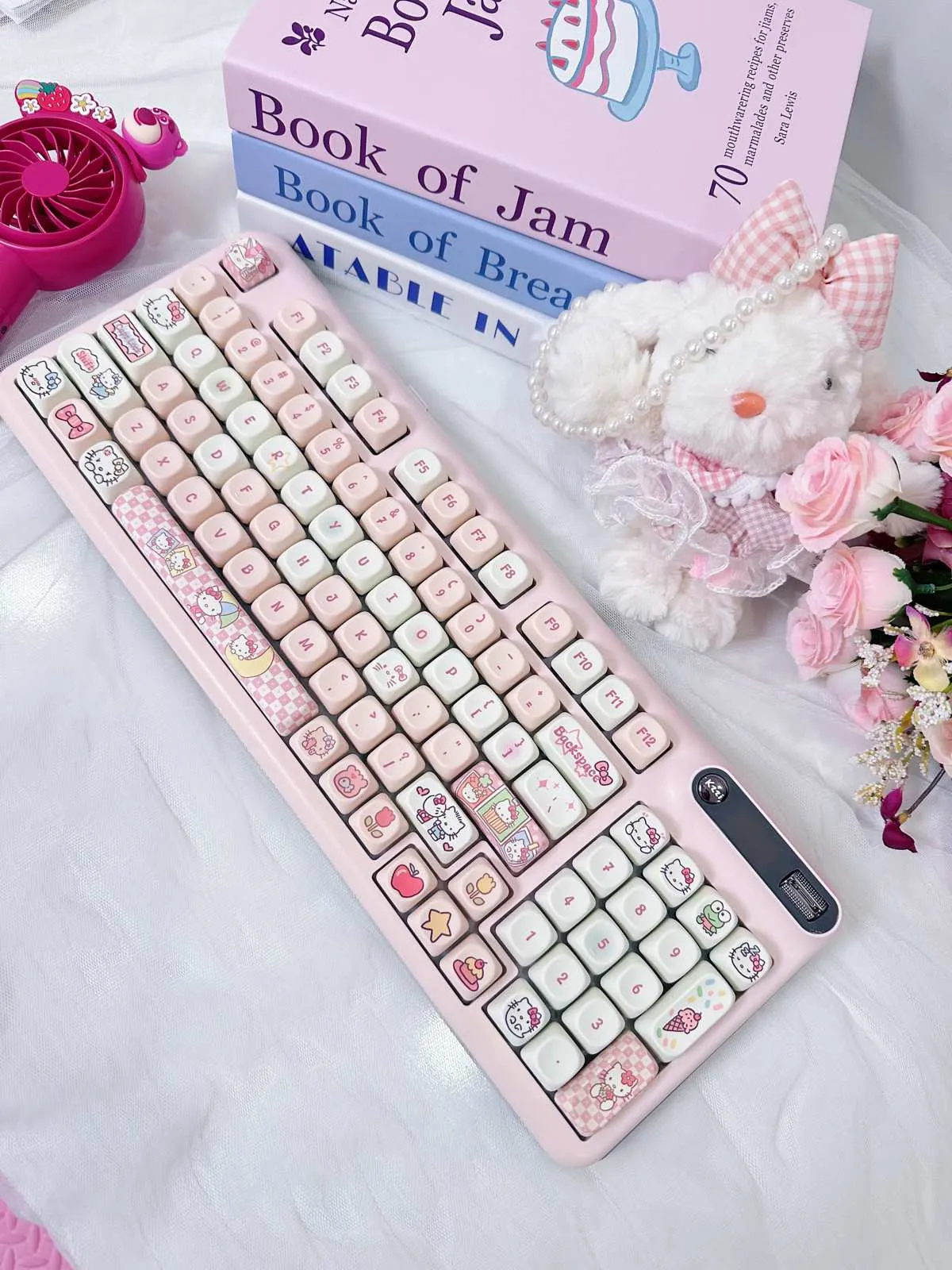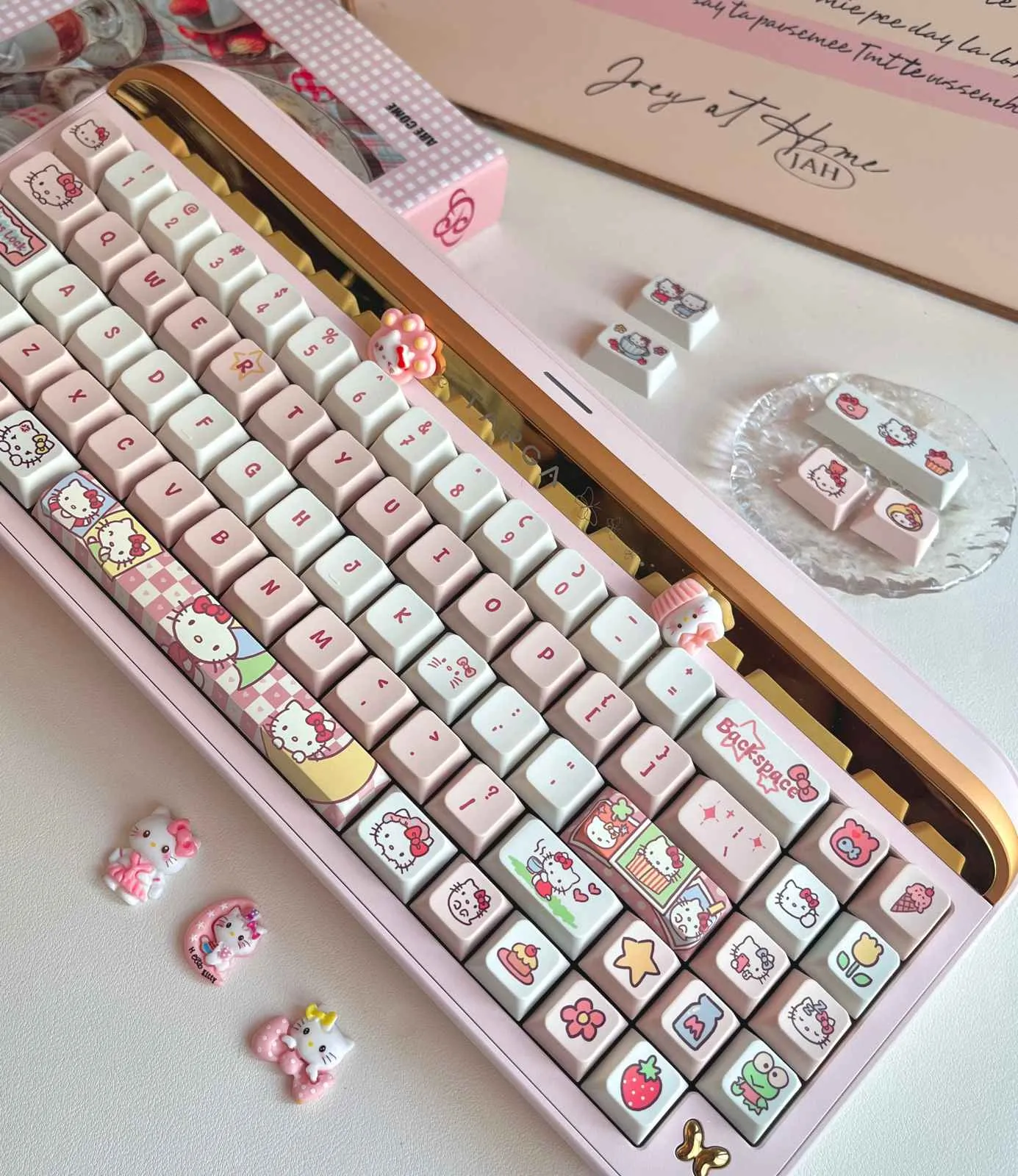 Take typing to the next level with the Hello Kitty Series Keycap Set! Choose between a Cherry Keycap Set with 95 or 118 keys. While the others profile, MOA Keycap Set with 95 or 114 keys. That both of which come in different configurations. Pink lettering in a distinctive font style adorns the beautiful pink and white keycaps in this delightful collection. Character icons on keys like Space and Enter are part of special designs. That give your keyboard a lively feel. The backspace key adds to the appeal by displaying a cute ribbon icon. These keycaps are made of sturdy PBT material and have a cozy Cherry or MOA profile for fun typing!