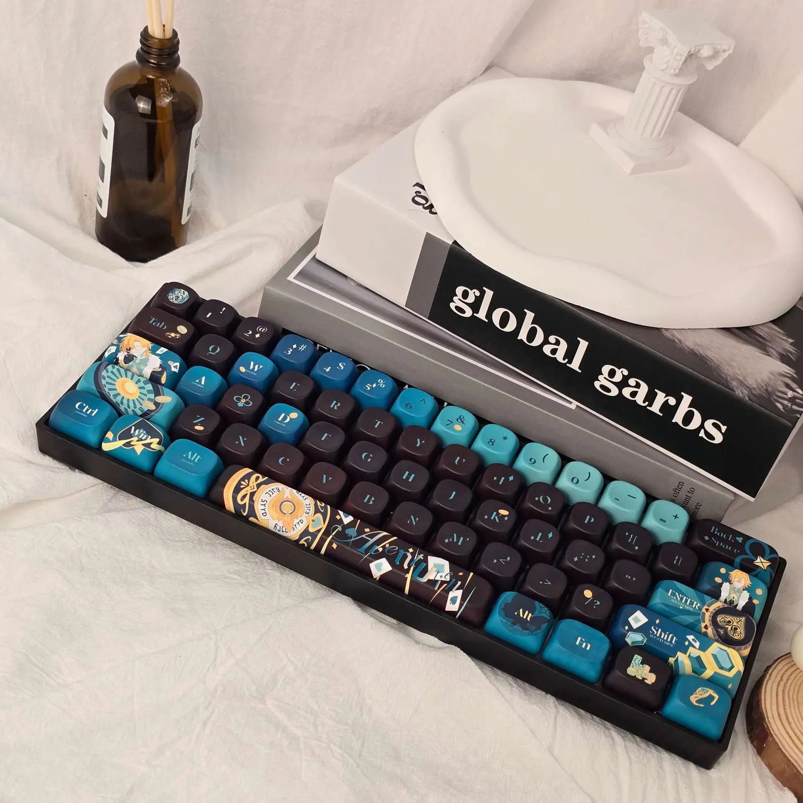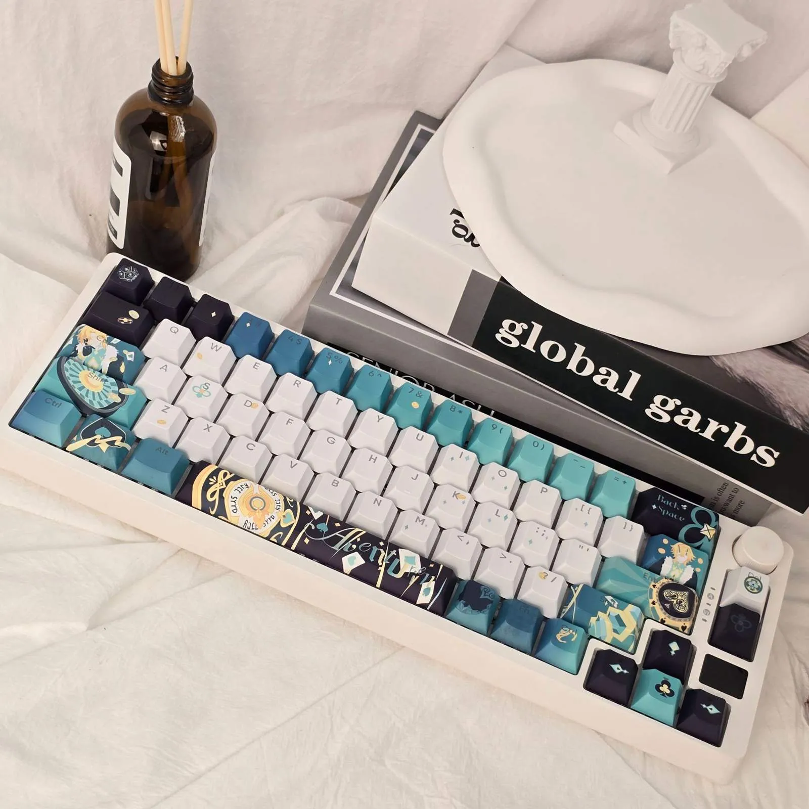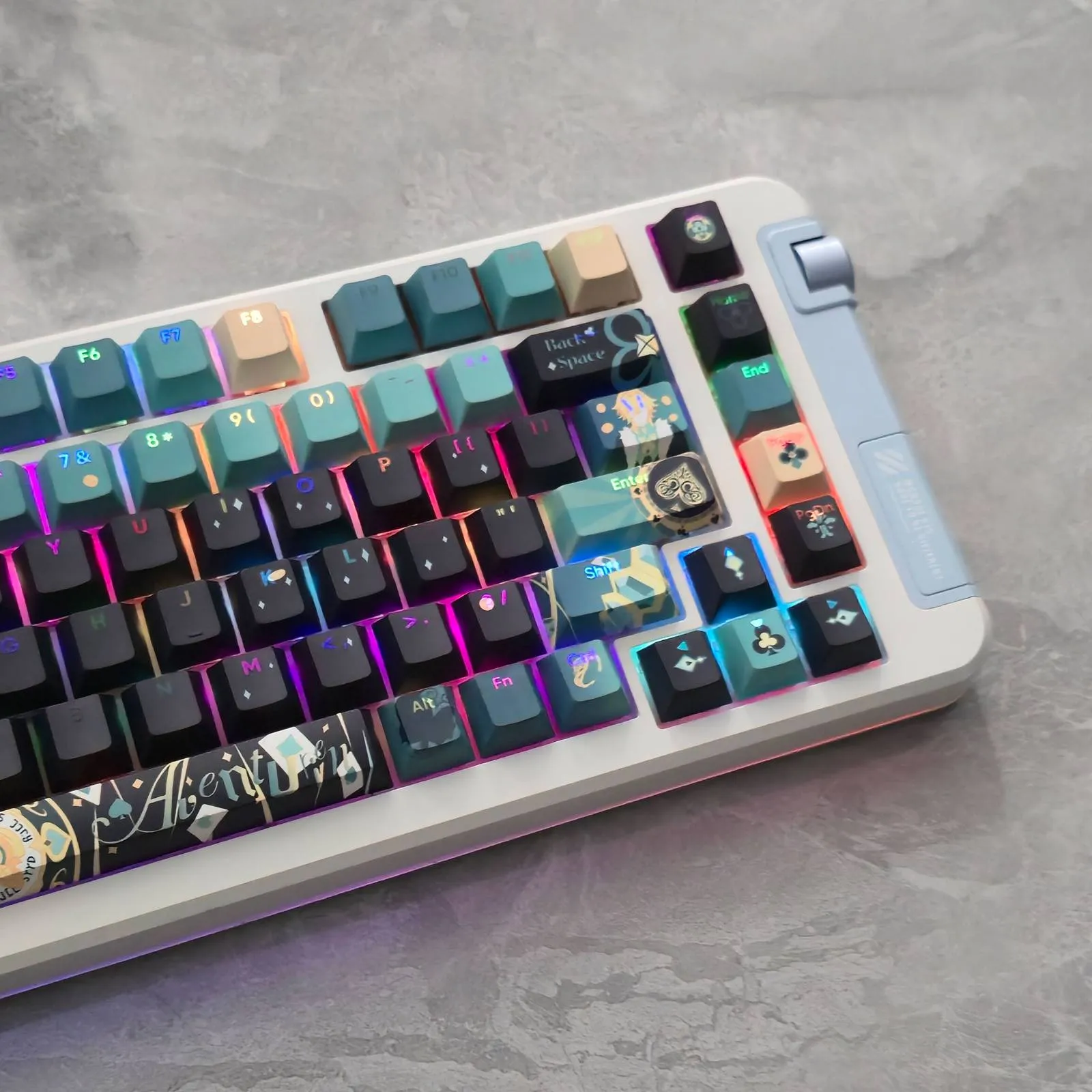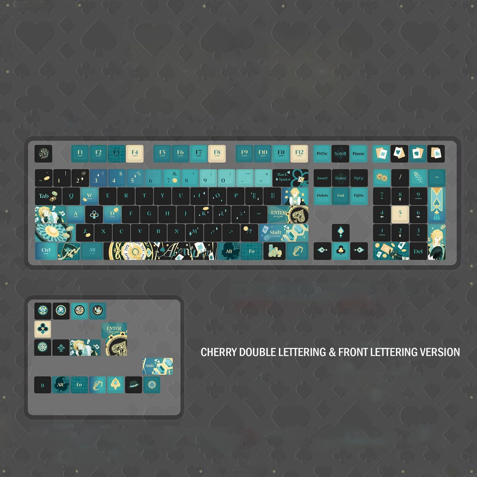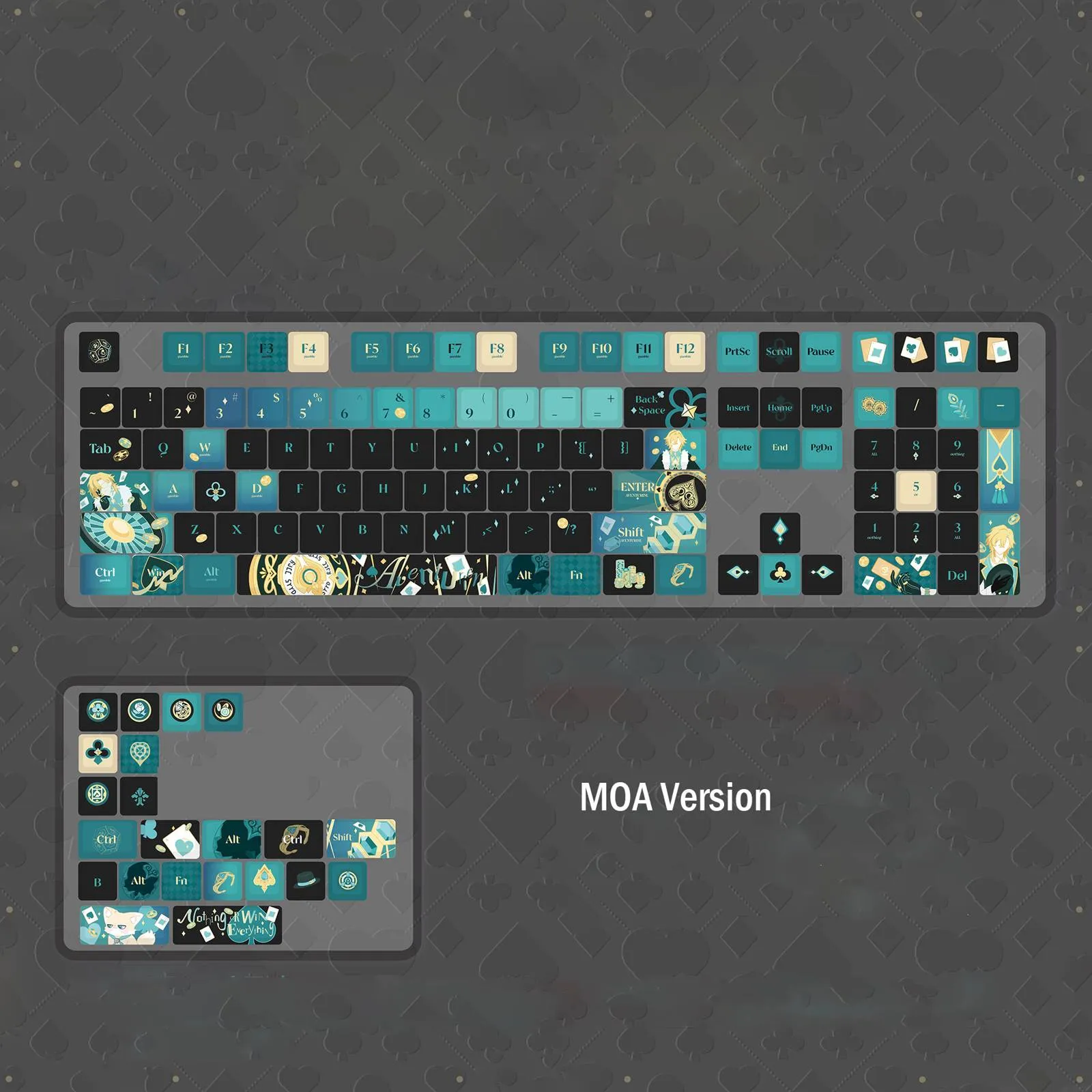 Immerse yourself in gaming world with the Honkai: Star Rail Aventurine Series Keycap Set to elevate you typing experience! Classic black or pure white are two eye-catching color choices. Cherry, MOA, Cherry Keycap Set with Double Lettering and Cherry Keycap Set with Front Lettering are the four categories available for each color. While the white version mixes a black base with Tiffany blue, black and yellow keycaps. Then the black variant features a gorgeous black base with Tiffany blue and yellow keycaps. A directional key with a poker card club icon. Caps Key is one of the featured distinctive character icon designs. This line which is made from sturdy PBT in Cherry and MOA profiles. That effortlessly combines fashion and utility!