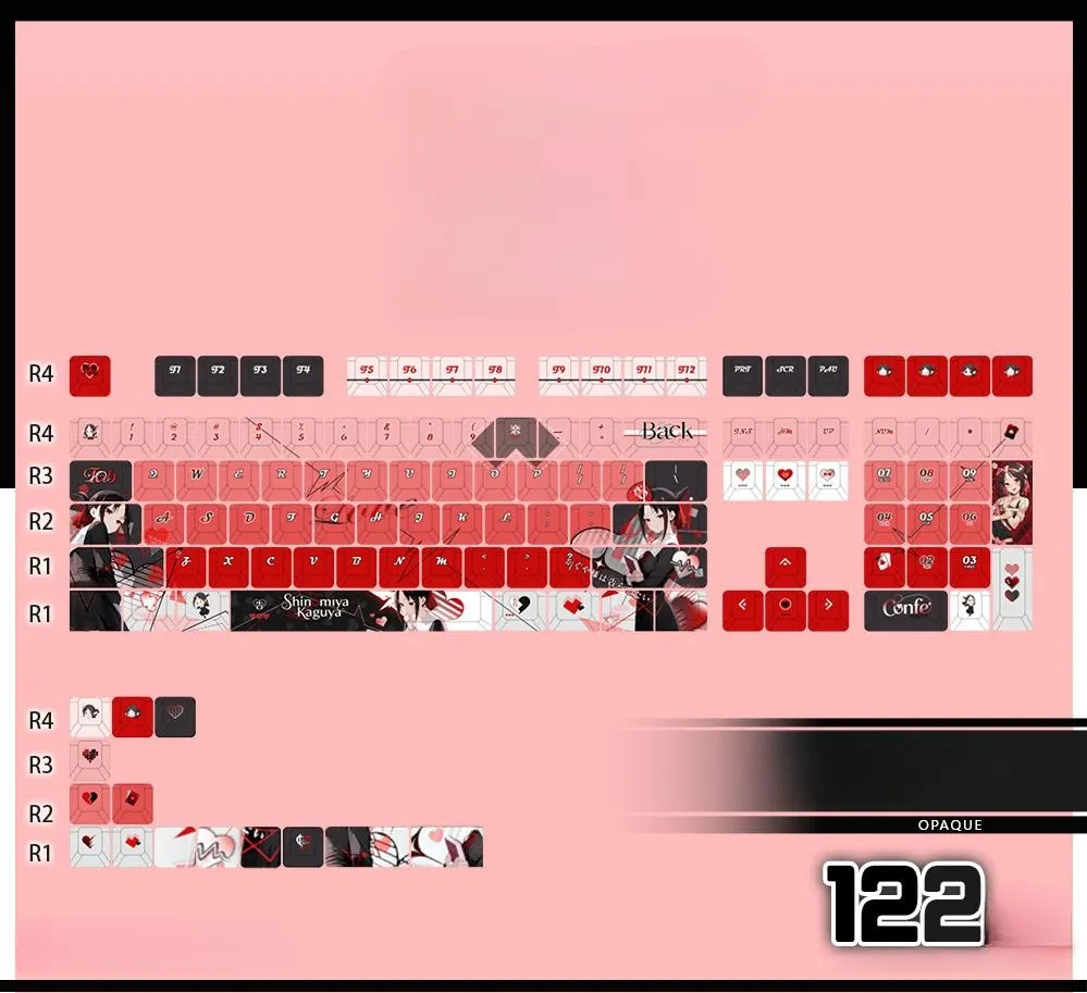 Boosts your typing experience with the captivating Kaguya-sama: Love Is War: Kaguya Shinomiya Cherry Keycap Set & Mechanical Keyboard! Front-Lit, Side-Lit and Opaque keycaps are among the 15 possibilities available in this remarkable collection. Keycap Set with 122 keys, Keyboard with 87 keys, Keyboard with 108 keys or Tri Mode Keyboard are among the five options offered by each version. Pink, black and grey keycaps with distinctive black, white and red lettering. Which elegantly compliment the eye-catching red series base. Both the left and right keycaps have character icons. While the Space Key has the name “Shinomiya Kaguya.” Fans will love this Cherry Profile set which is made of sturdy PBT!