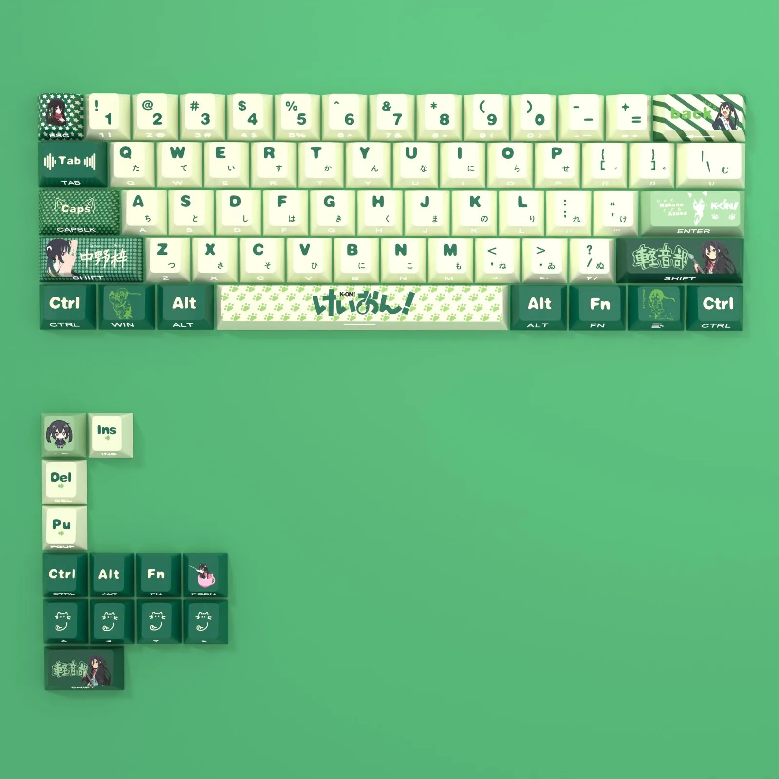 Grab the K-On!: Azusa Nakano Cherry Keycap Set to improve your typing! To match your keyboard which either the 60/68 version or the Azusa Nakano Keycap Set. Dark green keycaps contrast with a light green base in this charming set. That giving it a bright and lively appearance. Each keystroke is enhanced by the attractive addition of dark green and white lettering. Charming character icons on the ESC, Shift and Backspace keys give your setup personality. This keycap set which combines fun and functionality. That is ideal for gamers and fans alike. It is made of sturdy PBT material and has a cozy Cherry profile.