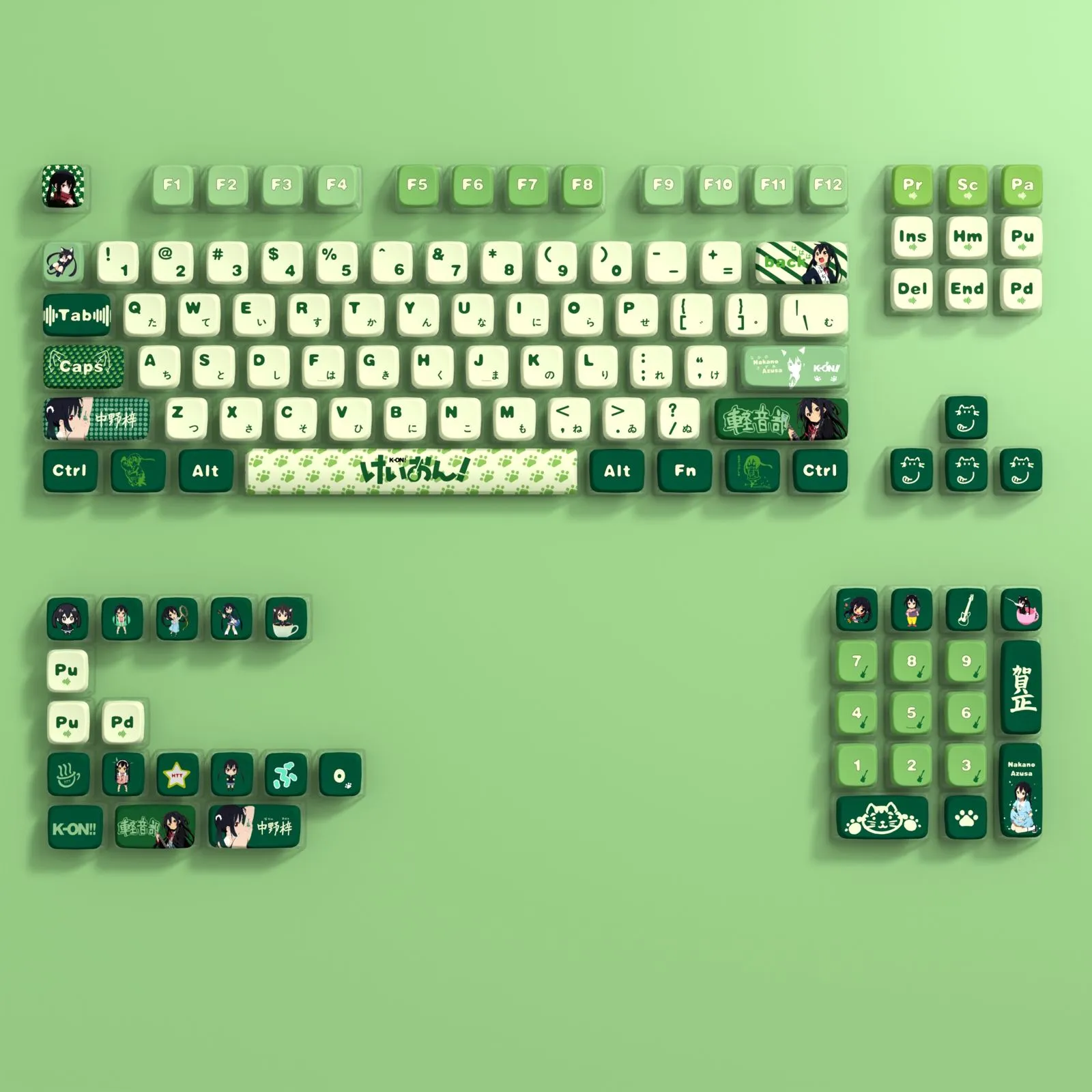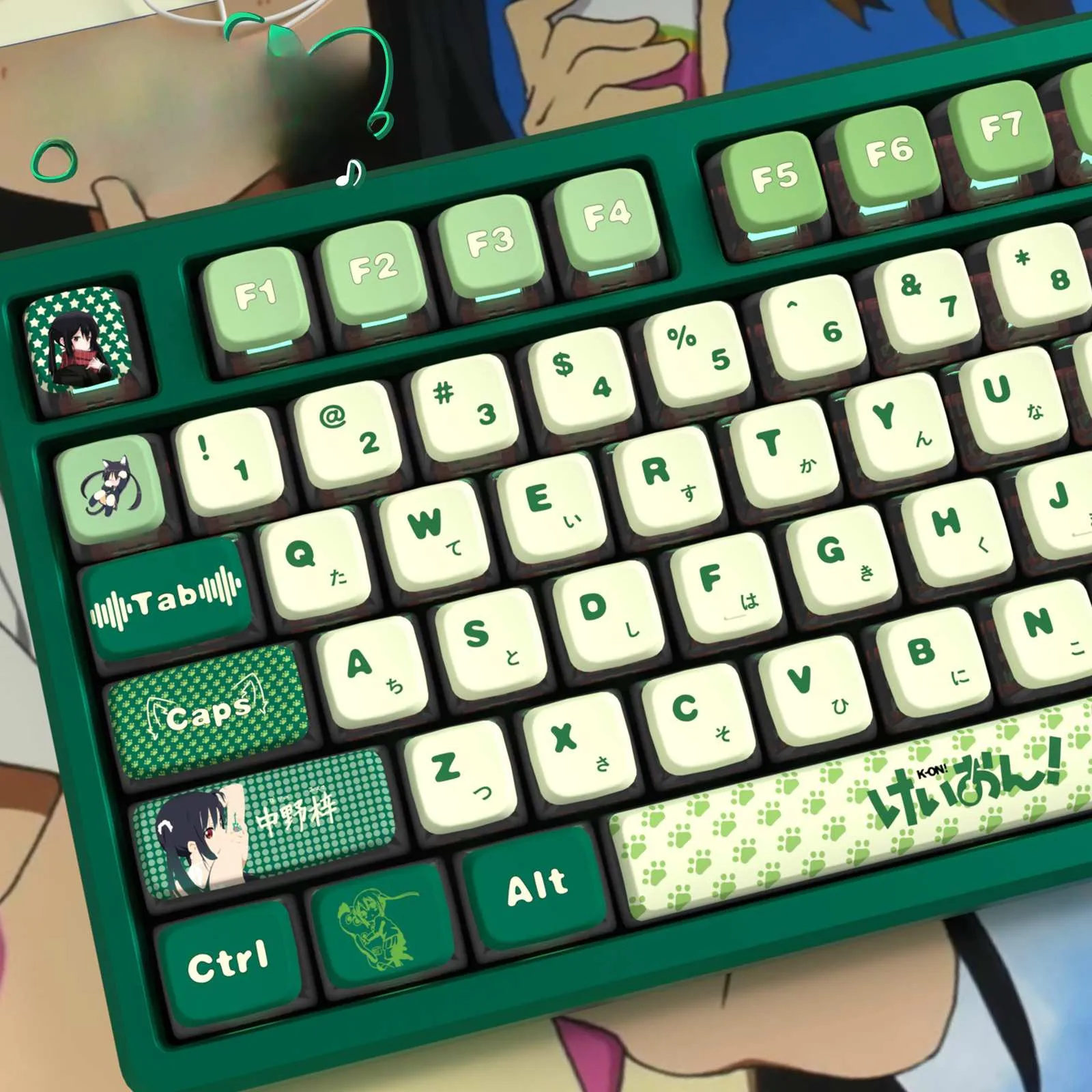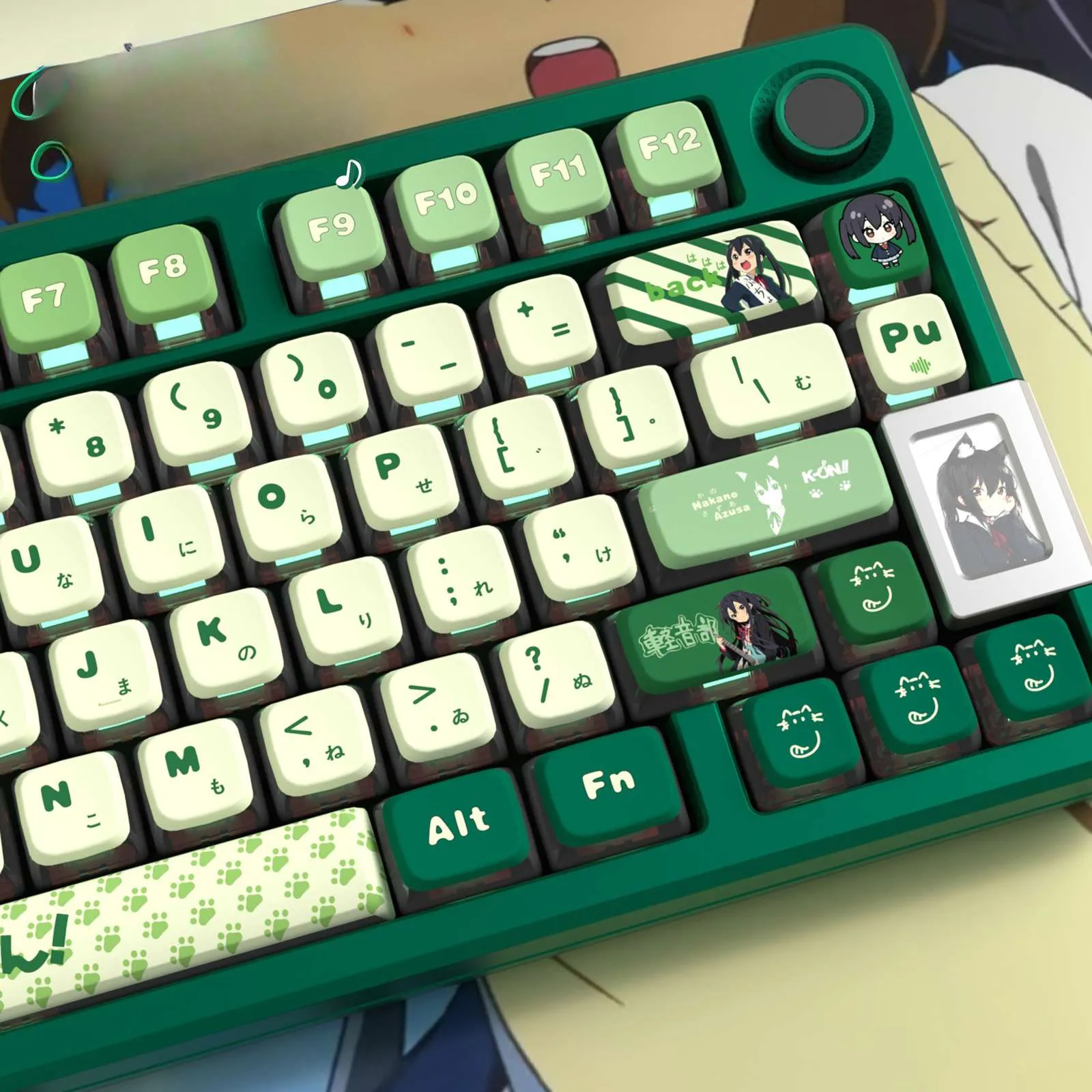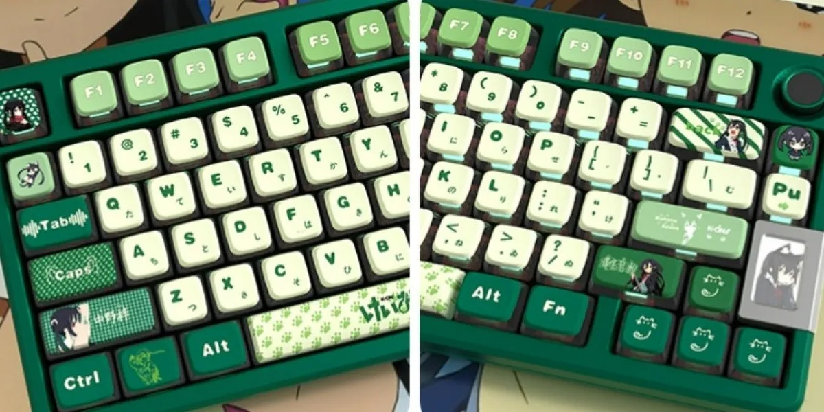 Customize your keyboard with the K-On!: Azusa Nakano OEM Keycap Set! This set gives your setup a fun touch with its light green base and dark green keycaps. Every keystroke is made more pleasurable by the white and dark green lettering. Which improves visibility and flair. Your typing experience is made more charming and unique by the character icons. That is appear on the ESC, Shift and Backspace keys. An lovely cat emblem on the directional keys honors Azusa’s persona. This keycap set is ideal for gamers and fans alike. Because it is made from a combination of sturdy PBT and PC materials. Which is shaped like an OEM profile for comfort.