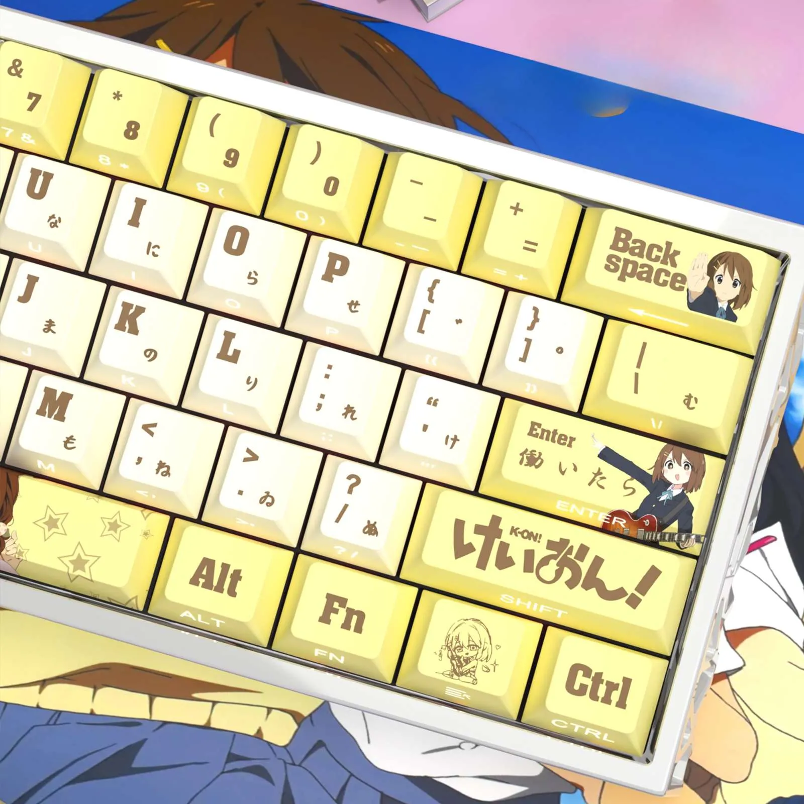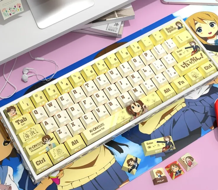 Upgrade your keyboard with the K-On!: Yui Hirasawa Cherry Keycap Set! Full Keycap Set or Keycap Set compatible with 60/68 layouts are the two options available for this charming set. Any fan will grin when they see this set. Which has a lively yellow keycap set against a brilliant white base. Unique brown lettering in a chic design adorns each keycap. Character icons on the Space Key, Enter Key, Backspace Key and other keys are examples of notable designs. With pride the Shift Key shows the words “K-ON.” This keycap set is ideal for adding flair to your setup. Because it is made of sturdy PBT material and has a cozy Cherry profile.