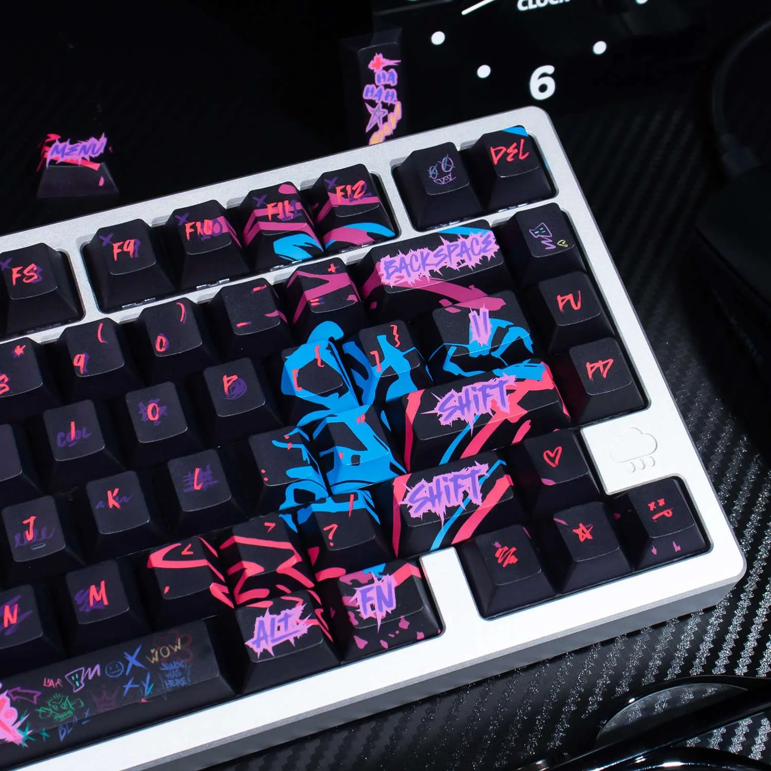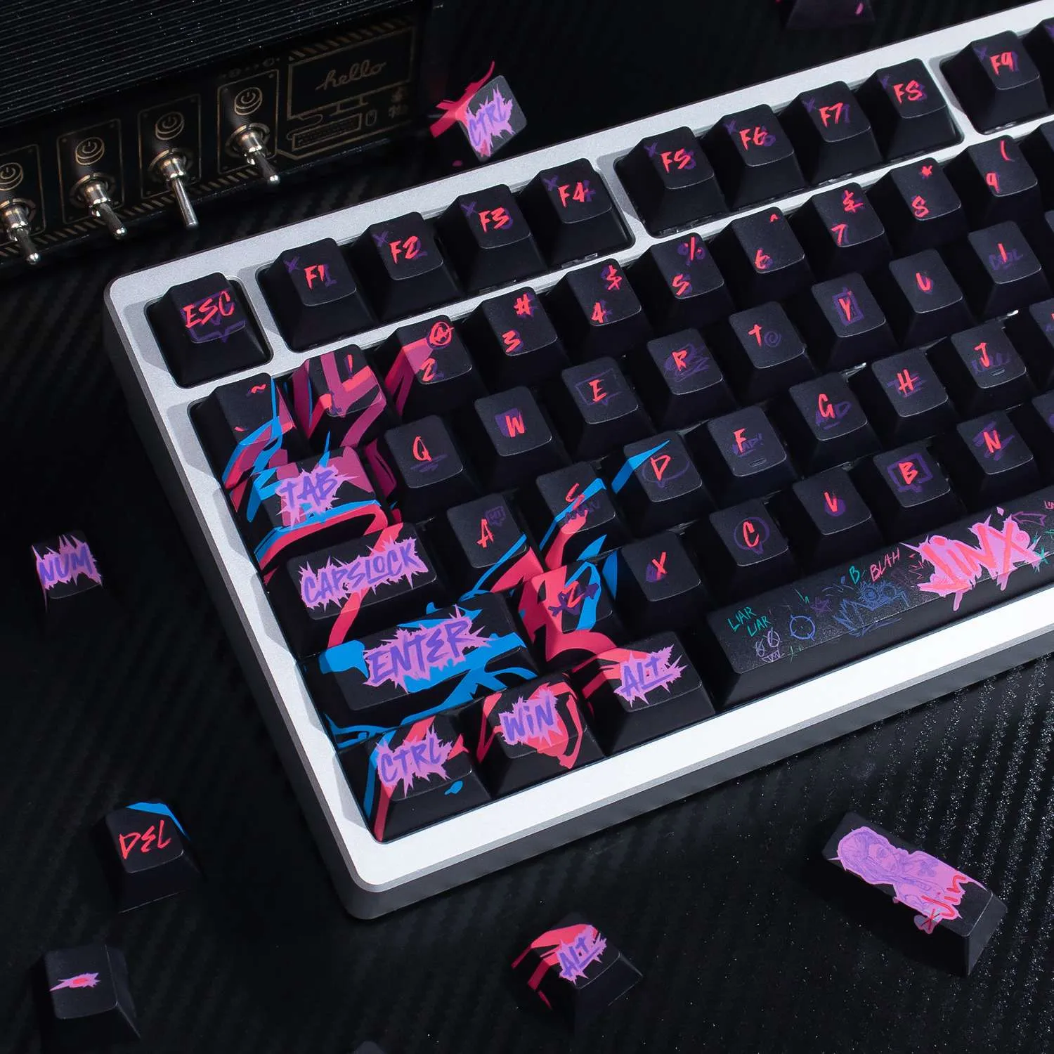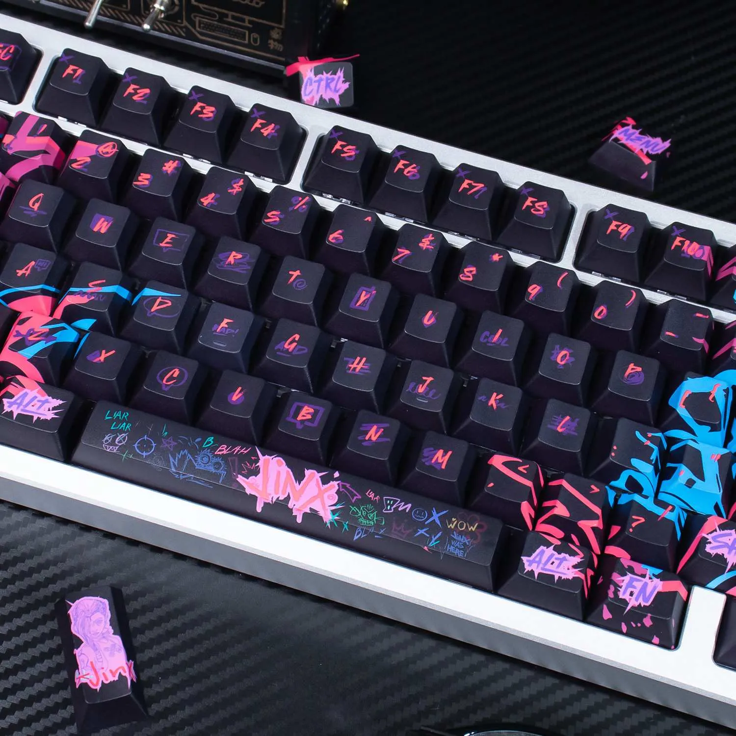 Transform your keyboard with the vibrant League of Legends: Jinx Cherry Keycap Set! Sleek black keycaps in this eye-catching collection. That provide a stunning background for vibrant pink and purple text in a distinctive font style. Interestingly, the Space Key prominently displays the name “Jinx.” That giving your arrangement a unique flair. The whimsical and rebellious nature of Jinx is reflected in the graffiti art graphics that adorn each keycap. This keycap set’s long-lasting quality and comfort. Which are guaranteed by its construction from sturdy PBT material. It is ideal for League of Legends players who want to add flair and individuality to gaming experience. Because of its comfortable Cherry profile design!