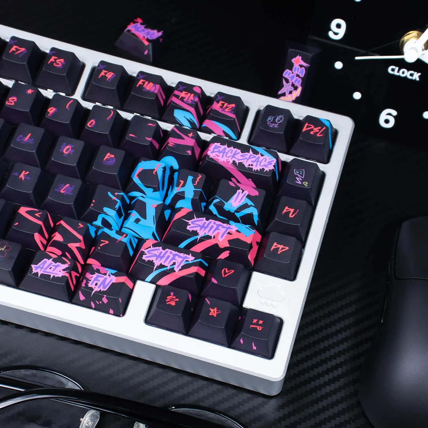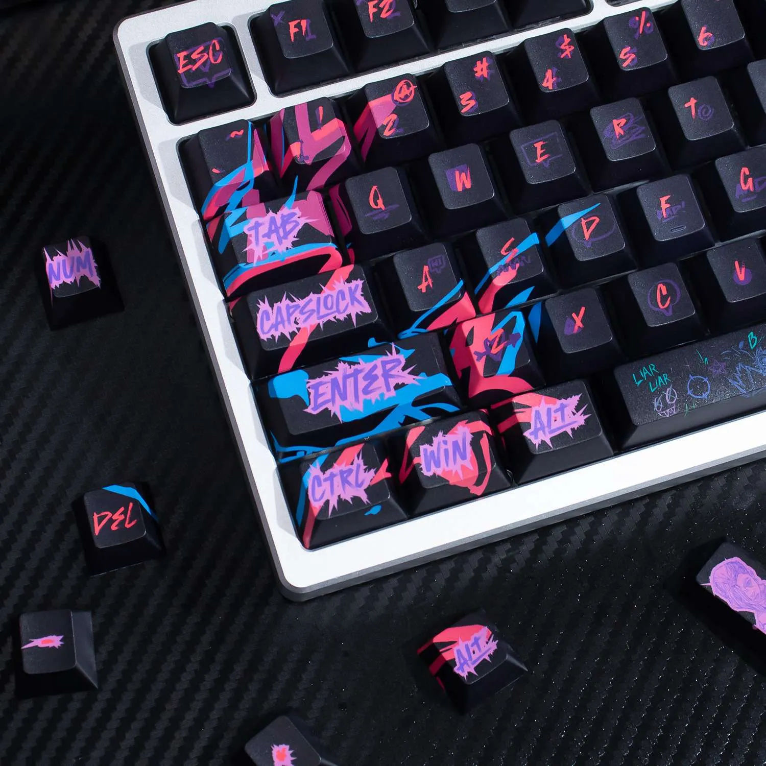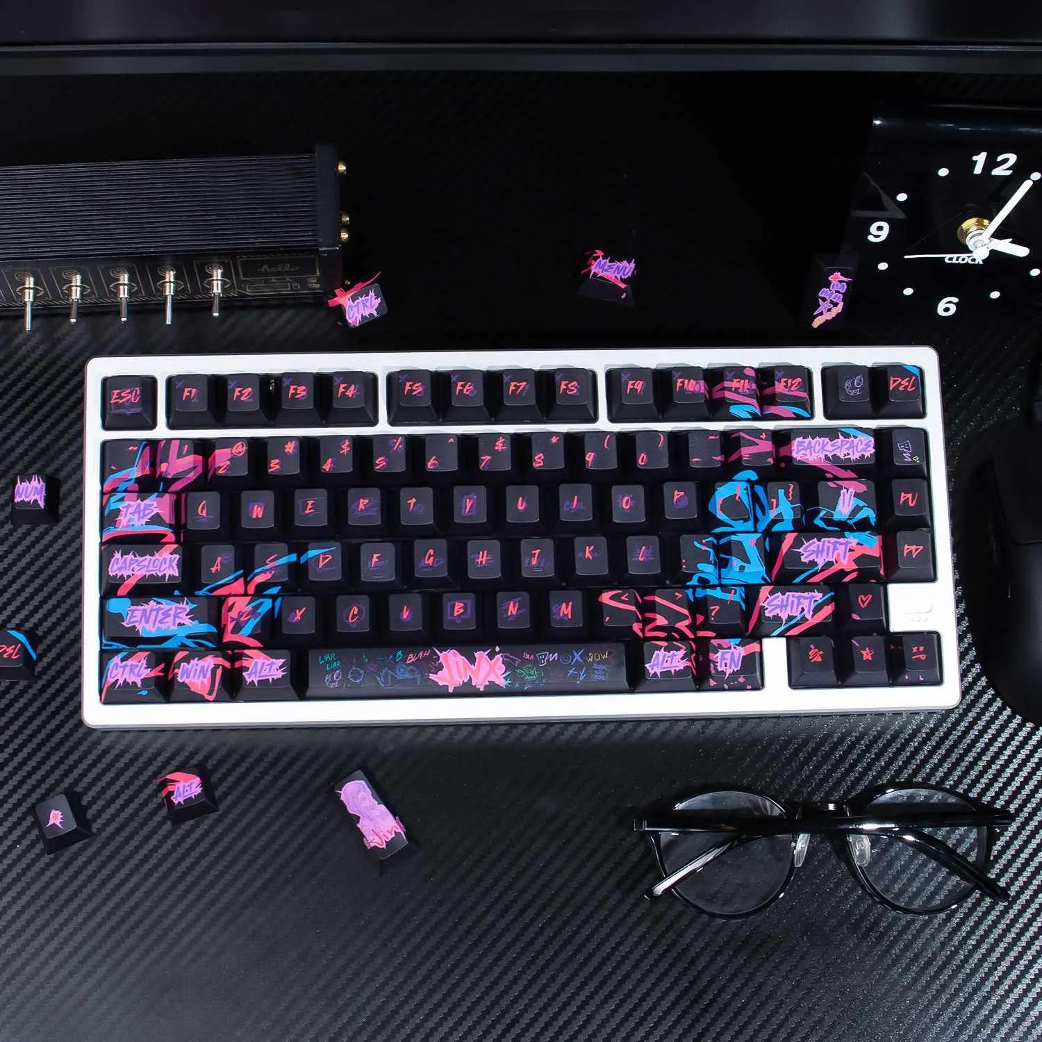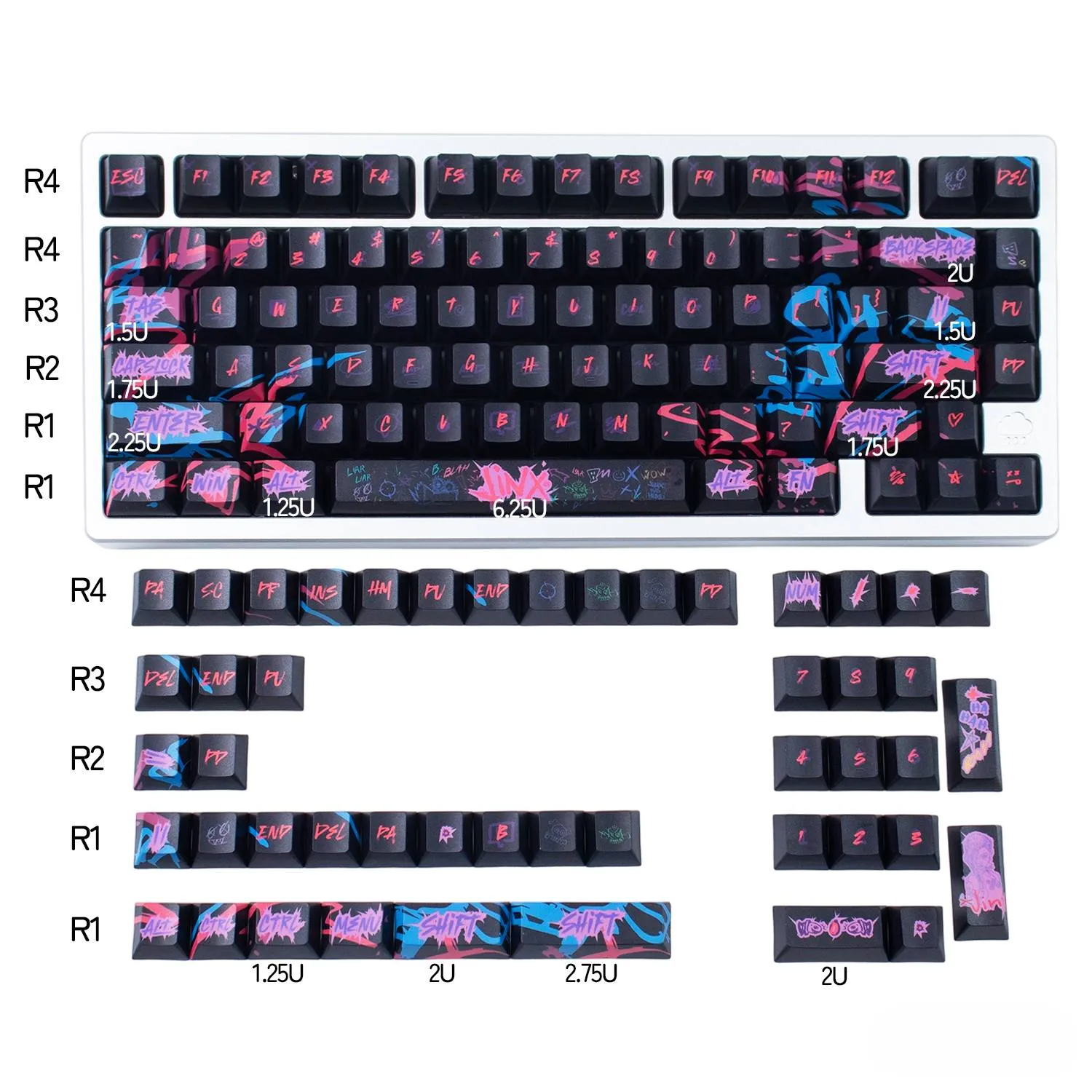 Transform your keyboard with the vibrant League of Legends: Jinx Cherry Keycap Set! Sleek black keycaps in this eye-catching collection. That provide a stunning background for vibrant pink and purple text in a distinctive font style. Interestingly, the Space Key prominently displays the name “Jinx.” That giving your arrangement a unique flair. The whimsical and rebellious nature of Jinx is reflected in the graffiti art graphics that adorn each keycap. This keycap set’s long-lasting quality and comfort. Which are guaranteed by its construction from sturdy PBT material. It is ideal for League of Legends players who want to add flair and individuality to gaming experience. Because of its comfortable Cherry profile design!
