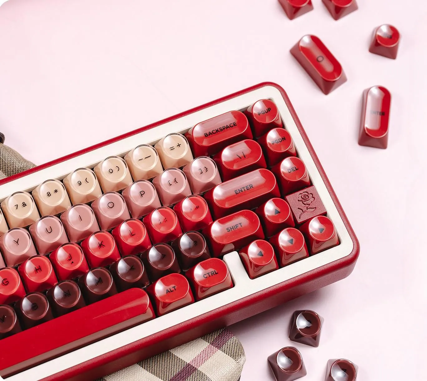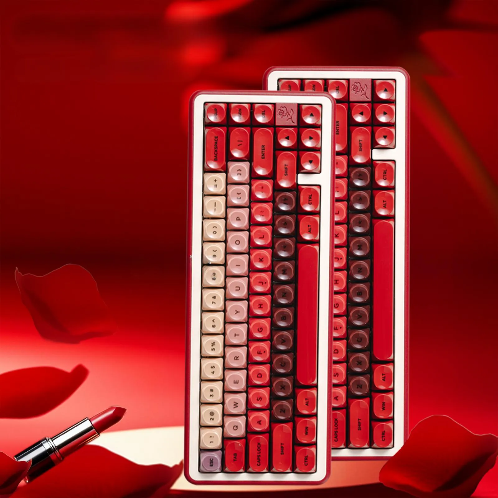 Utilize with the Lipstick Themed MOA Keycap Set to upgrade your keyboard! A gorgeous blend of red, beige, brown, purple and pink keycaps. That epitomize beauty can be found in this lively collection. Every keycap features distinctive font styles with black writing. Which giving your typing experience a refined touch. These keycaps are made of sturdy PBT and PC materials. Which guarantee their lifespan and high-end feel. They are ideal for extended typing sessions because of the comfort that the MOA profile provides. Create a fashionable item out of your keyboard that expresses your individuality and love of makeup. Upgrade your setup right now with this adorable keycap set!