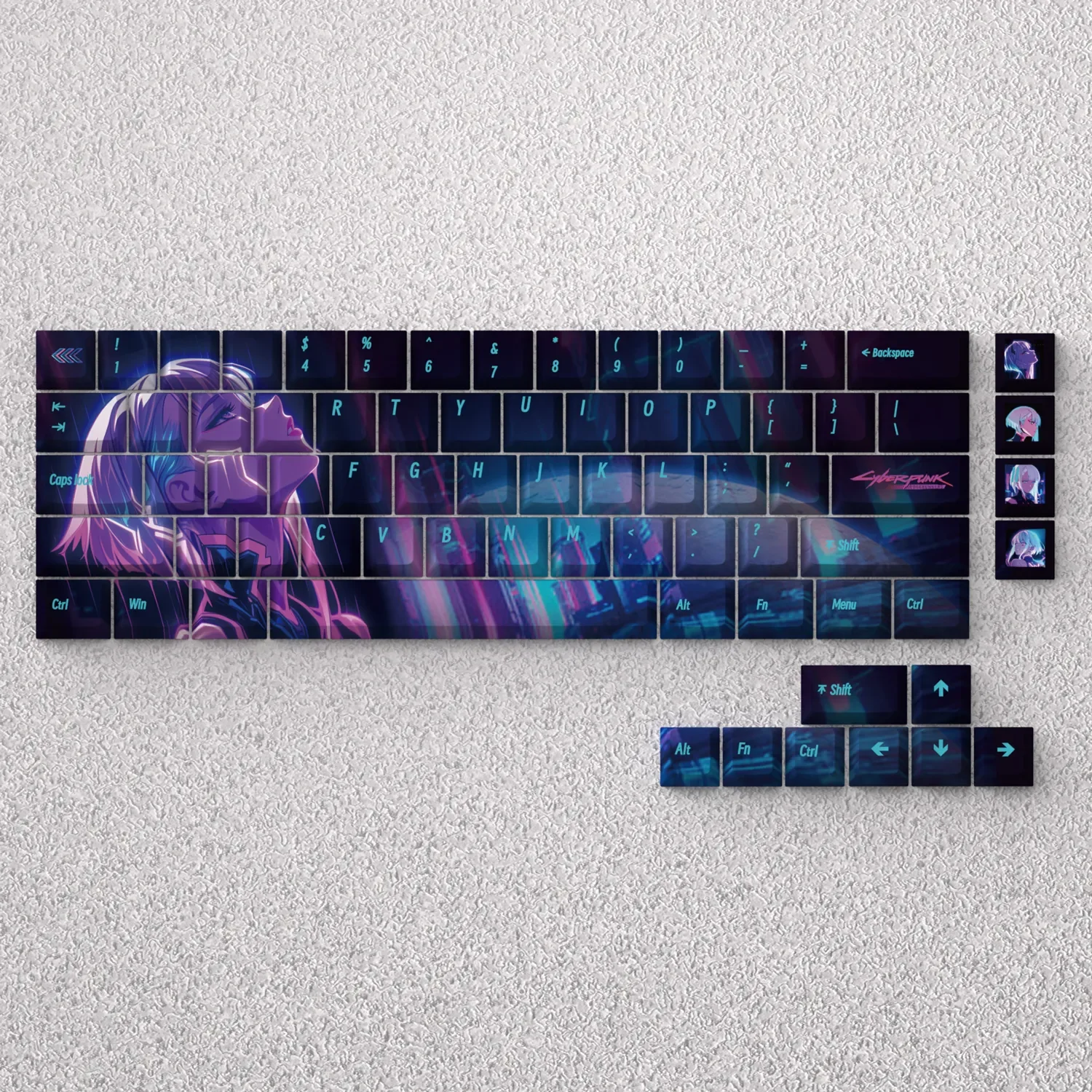 Iconic Lucy Cyberpunk Edgerunners anime keycaps set for mechanical keyboards, displaying its vibrant neon-noir aesthetic and intricate character art.