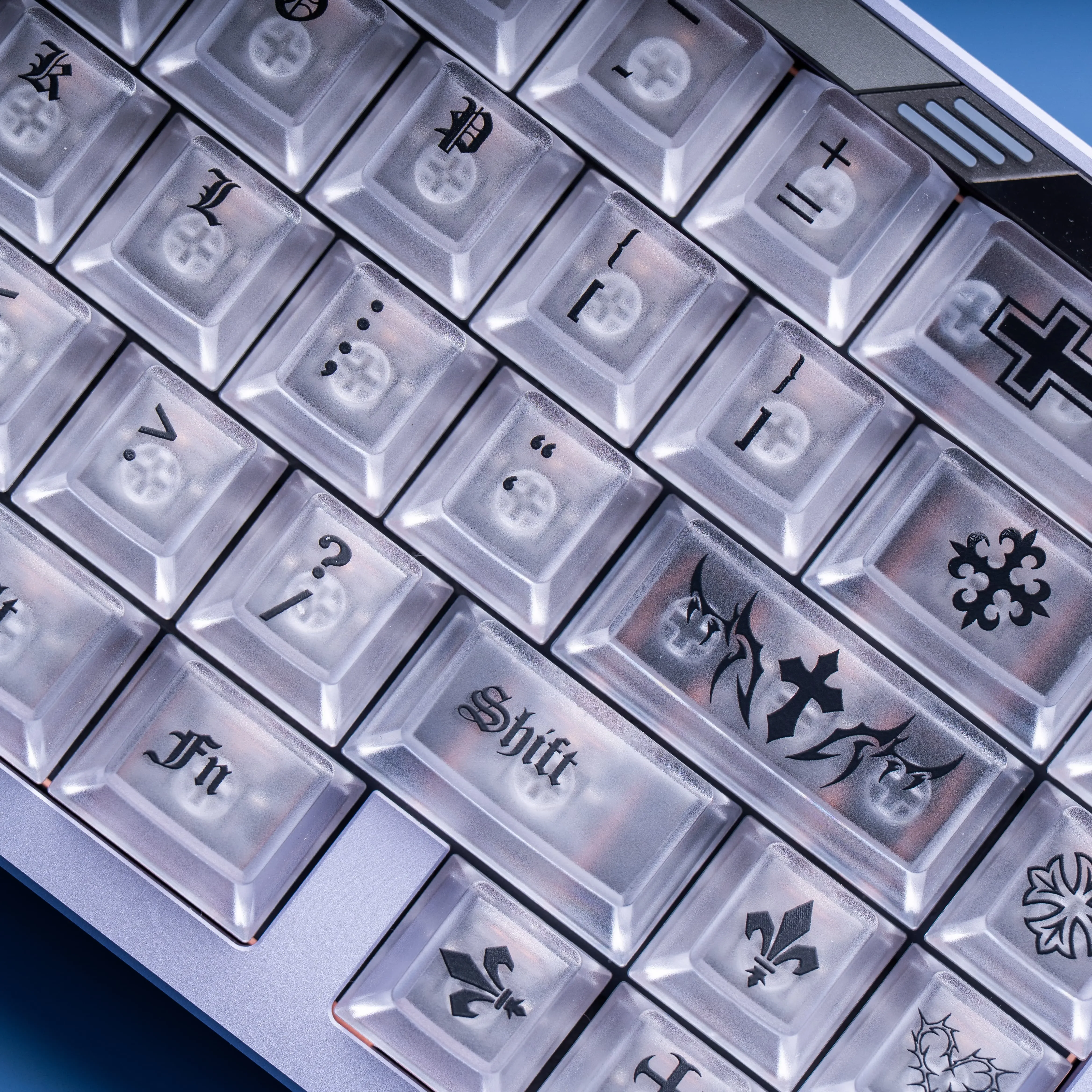Elevate your keyboard to an art piece with our Frosted Chrome Hearts Cherry Keycap Set, crafted for individuality and elegance. Made from premium Frosted PC material, these translucent white keycaps offer a unique visual and tactile experience, transforming your setup into a statement of rebellious sophistication. Engineered with precise Magnetic Switch Compatibility, they ensure seamless performance and responsiveness for your Hall Effect keyboards. The classic Cherry Profile provides ergonomic comfort, ideal for gaming, creative work, or collecting. This PC Keycap Set features subtle gothic-inspired contours, adding intriguing depth to its modern aesthetic. Experience the excitement of a keyboard reflecting your discerning taste. Redefine your workspace with these Translucent White Keycaps.