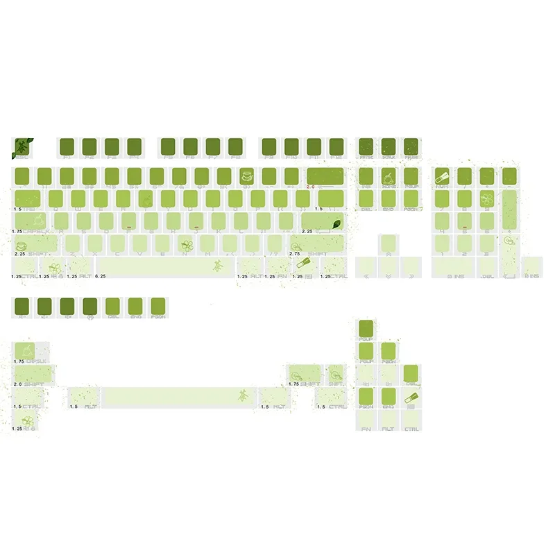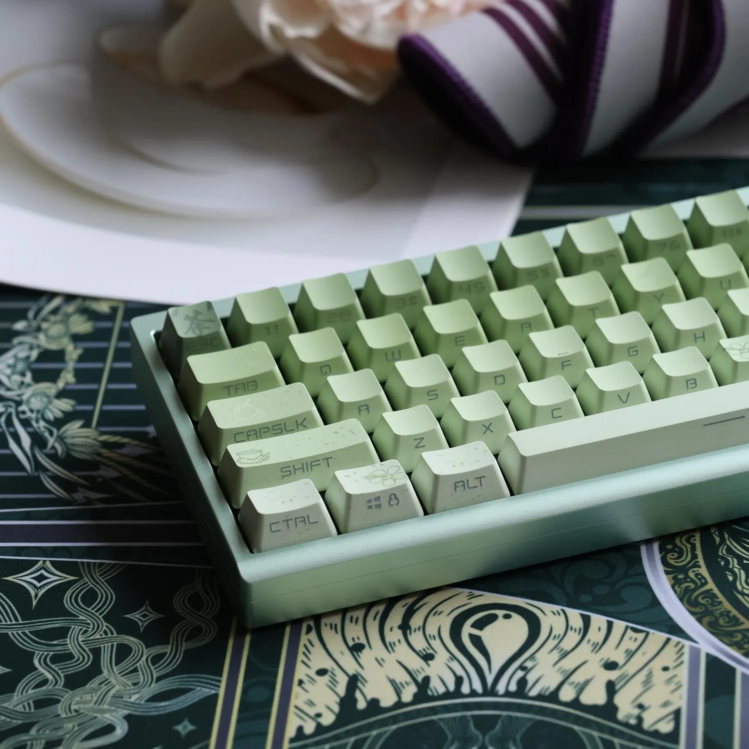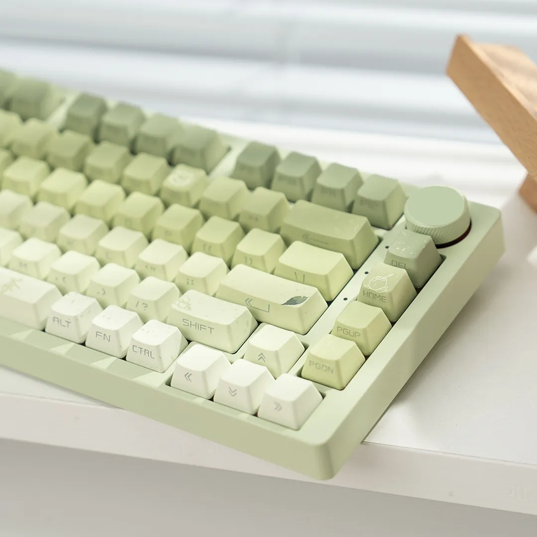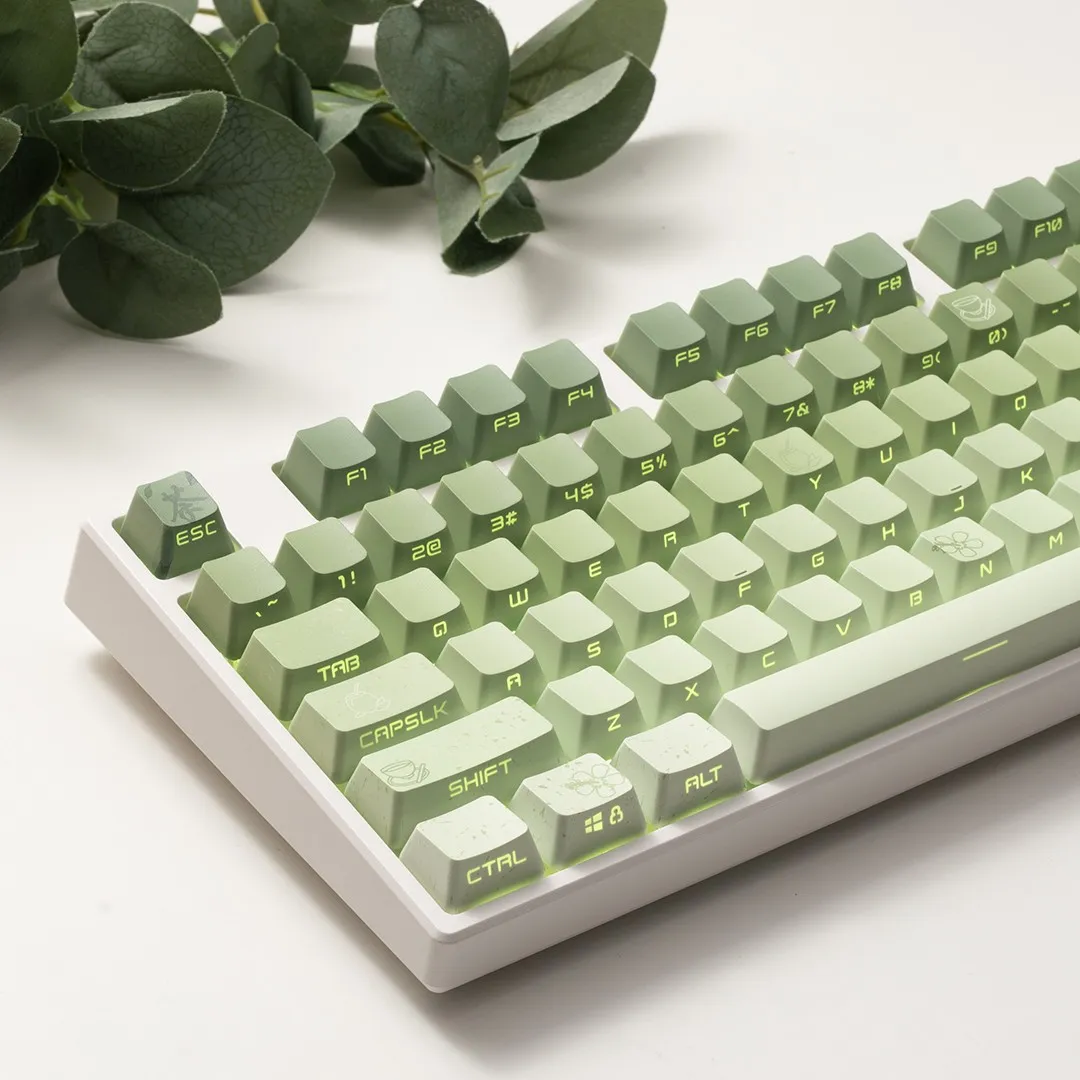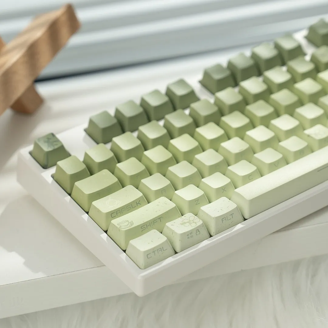 Upgrade your keyboard with this gorgeous OEM Matcha Green Keycap Set! With its distinctive gradient design which this gorgeous set effortlessly shifts from a deep green at the top to a calming light green at the bottom. Each keycap adds a beautiful touch to your setup with its lovely side lettering. With adorable symbols of flowers, cups and hand mixers. These keycaps extended lifespan and resilience for daily usage are guaranteed by their crafted by sturdy PBT material. They are perfect for gamers and enthusiasts alike because of the ergonomic comfort provided by the OEM profile. Create a revitalizing typing experience by introducing the soothing fragrance of matcha into your office right now!