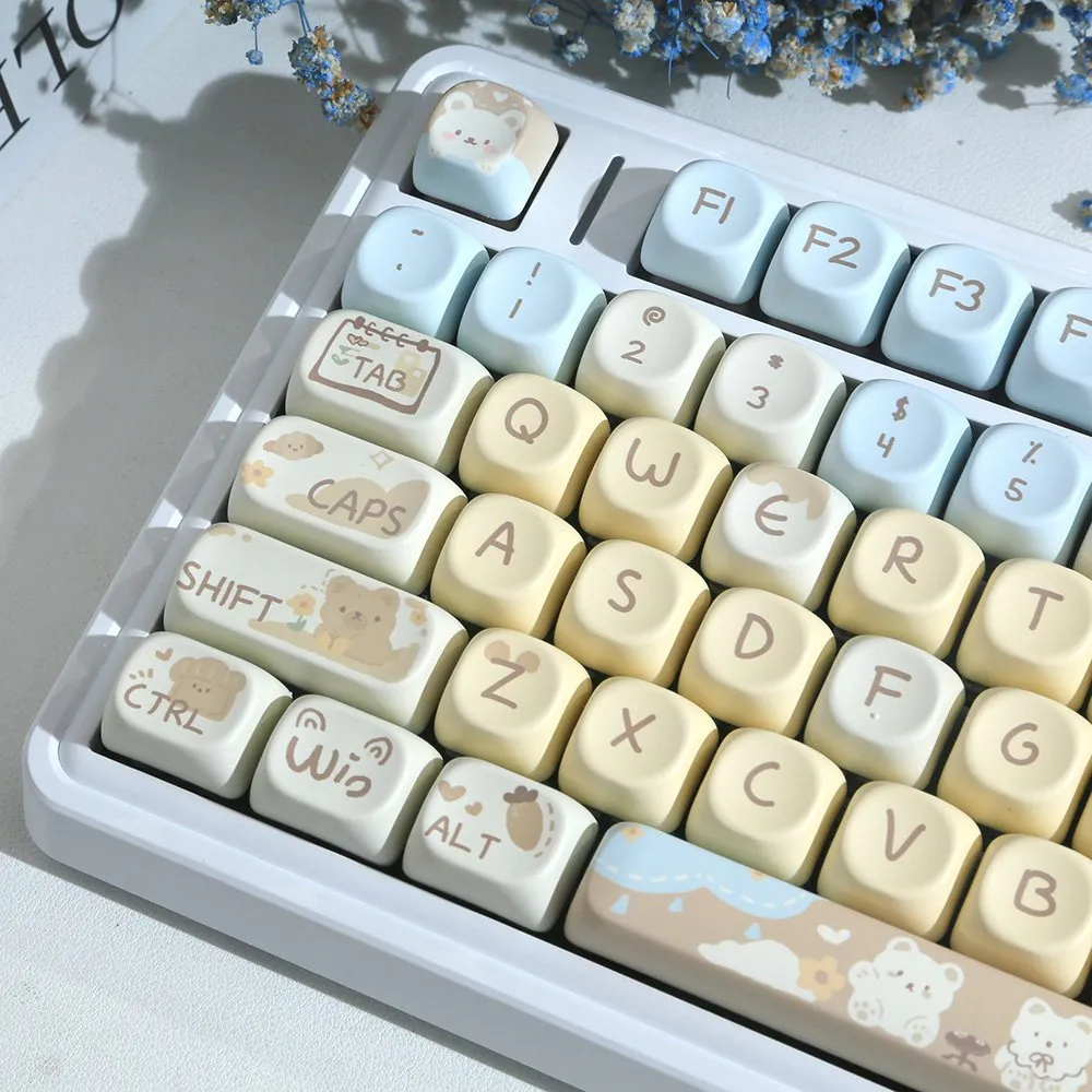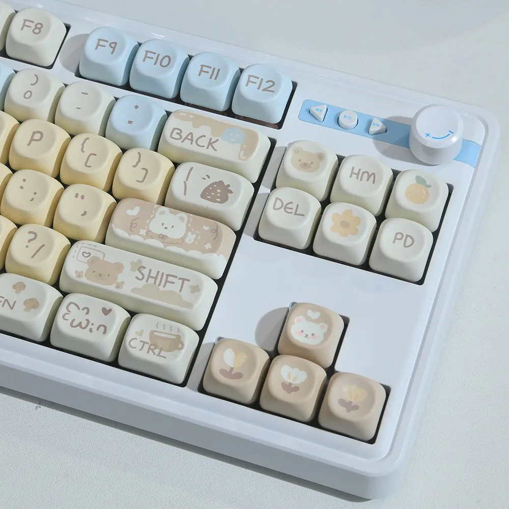 Delight in the charm of the Milk Tea Bear LS01 Tri-Mode Mechanical Keyboard! This cute keyboard has a lovely mix of pale orange, beige, brown and blue keycaps. That make it look cozy and welcoming design. Red, Blue, Peach and eight other switch options allow you to customize your typing experience. A adorable bear icon design adds a whimsical touch to the Space Key. Icons of flowers and bears adorn the directional keys which adding to the whimsical vibe. Every keystroke on this keyboard combines a delightful design with long-lasting quality. Which thanks to its durable PBT construction and brown lettering in a distinctive font style.