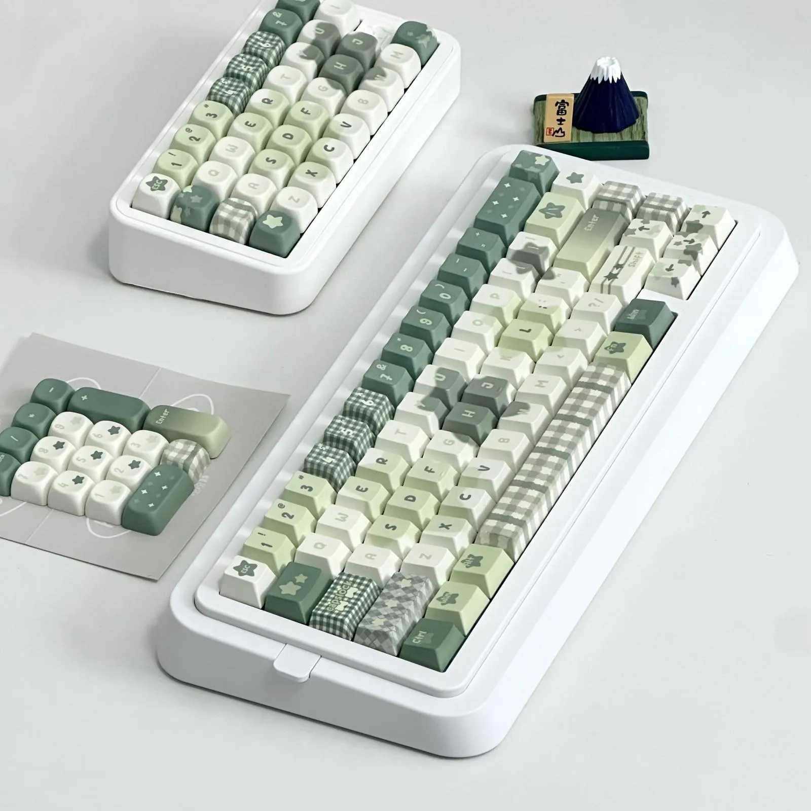 Transform your typing experience with the Mint Star Series Keycap Set! The beautiful mix of white, green and mint keycaps in this alluring assortment will liven up any keyboard. The green series gives your setup a new look by showcasing white letters in a distinctive font style. To improve their aesthetic appeal with some keycaps even feature a lovely lattice design. For those who enjoy a little flair that the fanciful star emblem on the ESC key makes it stand out. These keycaps crafted by sturdy PBT material which guarantees their durability. This set is perfect for anyone wishing to add style to their workstation. Because it comes with both Cherry Profile and MOA choices!