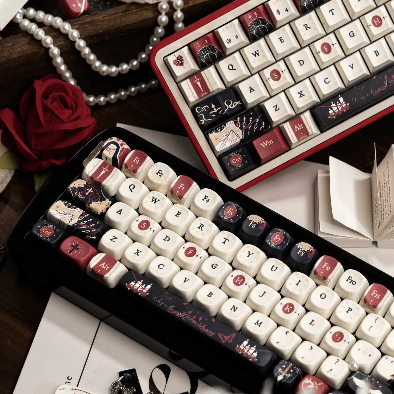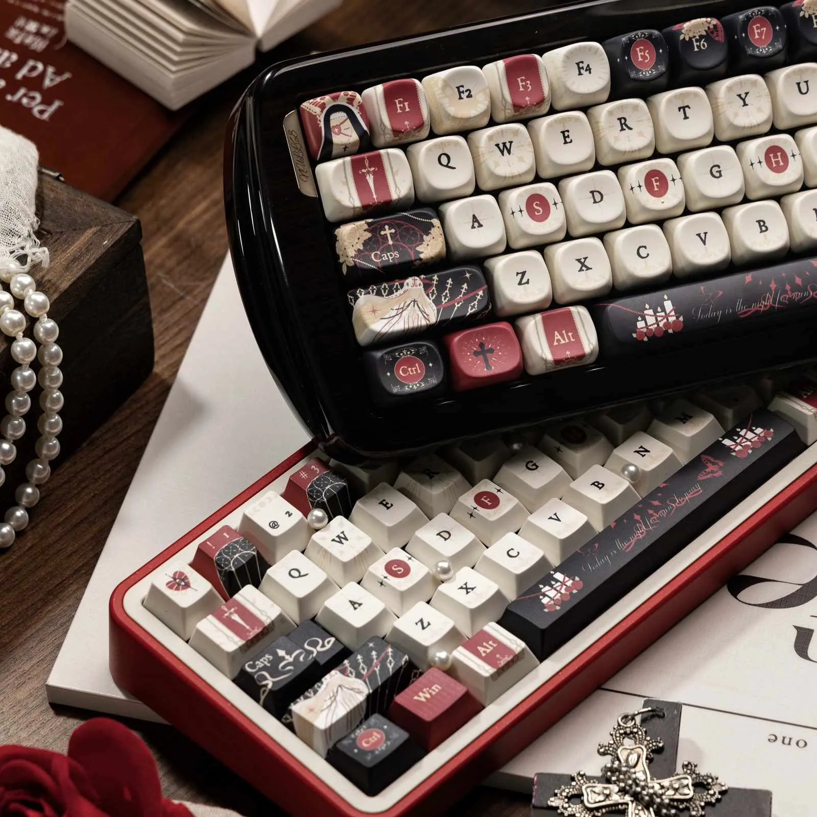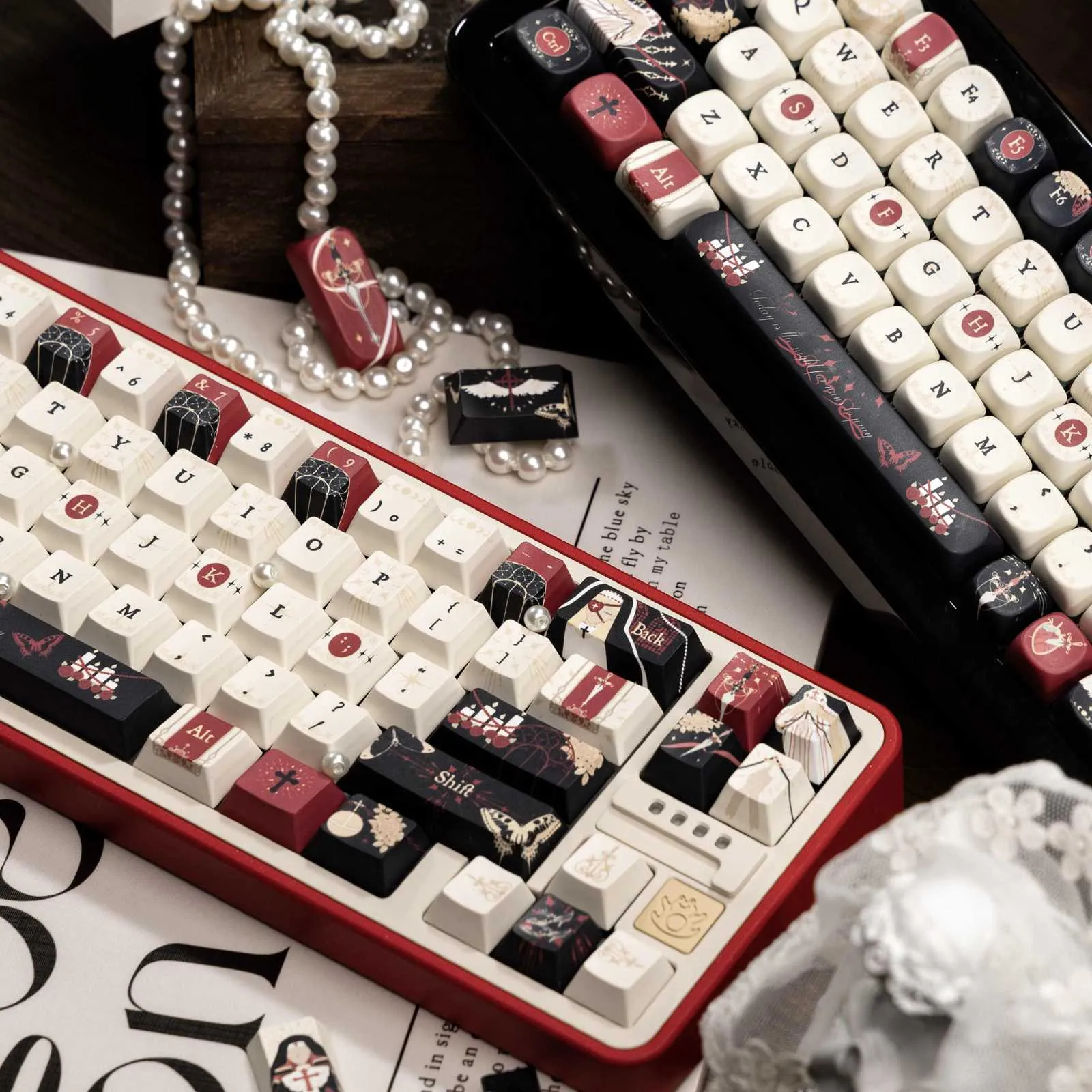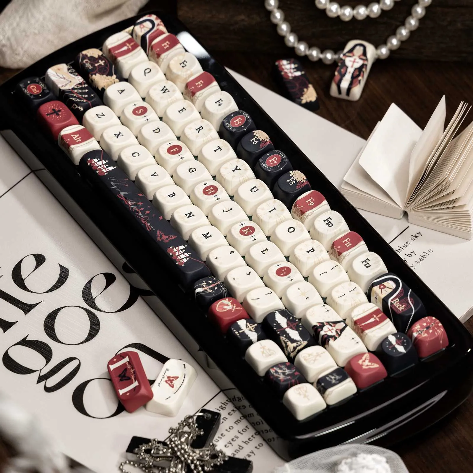 Introducing the captivating Nun’s Prayer Night Series Keycap Set that you may enhance your keyboard. Red and black keycaps are used to highlight a striking white base. That display in both the Cherry Keycap Set and the SOA Keycap Set. Your typing experience is given a traditional touch with the bold black and white lettering. Elegant candle symbols decorate the Enter Key and Space Key that adding to the overall appeal. While the Backspace Key features a nun icon design. These keycaps are long-lasting and stylish because they are made of sturdy PBT in Cherry and SOA profiles. Use this special collection to turn your keyboard into a lovely homage to peace and religion!
