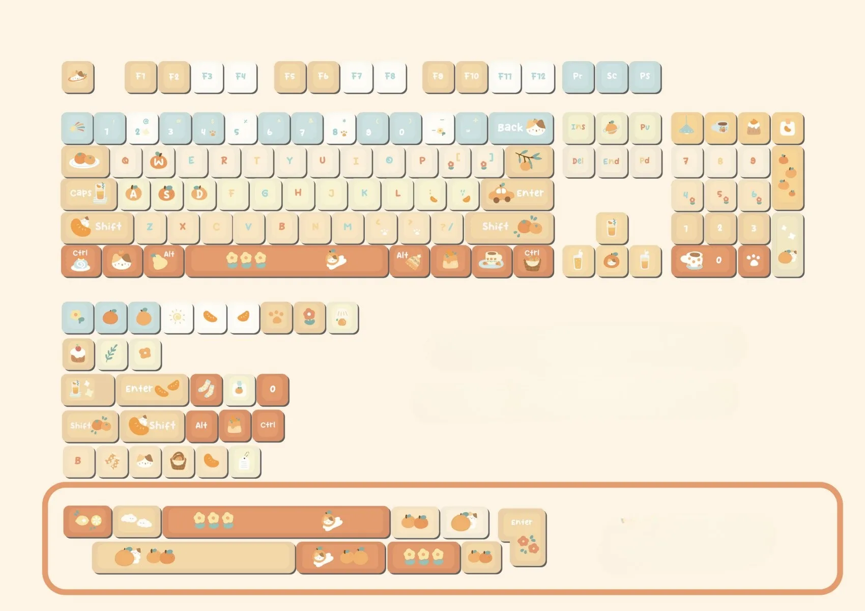 Showcasing the cool Orange Soda XOA Keycap Set! Keycap Set and Supplement Keycap Set are the two options available in this wonderful collection. So you may select the one that best suits your needs. The set’s eye-catching orange series, white and blue keycaps provide your keyboard a vivid feel. Their visual attractiveness is enhanced by distinctive font styles in orange, blue and white lettering. The Enter key has a colorful orange automobile icon. While the backspace key has a lovely cat icon. Playful decorations such as an animal paw emblem and a drinking glass are adorn directional keys. This set which is made of sturdy PBT material. That is ideal for giving your workstation personality!