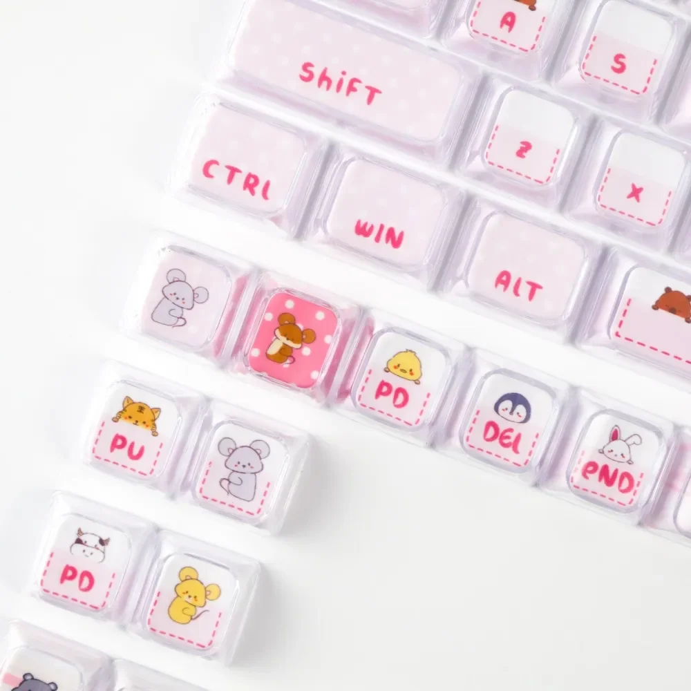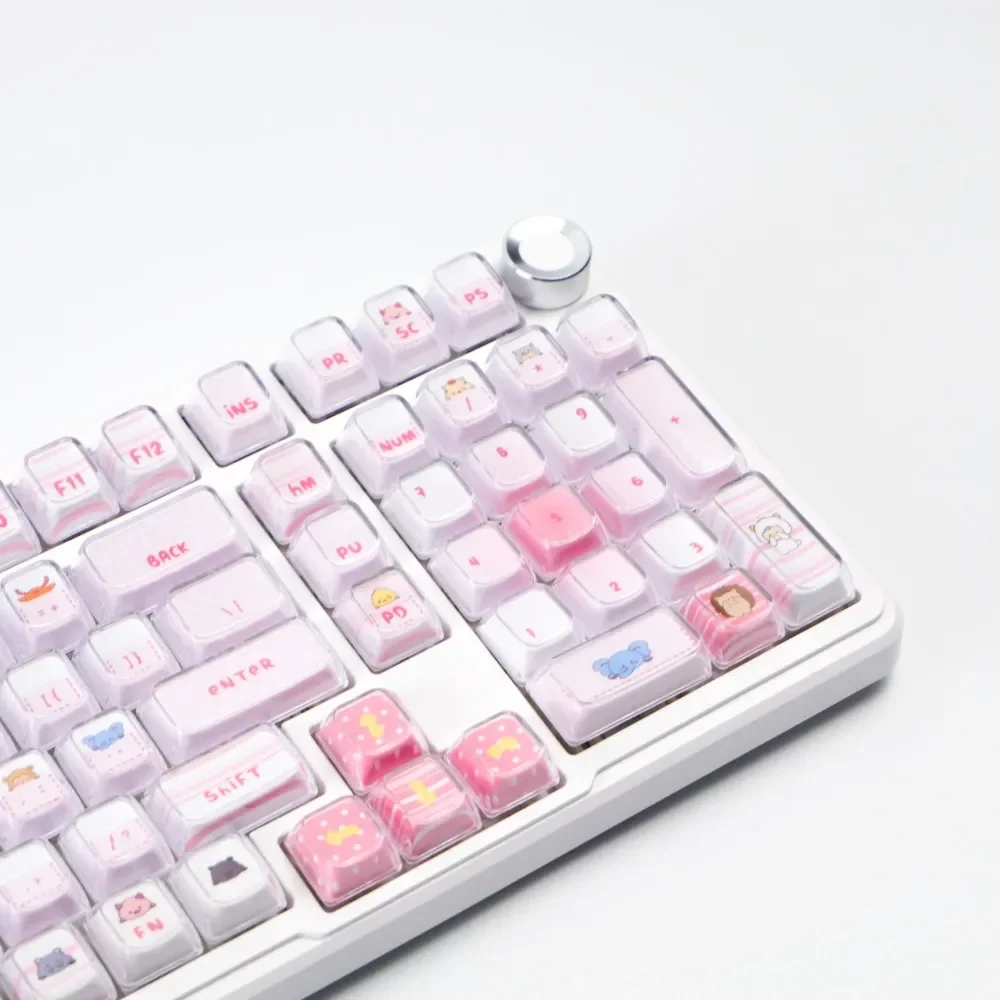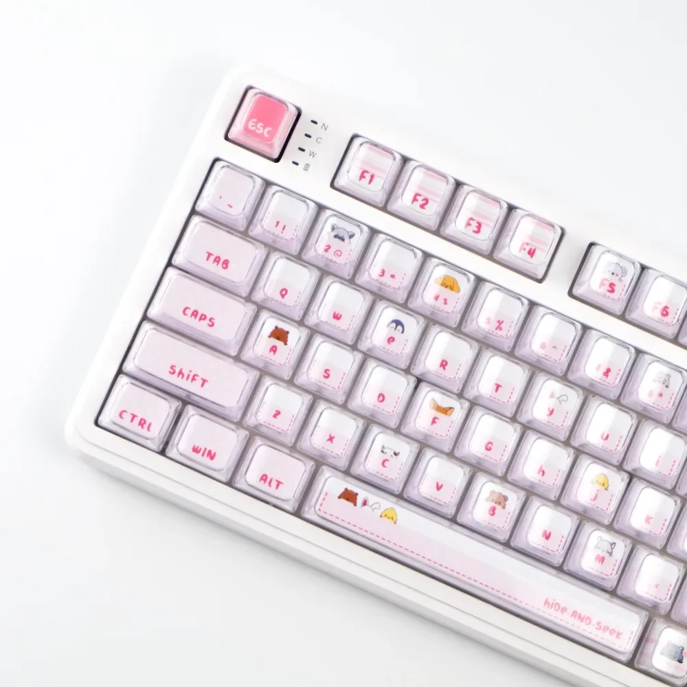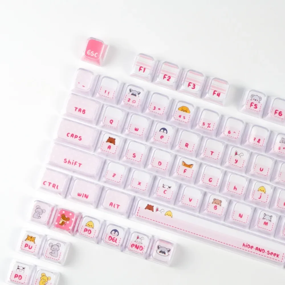 Transform your mechanical keyboard into a canvas of cute magic with our enchanting Peek-a-Boo Pink Cat Cherry Keycap Set. Crafted with a stunning crystal jelly aesthetic, its translucent pink hues invite a playful charm to your desk setup. Each adorable pink cat peeks out from its jelly haven, creating a truly unique accessory. As a high-quality jelly keycap, it offers a smooth touch and vibrant clarity that truly stands out. Its a perfect cute artisan keycap for anyone looking to personalize their space with a touch of fun. Designed for broad appeal, it is Cherry MX compatible, ensuring a seamless fit for most mechanical keyboards. The vibrant design is brought to life using the advanced dye-sub keycap process, guaranteeing long-lasting color and intricate detail that wont fade. Elevate your typing experience and infuse your daily routine with a dose of pure joy with this charming addition.