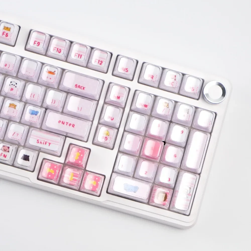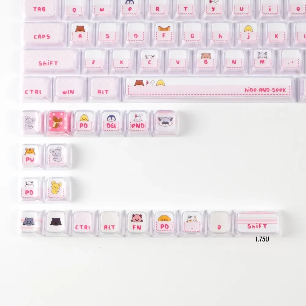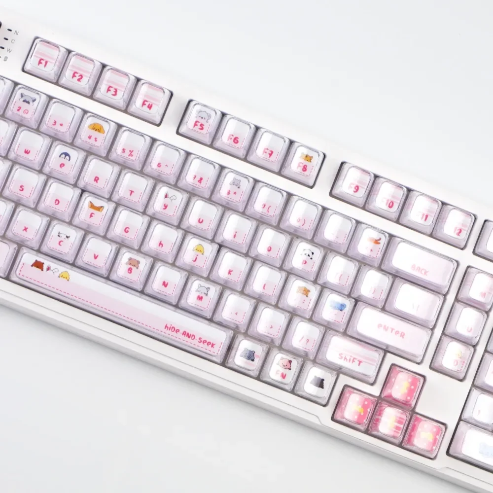 Sweet pink cat keycap set, a playful peek-a-boo design with a whimsical crystal jelly finish for mechanical keyboards.