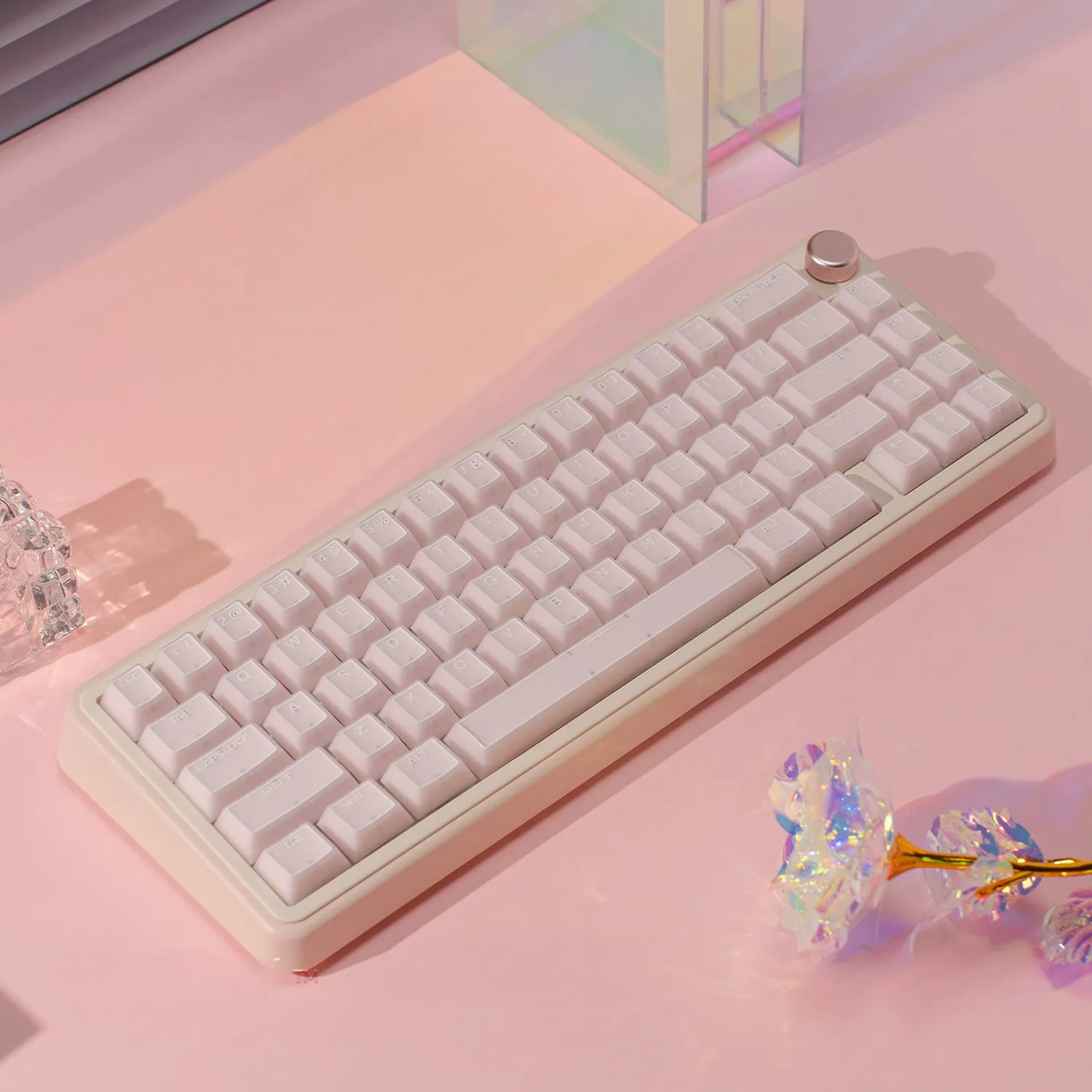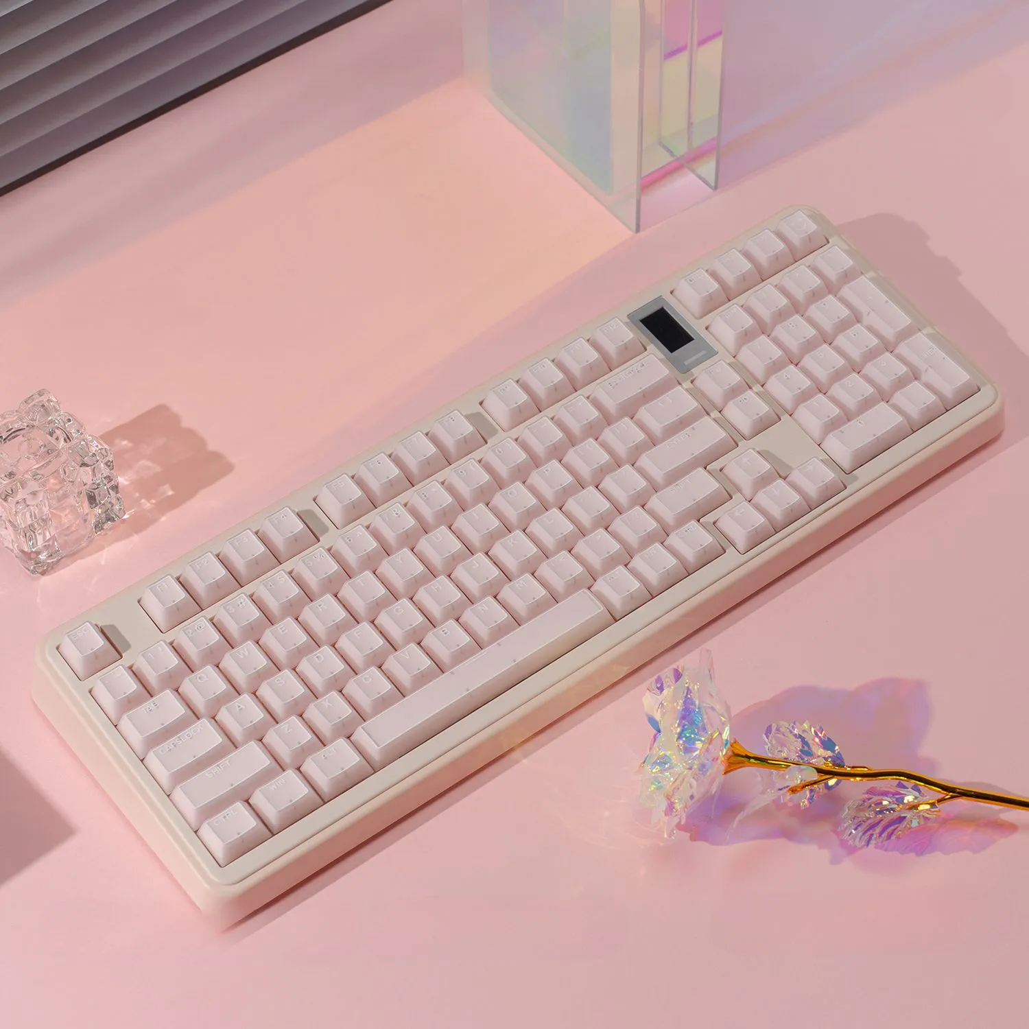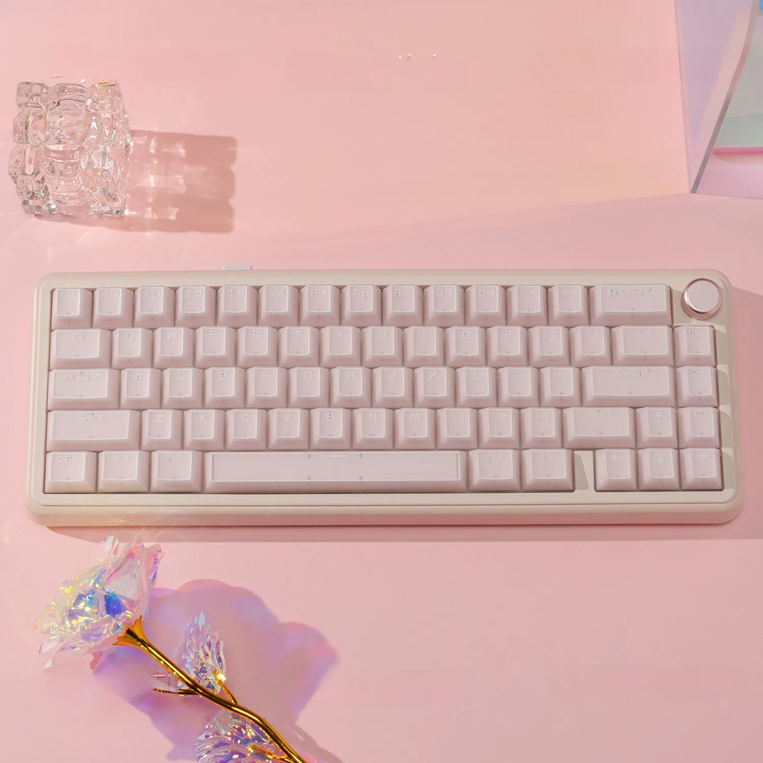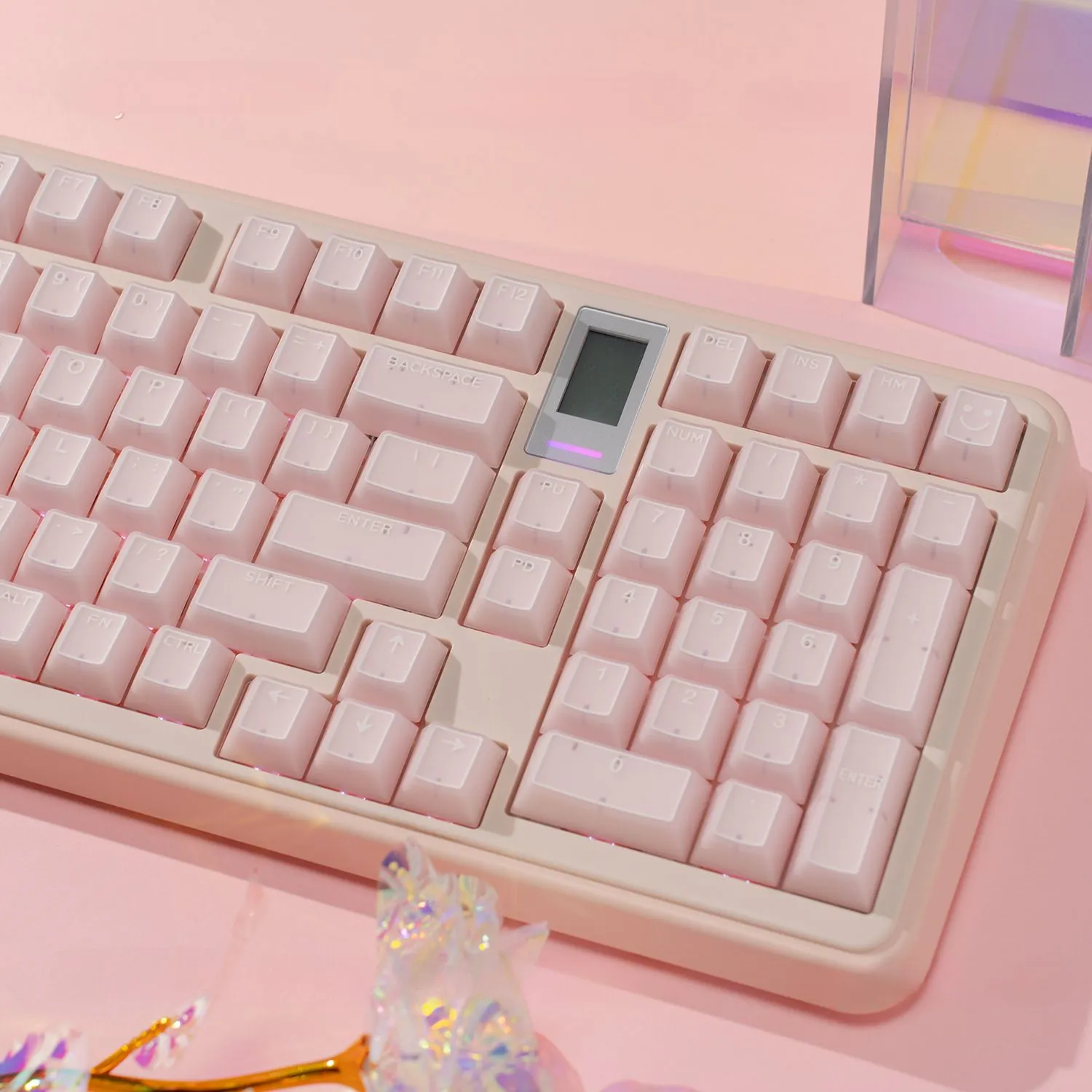 Utilize the gorgeous Pink Jade Prism Cherry Minimal Keycap Set to enhance your typing experience! This gorgeous pair of full pink keycaps with a sophisticated outline design. That is ideal for giving your mechanical keyboard a little extra personality. Both the portable OMO60 and the OMO100 keyboard models are compatible with the switch type of your choice. Choose the sensitive Snow Step Switch for accuracy or the silky Yingluo Switch for a pleasant feel. Additionally, some keycaps feature icons for amusing expressions. Which give your setup personality. With its iconic Cherry profile and sturdy ABS and PC materials construction. That this keycap set simply combines flair with functionality!