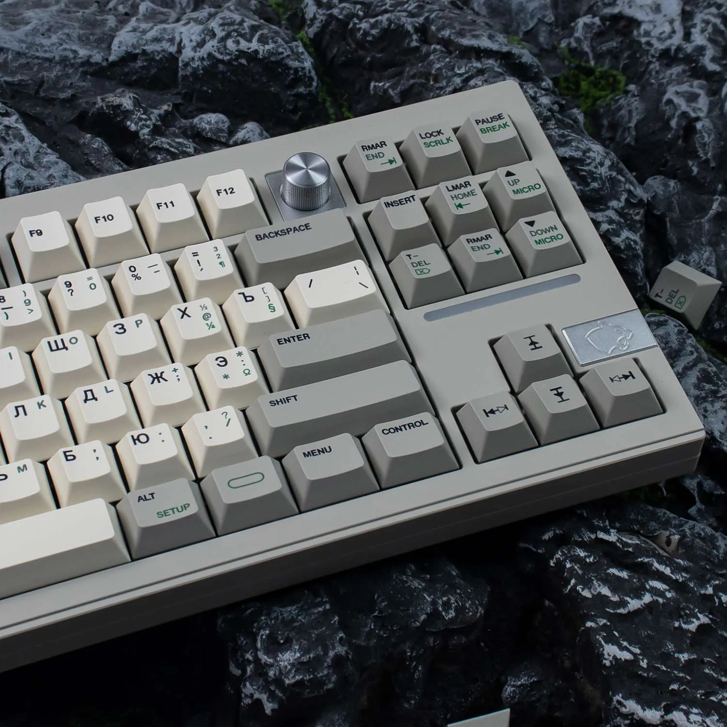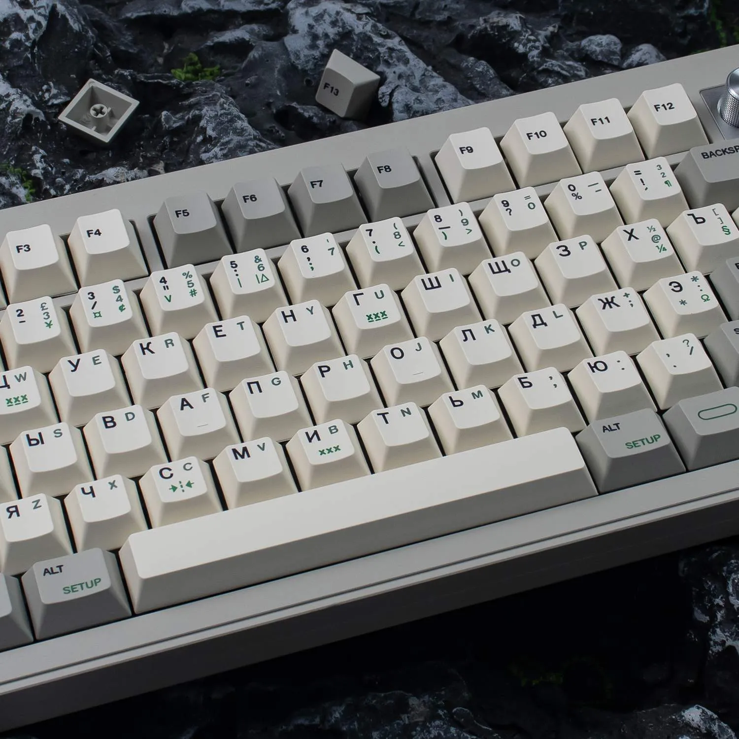 Utilize the Retro Nostalgic Russian Cherry Keycap Set to change the look of your keyboard! This distinctive series has a timeless appearance thanks to its chic grey keycaps and clean white base. Each keycap features eye-catching green and black lettering. That with real Russian words that give your setup a touch of culture. These keycaps are made of sturdy PBT which guarantees their comfort and long-lasting quality. They offer a pleasant typing experience thanks to their comfortable Cherry profile. This keycap set will enhance your keyboard while honoring the beauty of the Russian language. That making it ideal for language fans and people who value vintage aesthetics!