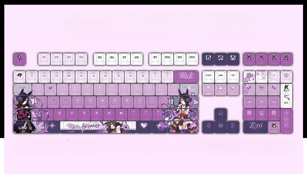 Modify the way you type with the Uma Musume Pretty Derby: Rice Shower OEM Keycap Set and Mechanical Keyboard. Select from 15 possibilities with three different keycap types: opaque, side-lit and front-lit. A keycap set with 122 keys, 87-key keyboard, 108-key keyboard, or tri-mode keyboard are the five options available for each version. The mix of white, grey and purple series keycaps produces a gorgeous look. That is accentuated by distinctive purple lettering. Character icons, such as the ESC key that are present on some keycaps. While the space key prominently displays the word “Rice Shower.” Icons in the shape of hearts add appeal and they are all made of sturdy PBT for longevity and quality!