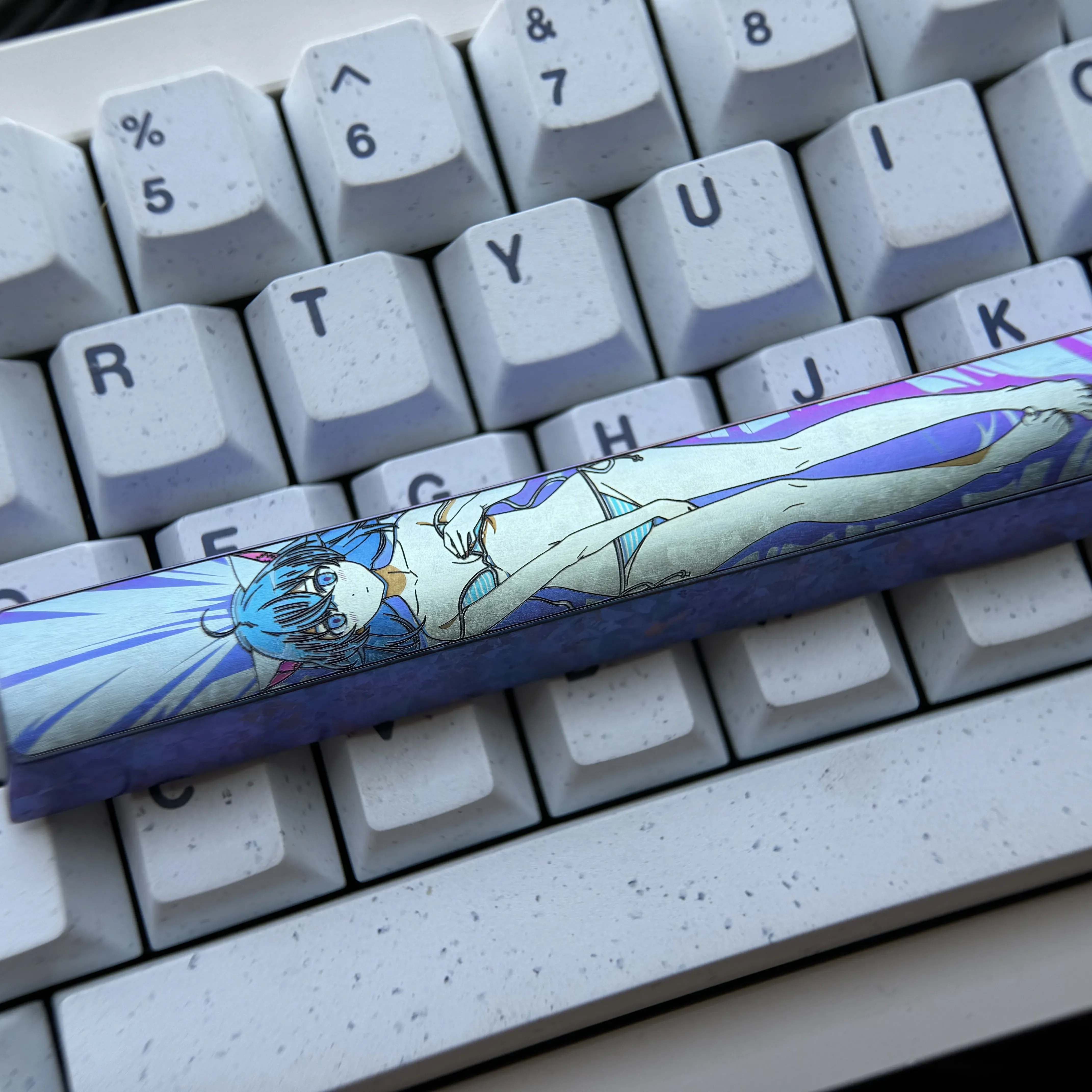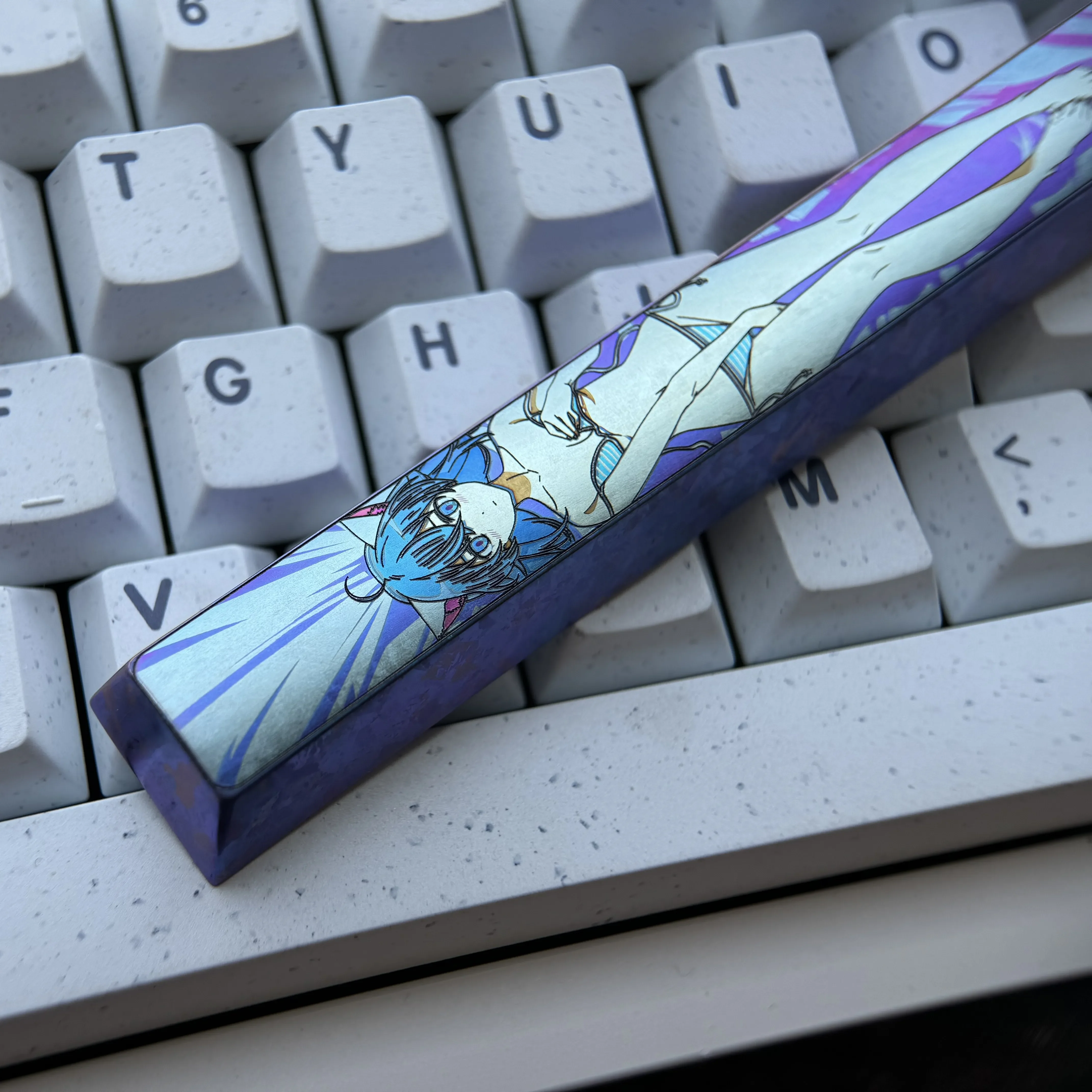 Vibrant Roxy Migurdia anime art on a polished titanium alloy spacebar keycap, showcasing premium craftsmanship for custom keyboards.