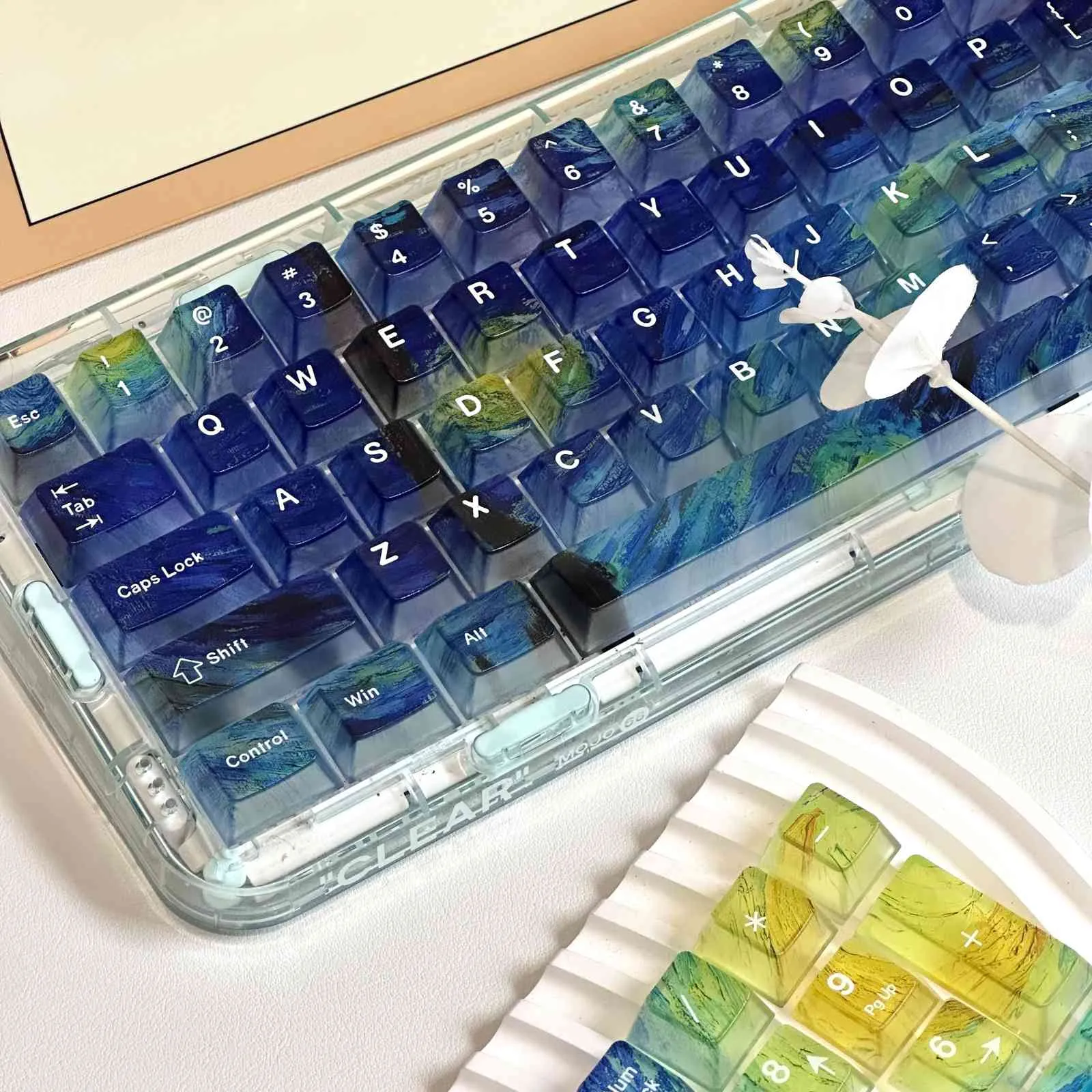 Transform your keyboard with the enchanting Starry Night Sky Cherry Keycap Set! The gorgeous blend of blue and yellow keycaps in this alluring collection. Which is evocative of the glories of a starry night sky. An exquisite paint design adorns each keycap that giving your setup a distinctive flair and creative touch. The vivid colors contrast sharply with the white text which adds flair and utility. This keycap set is made from premium PC material which is long-lasting. That has a cherry profile for maximum comfort. It enhances your workspace and turns every keystroke into an uplifting and joyful experience. That making it ideal for both art fans and keyboard fanatics!